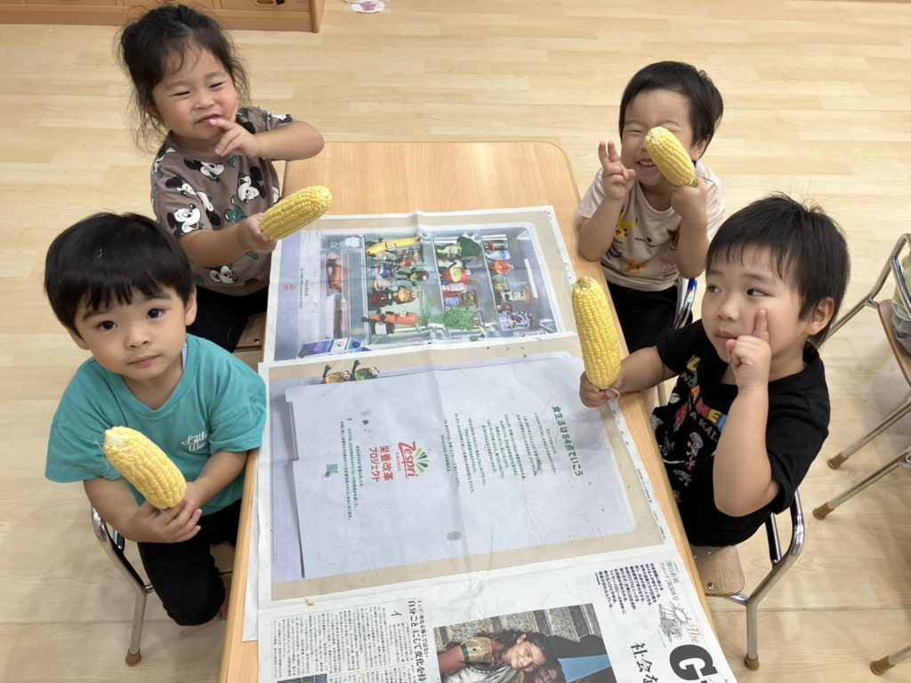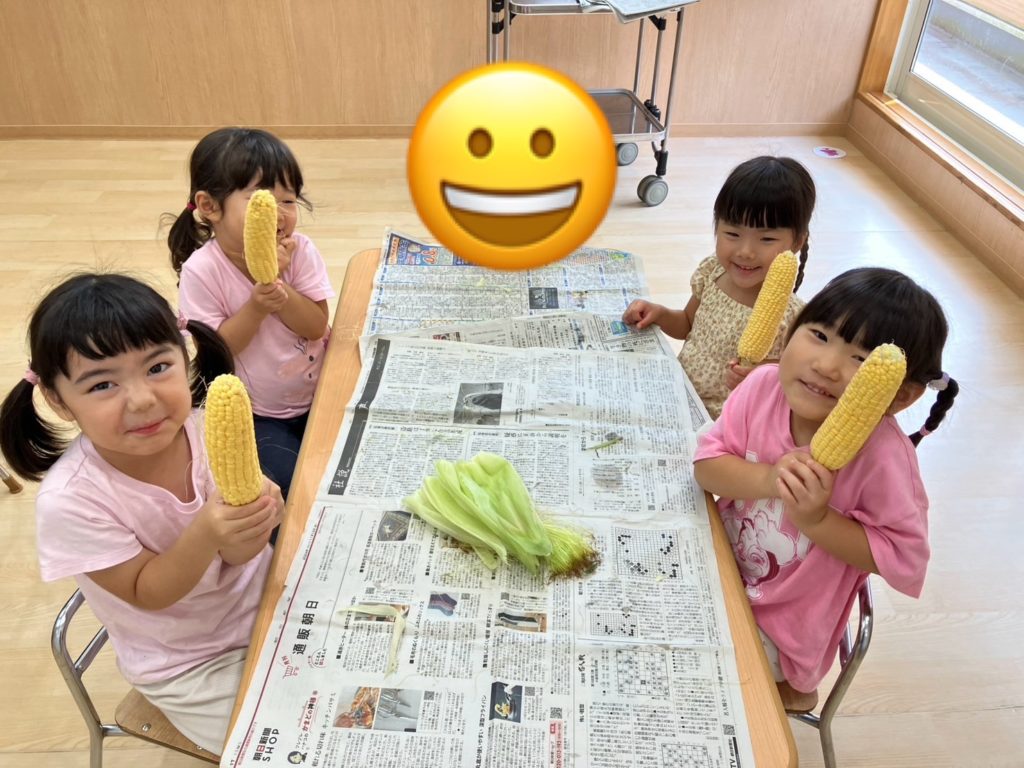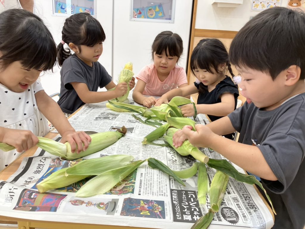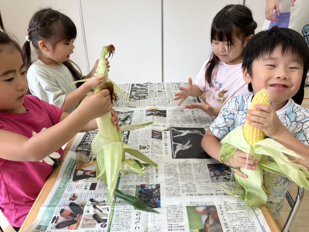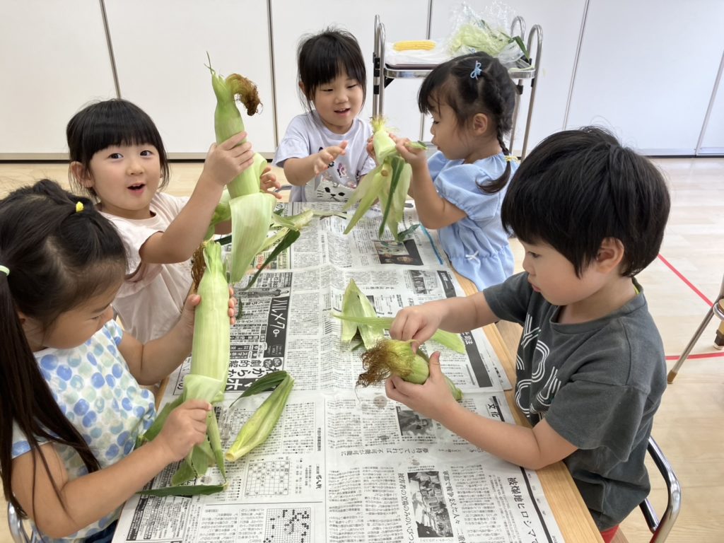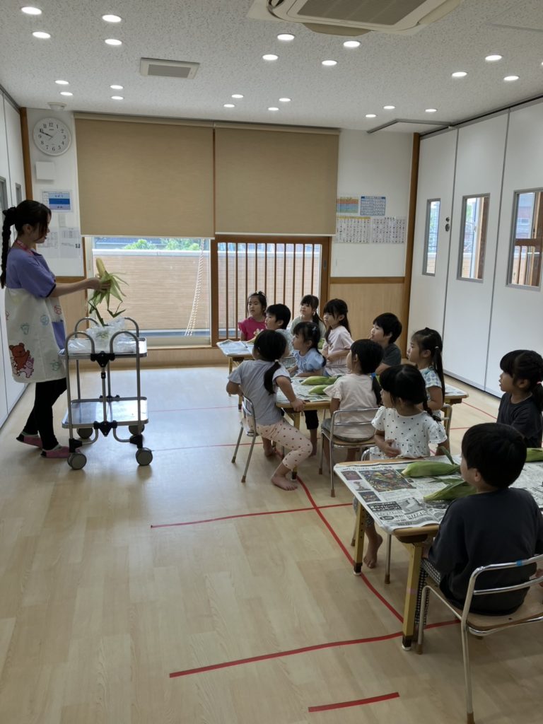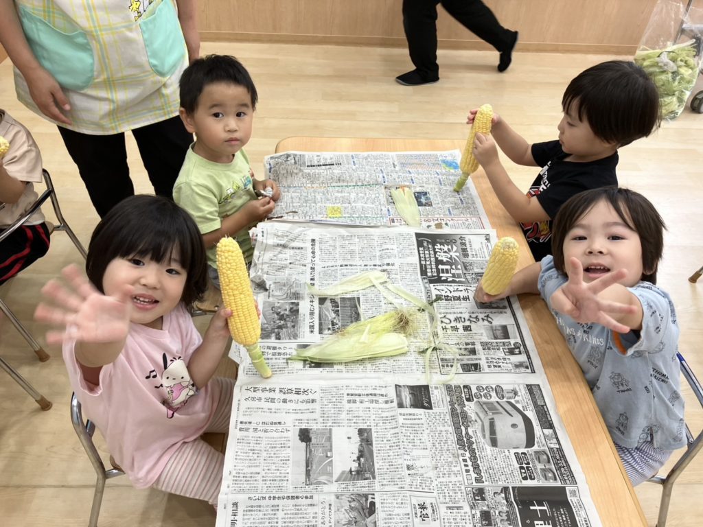 今日は、3歳児と4歳児のお友だちがとうもろこしの皮むきをしました!みんな話をよく聞いて上手にむいてくれていました☺とうもろこしのひげにも「すご~い!」と大喜びしていました☆
