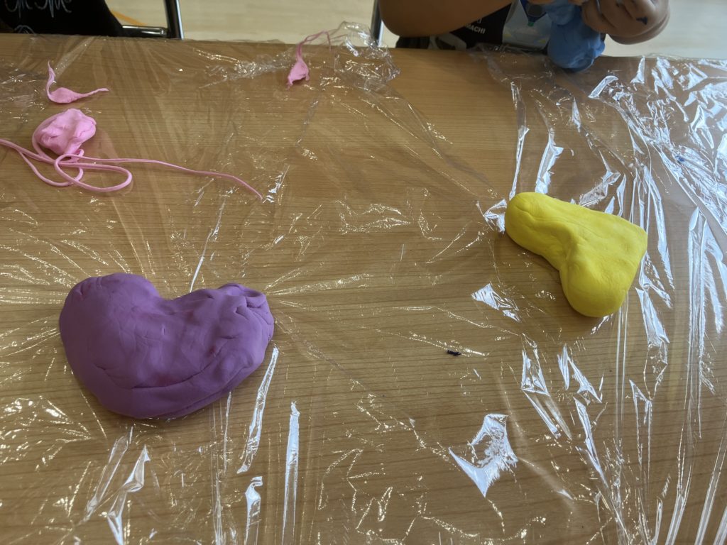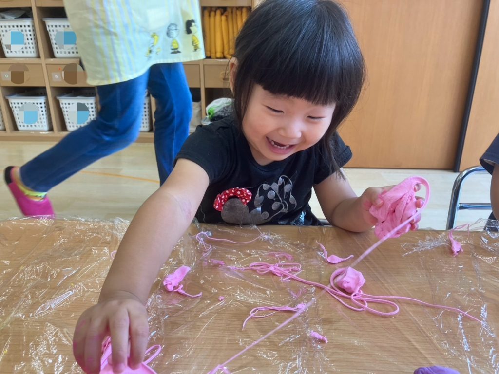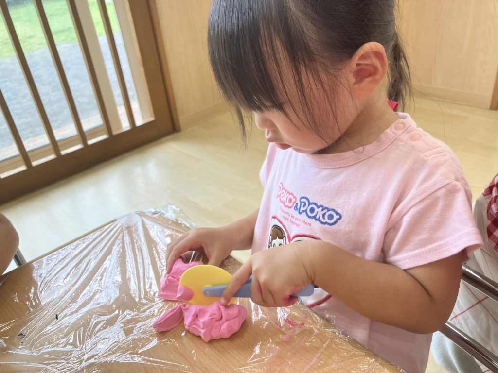 たいよう組では、粘土に色を付けてこねたり、道具を使って様々な形にして遊びました🎵