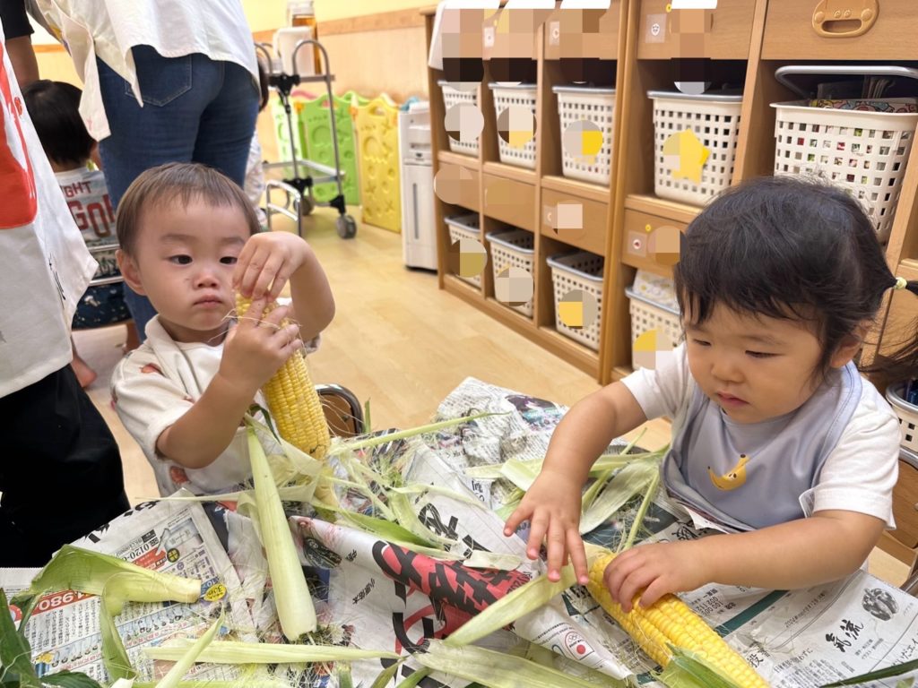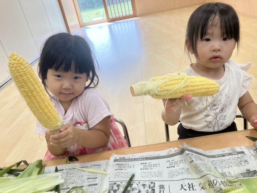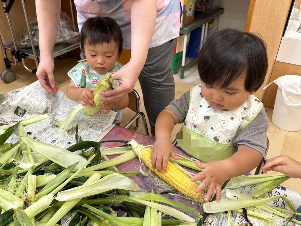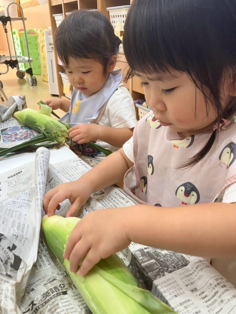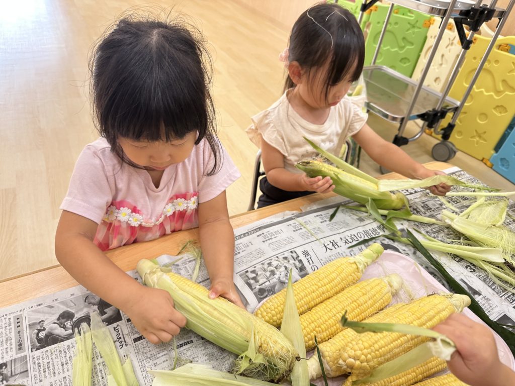今日は、はな組ほし組たいよう組のお友だちがとうもろこしの皮剥きをしました👏🏼
