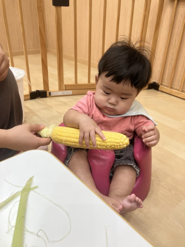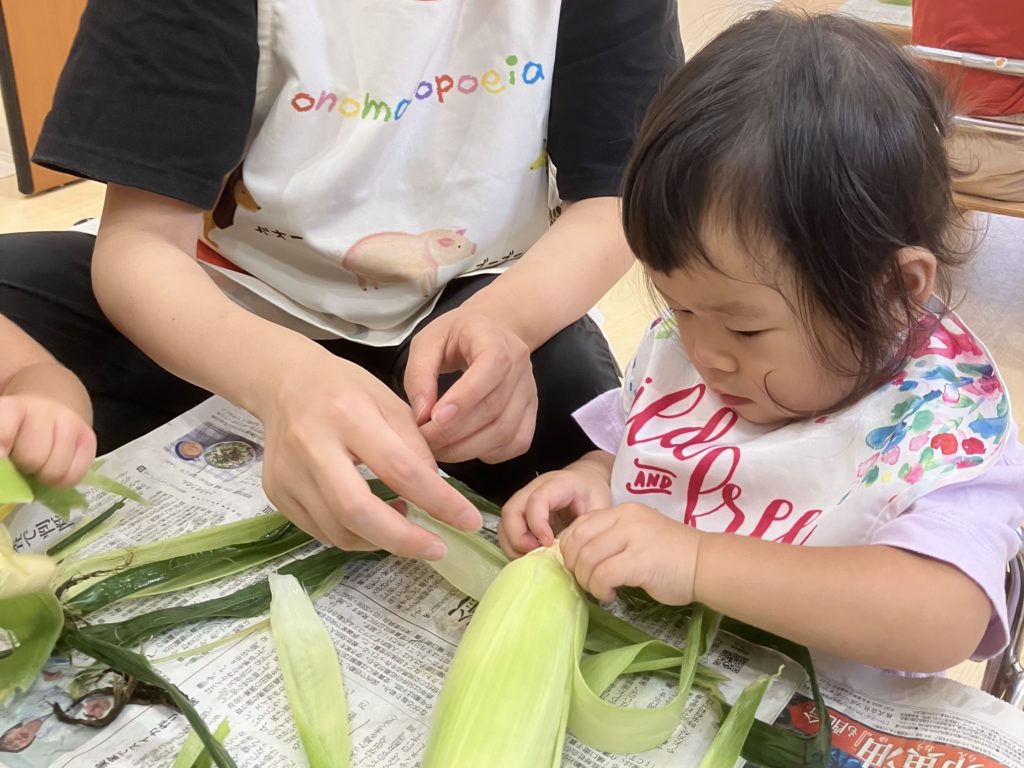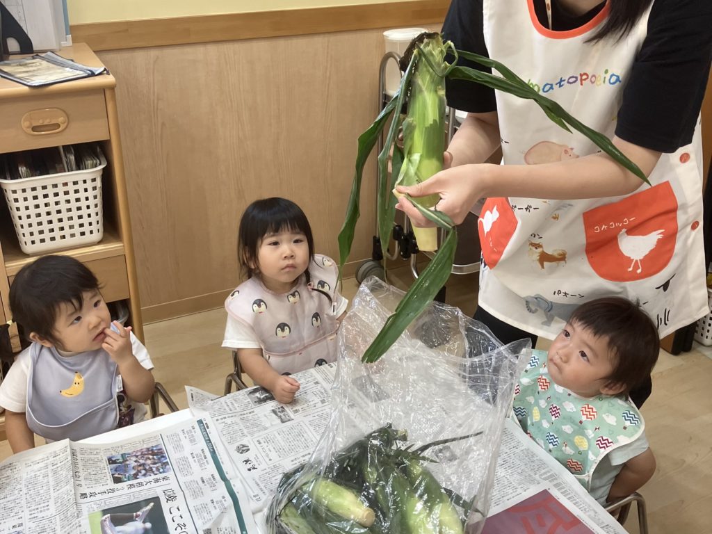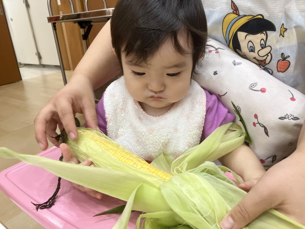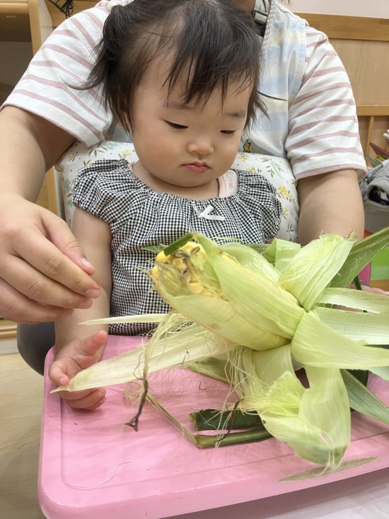 今日は、はな組ほし組たいよう組のお友だちがとうもろこしの皮剥きをしました👏🏼