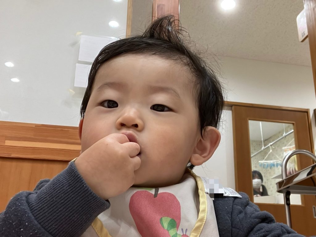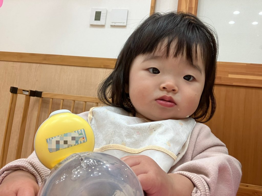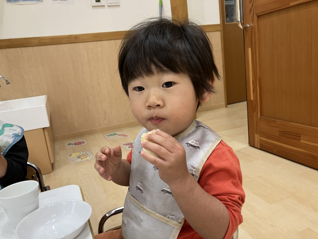 蒸しパンの中に入っているりんごを見つけると、「見てー!」と嬉しそうでした😸