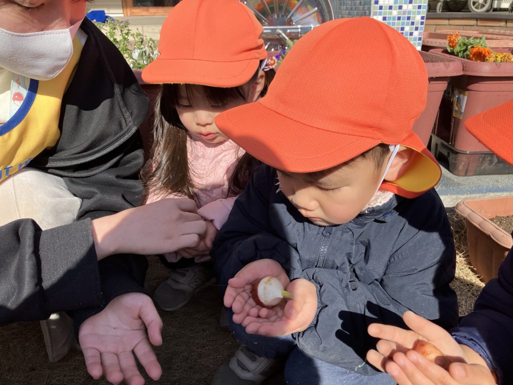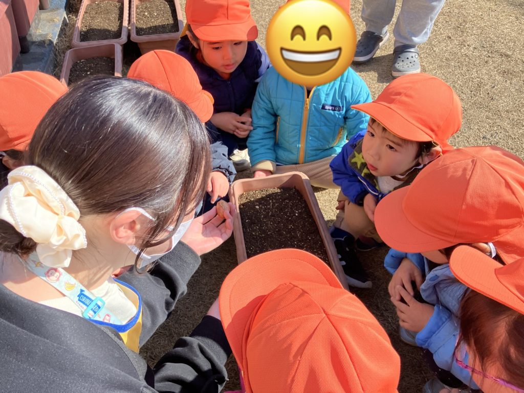 球根を渡すと、これがお花になるの?と不思議そうな子どもたち👀