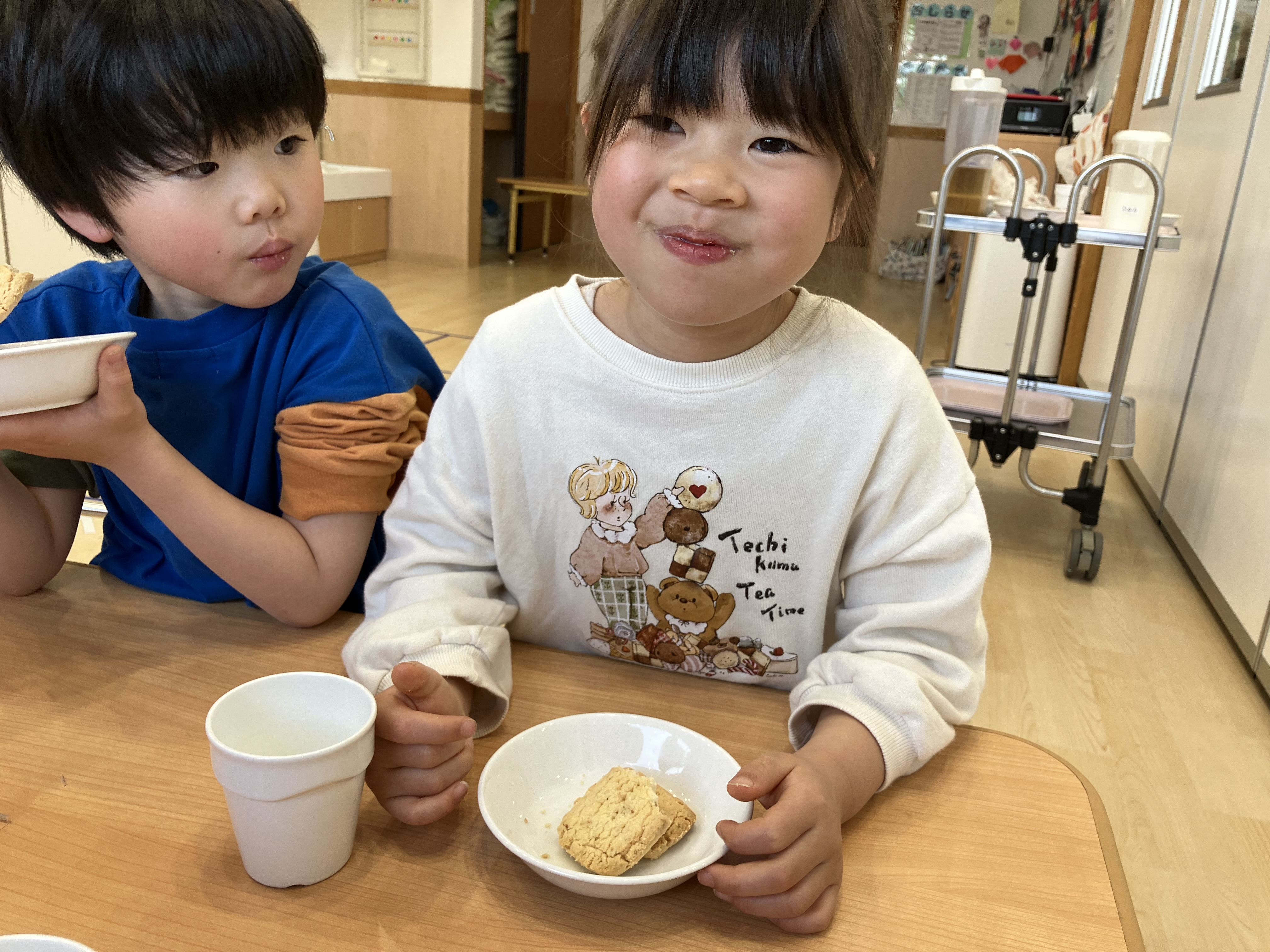 今日のおやつはクッキーでした! 大きな口で頬張って、「美味しいね♫」とニコニコなひかり組のお友だち😸 「おかわりくーだーさい!」と元気いっぱいな声がお部屋に響いていました🌈