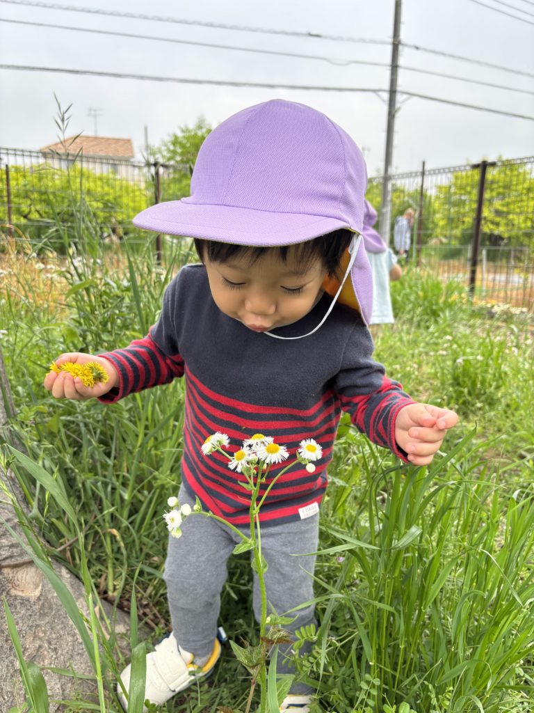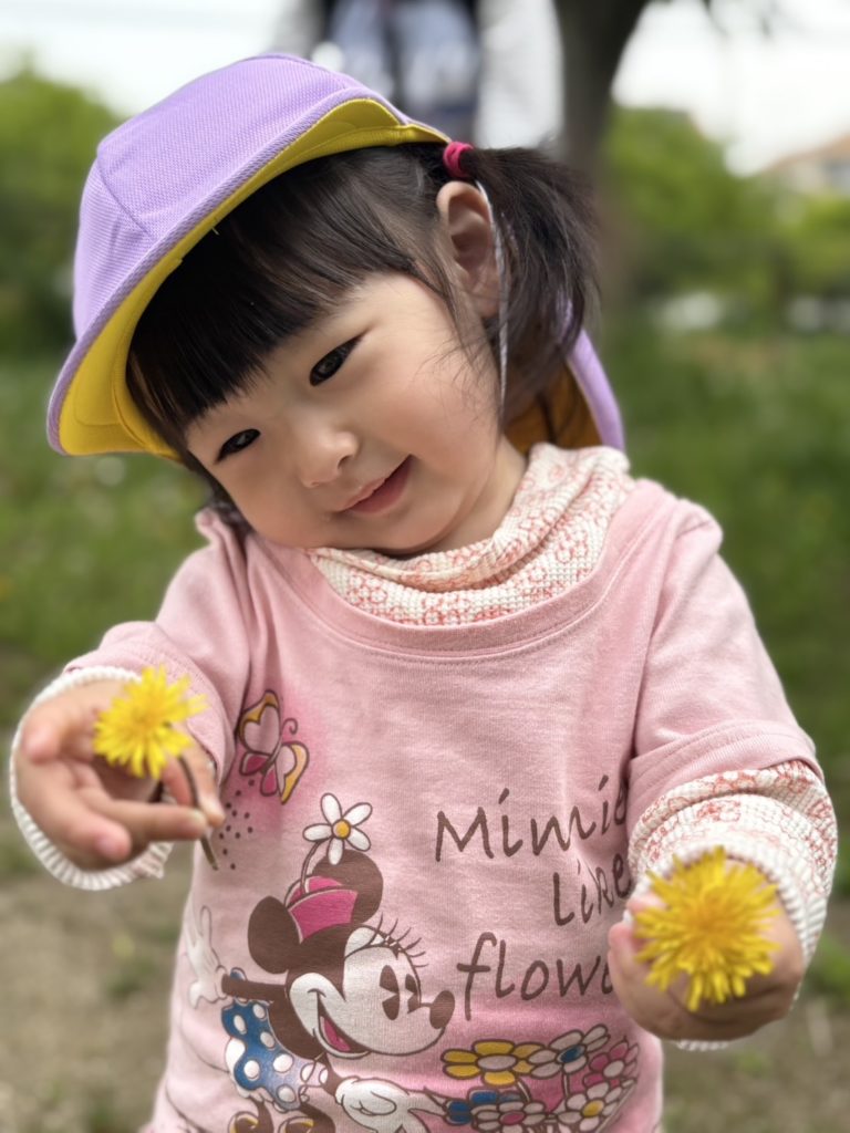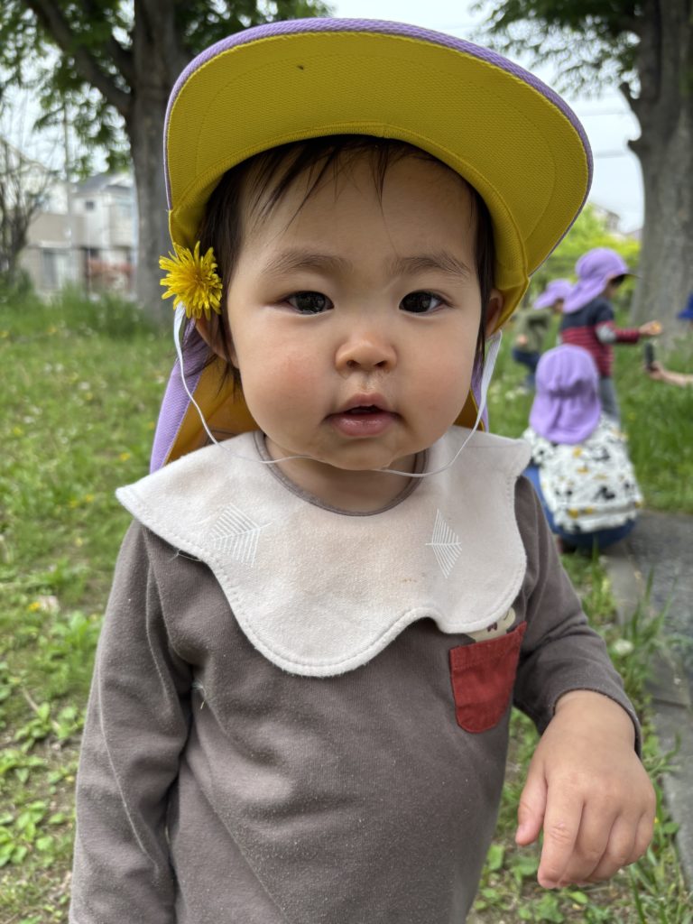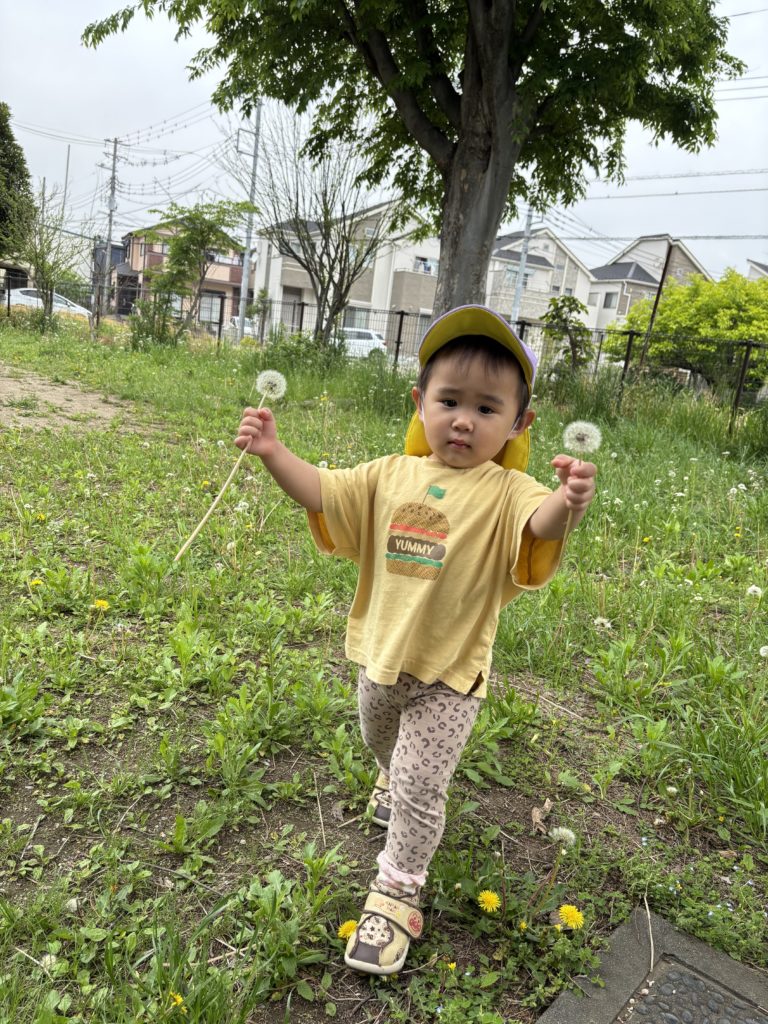 そして今日は白山公園にいきました!公園につくとたんぽぽがいっぱい!綿毛を探してふぅ〜と吹いてみたり、たんぽぽをたくさん積んでみたりと楽しみました!