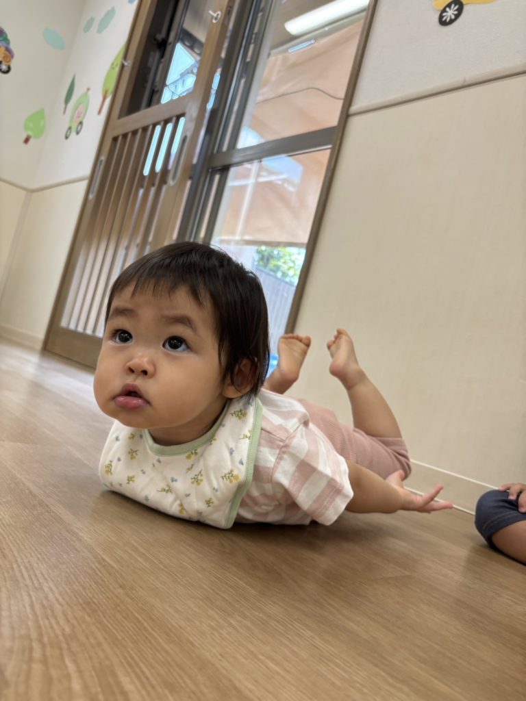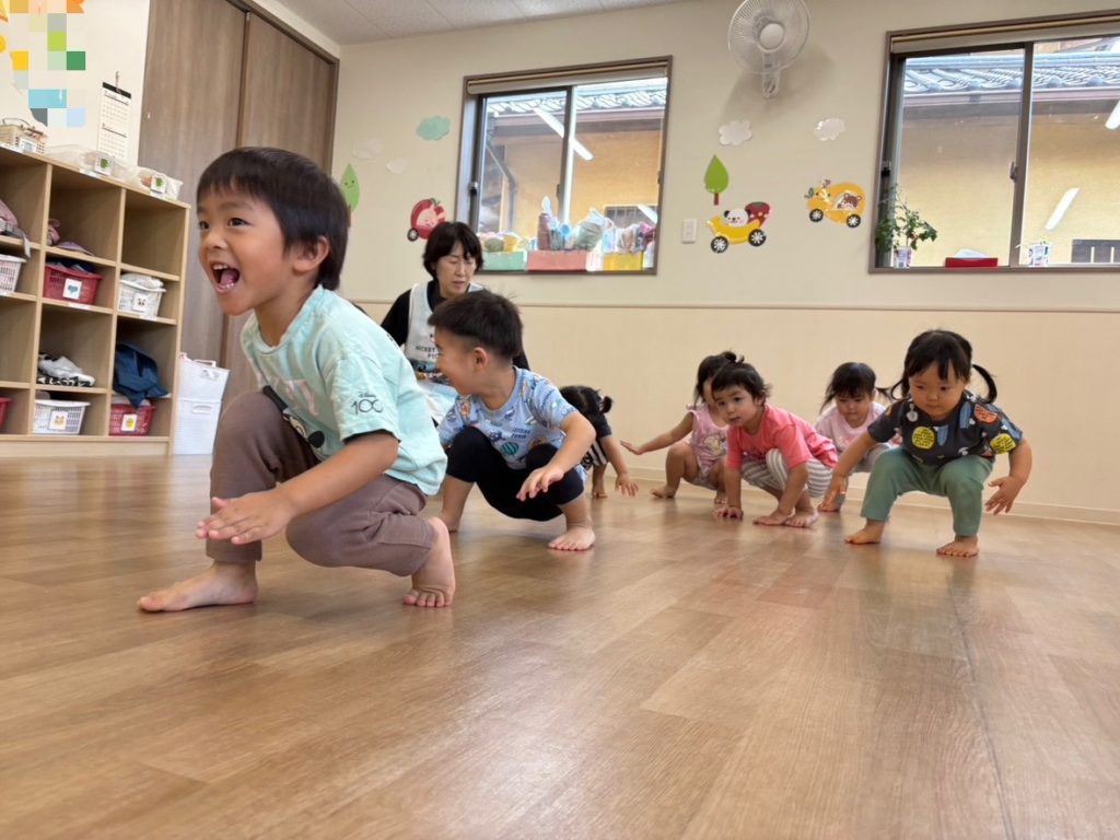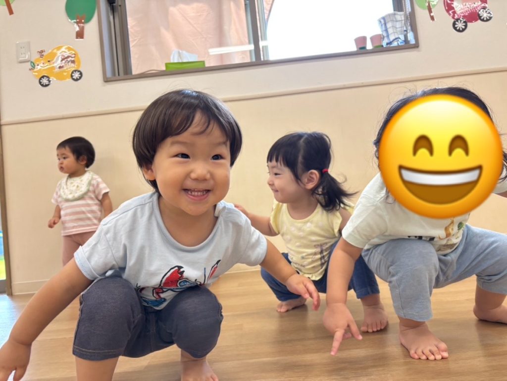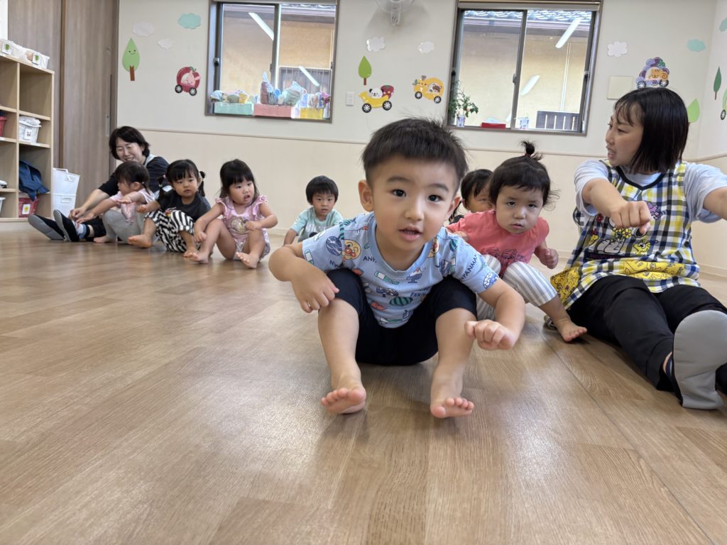 今日もとても気温が高かったので、室内で久しぶりにリズムを行いました!曲をきいて何をやるかを覚えているお友達もいましたよ👏たくさん体を動かし楽しみました!