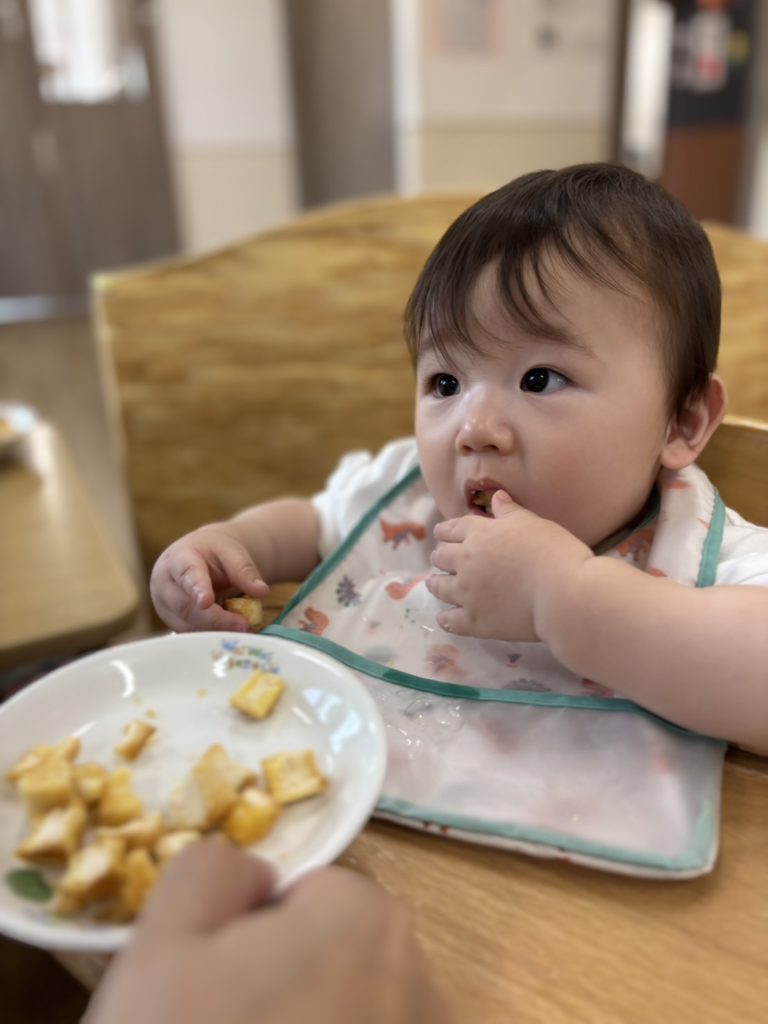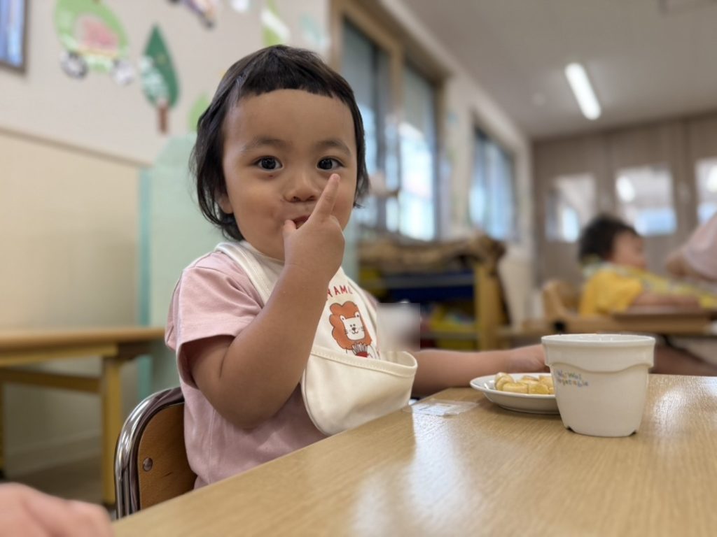 エプロンを自分でつけて、お歌をうたって「いただきまーす」!!
