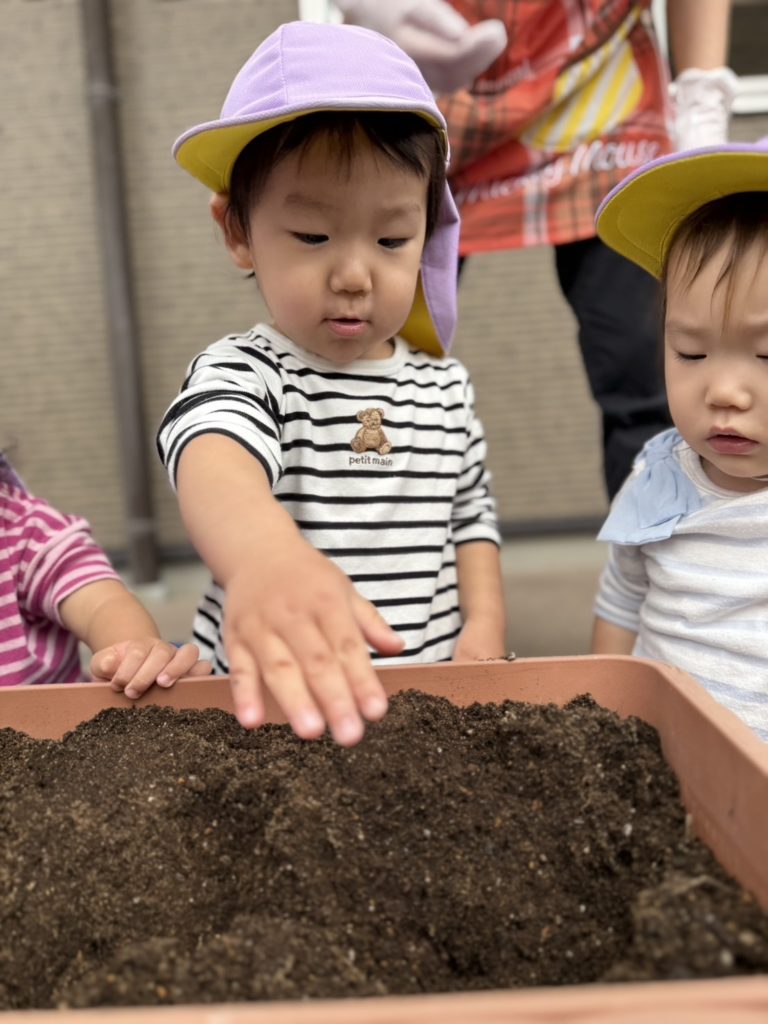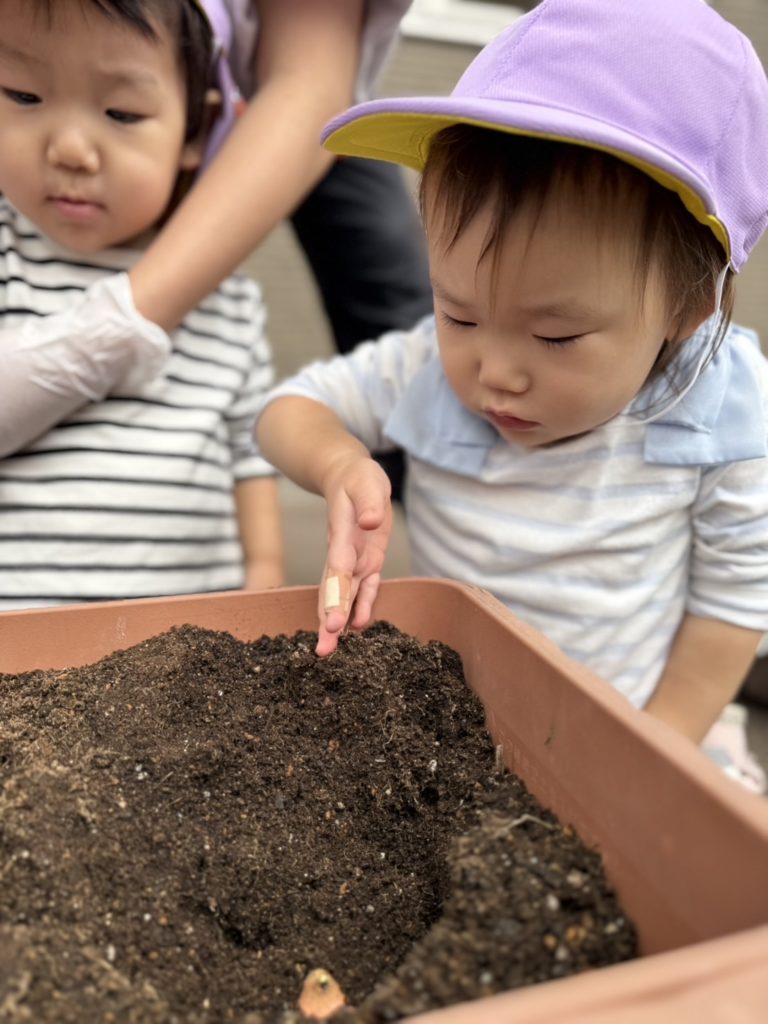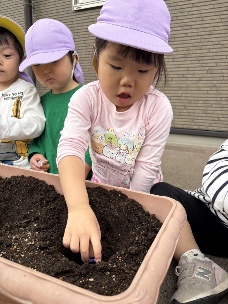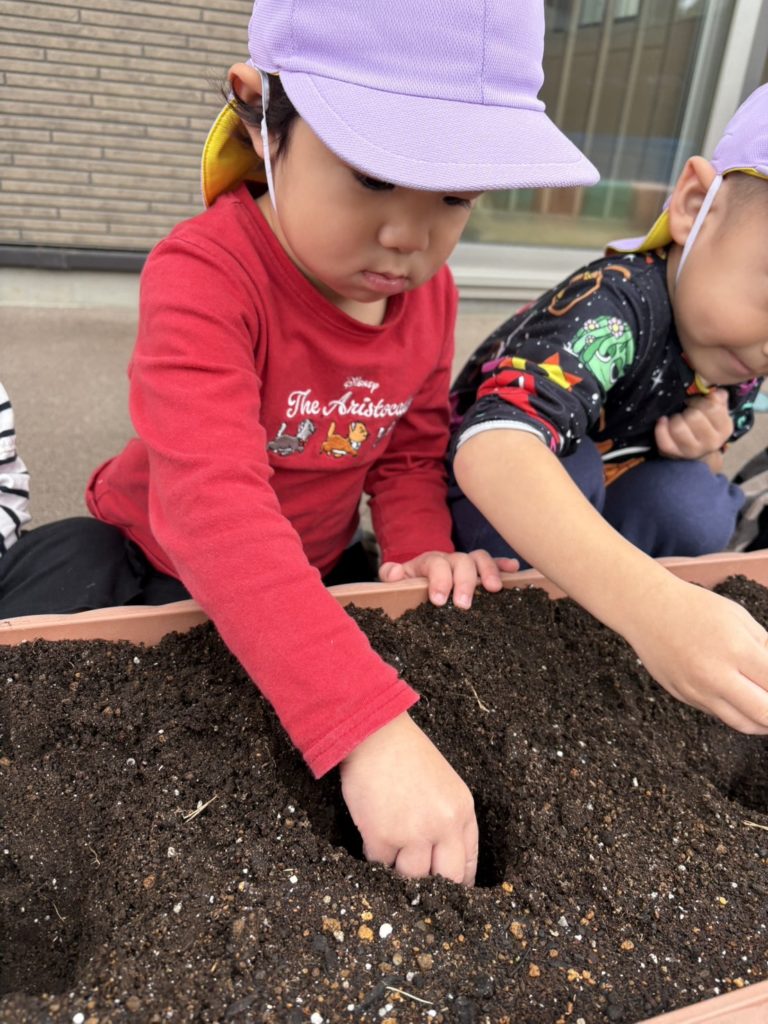 おおきくな〜れ!とおまじないをかけながら、真剣に植える子どもたち☺️