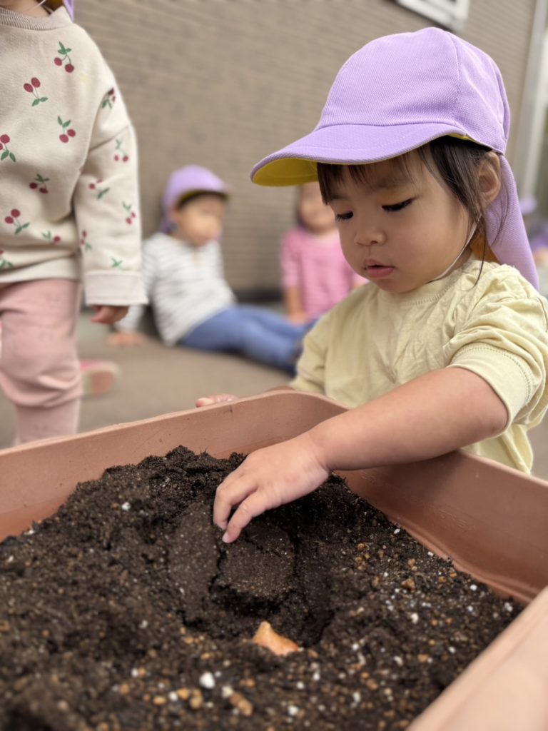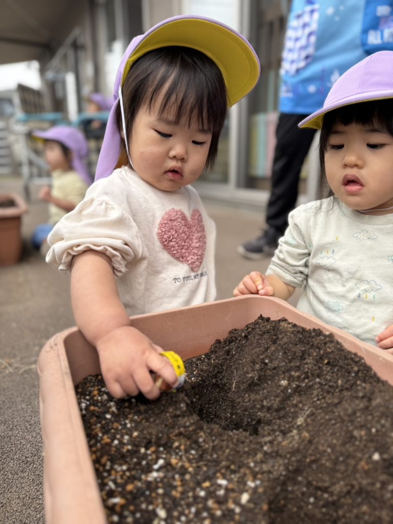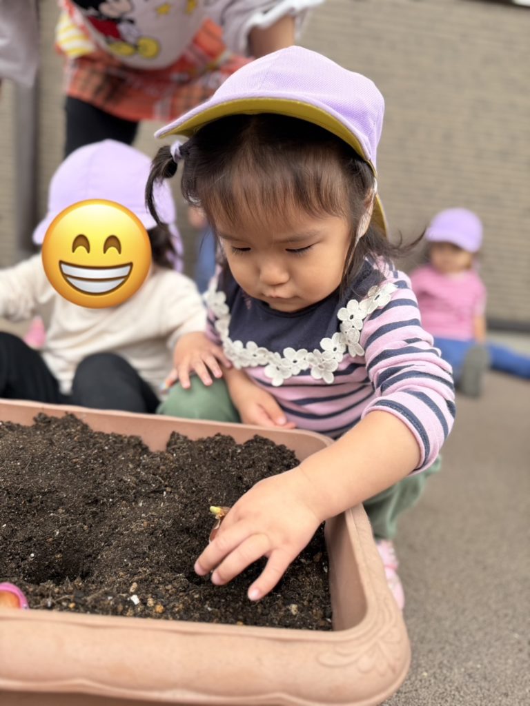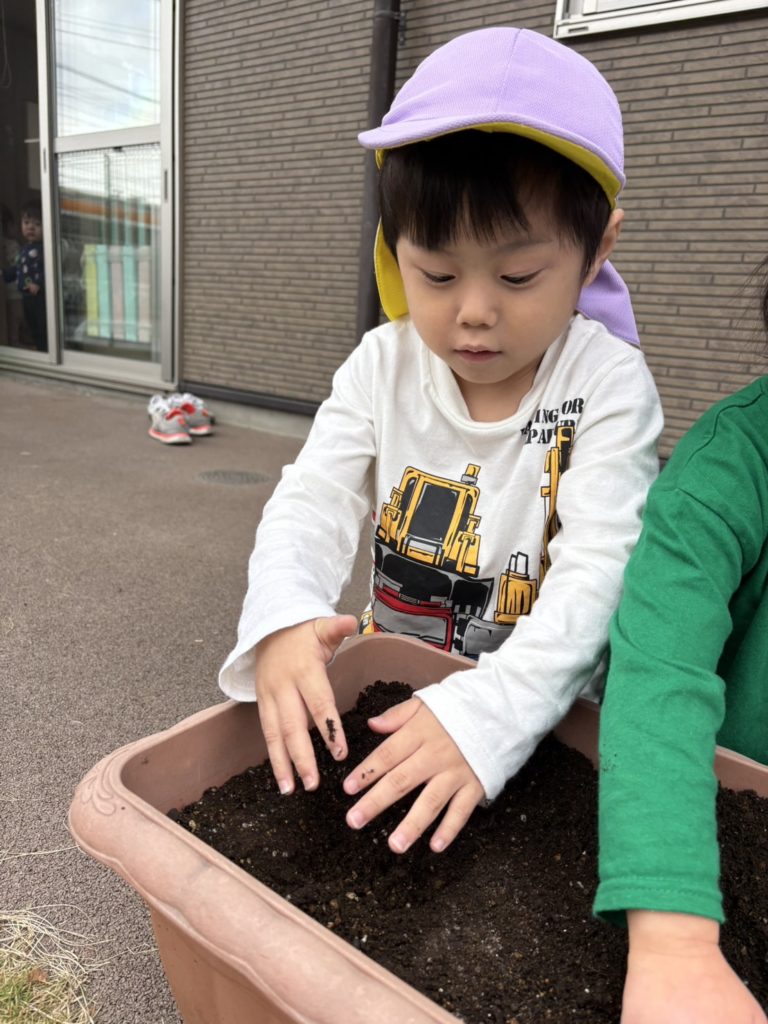 おおきくな〜れ!とおまじないをかけながら、真剣に植える子どもたち☺️