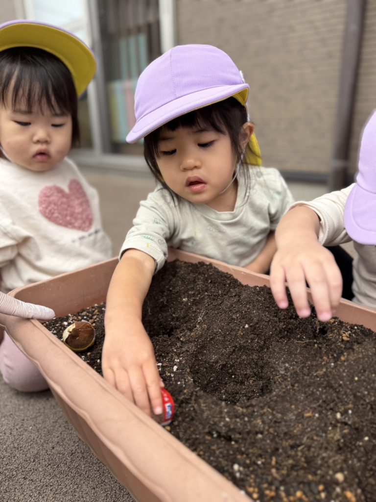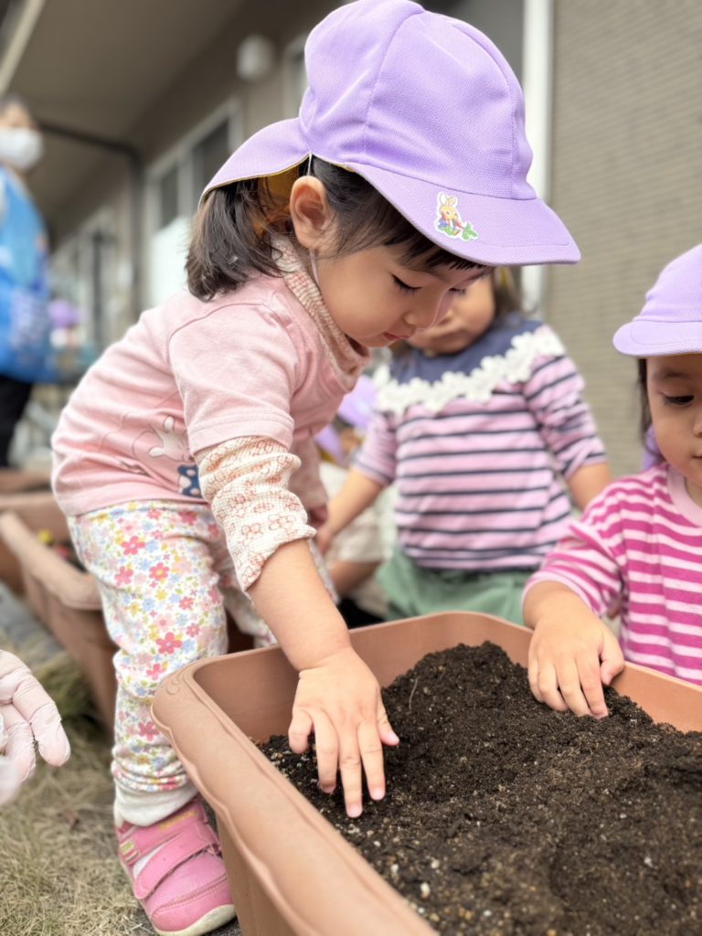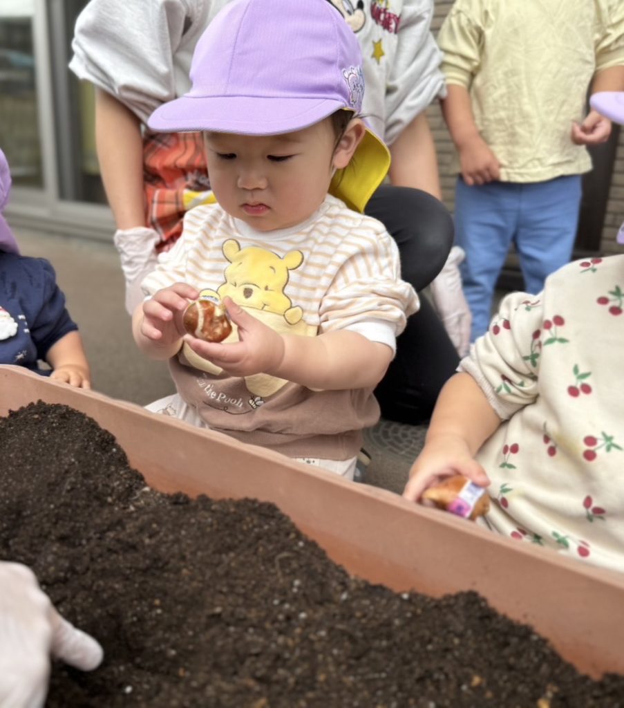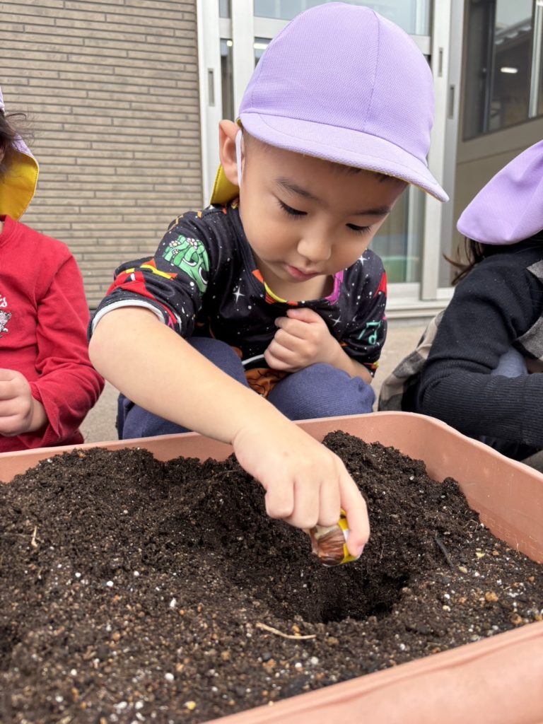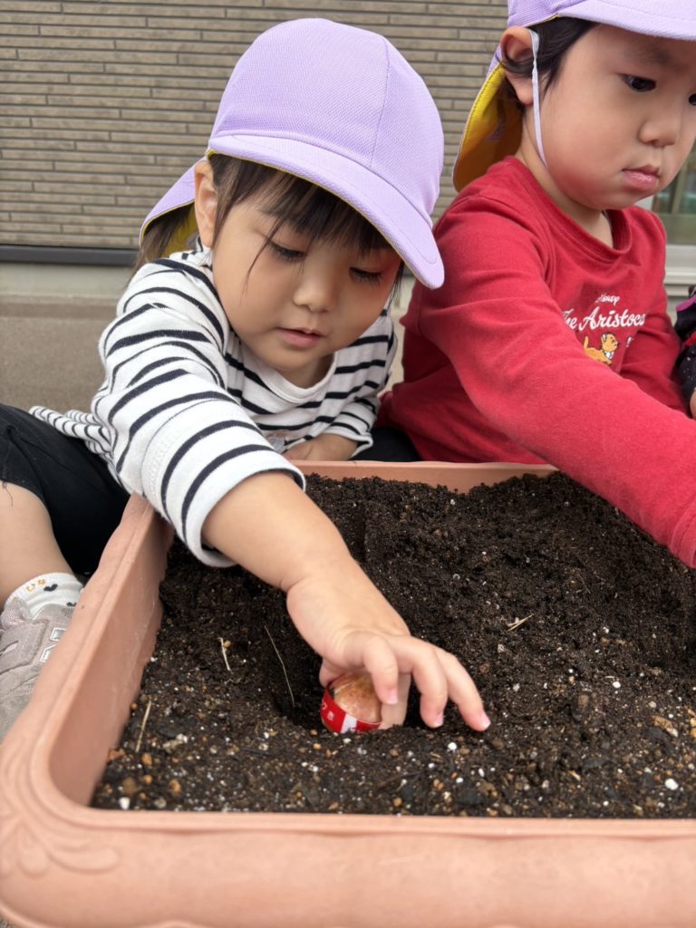 今日は園周辺の散歩に行ってから、みんなでチューリップの球根植えをしました!