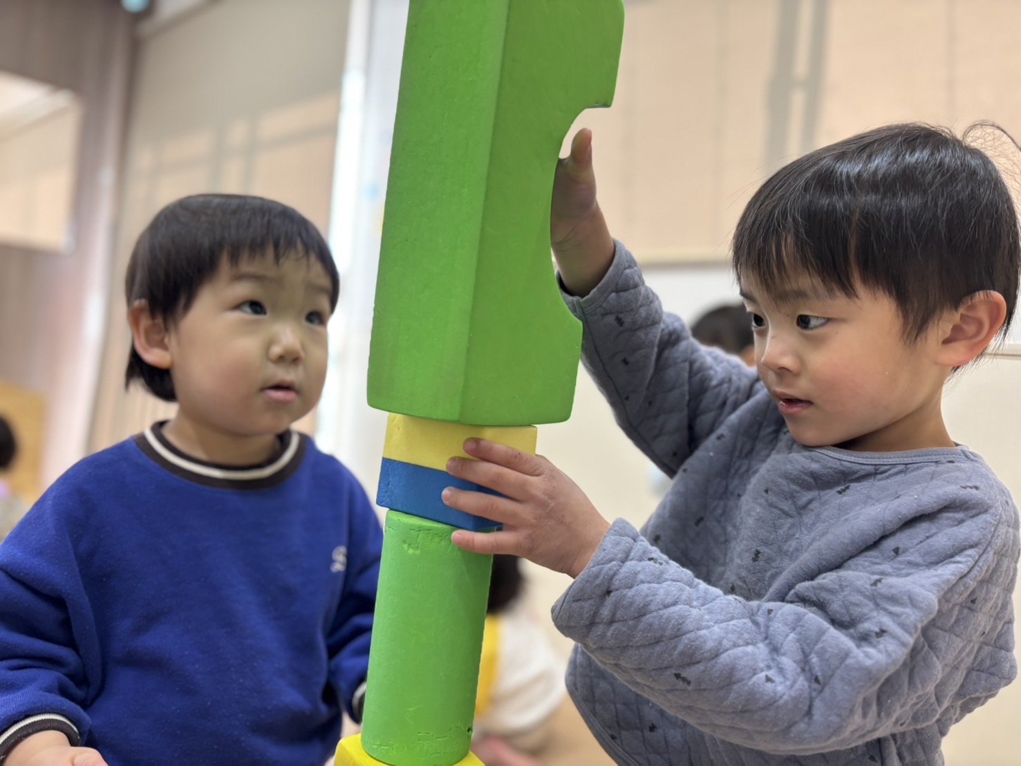 今日は正課体育をしました!クラスごとに行なっているので、待っている間はソフトブロックで遊びました😌 積めるかな?ごっこ遊び中。。。よいしょ〜!のるかな?仲良しだね☺️ごろーん😴 明日も元