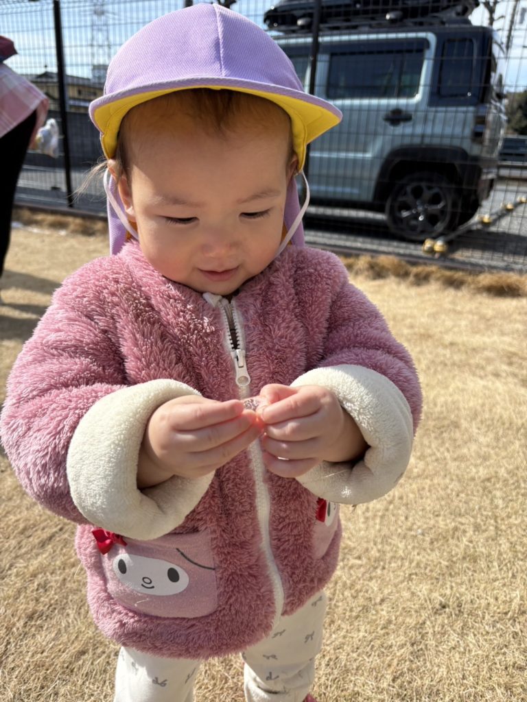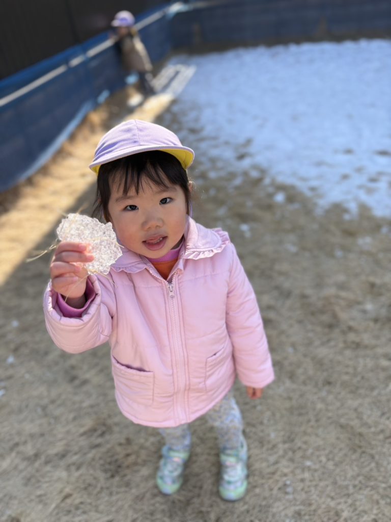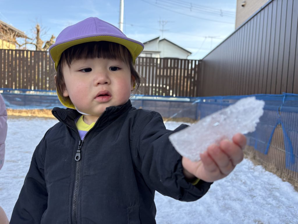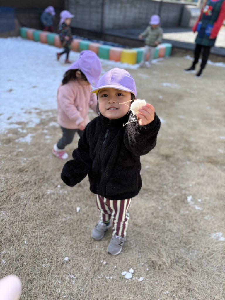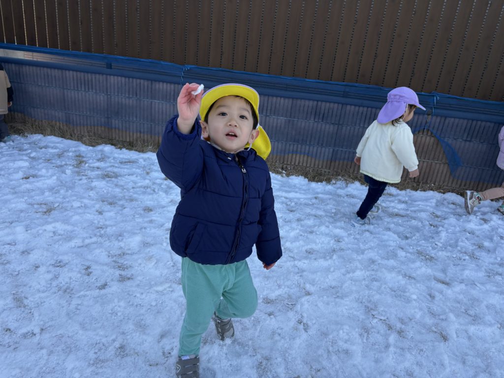 今日は少し園庭に残っている雪で遊びました!雪合戦をしてみたり、つめた〜いと嬉しそうにもって楽しんでいましたよ❄️👏