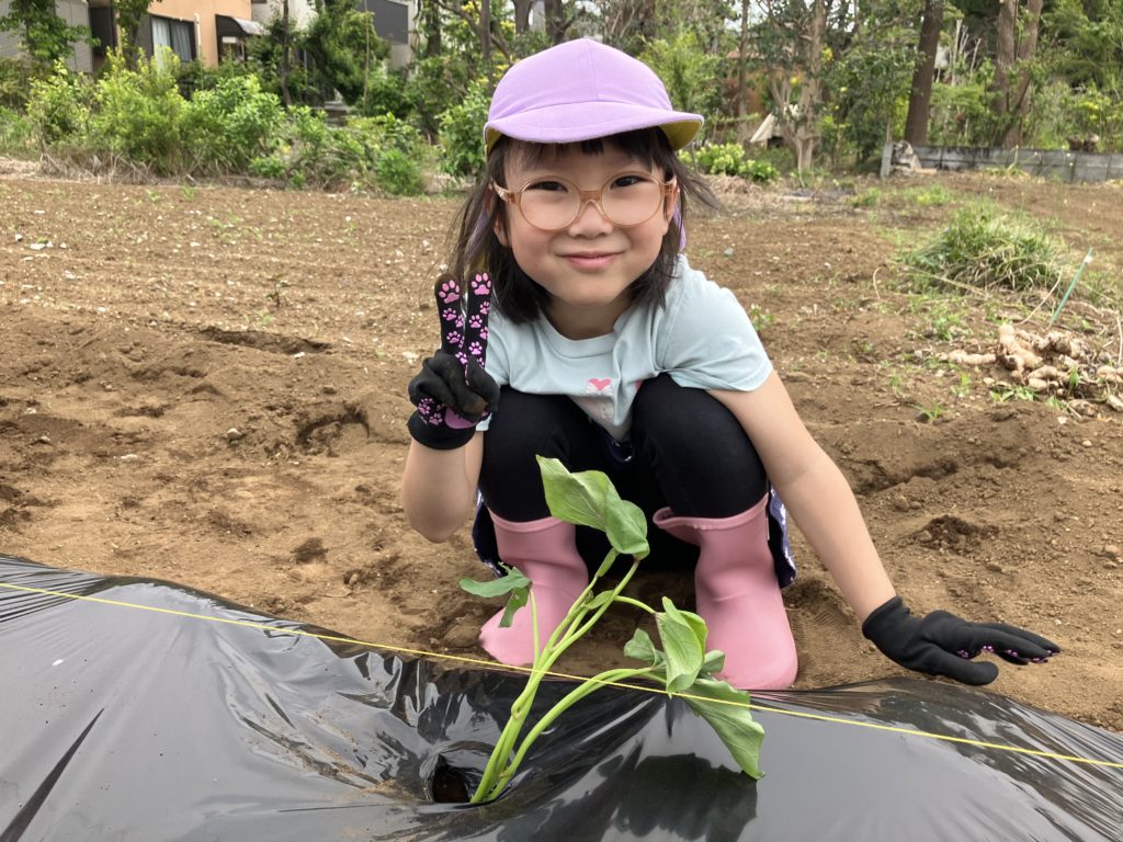 長靴を履いて軍手を付けて、さつまいもの苗植え開始‼️今年は「紅あずま」という種類のさつまいもを育てます😄💖