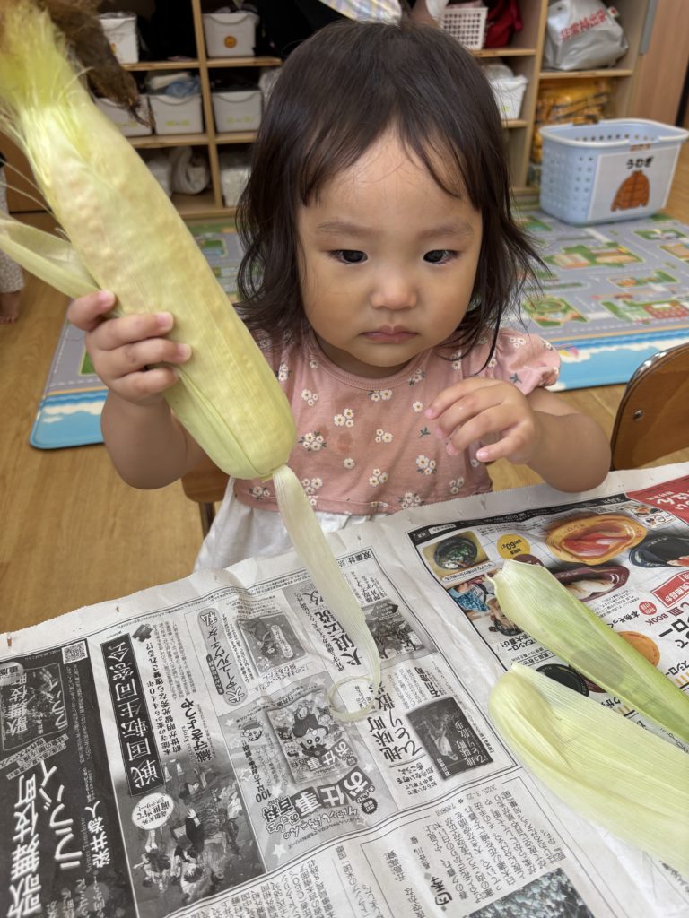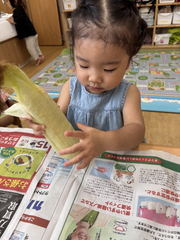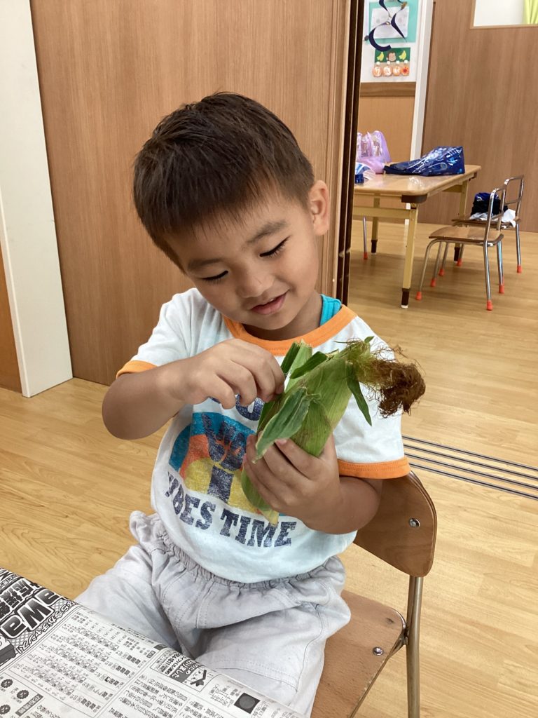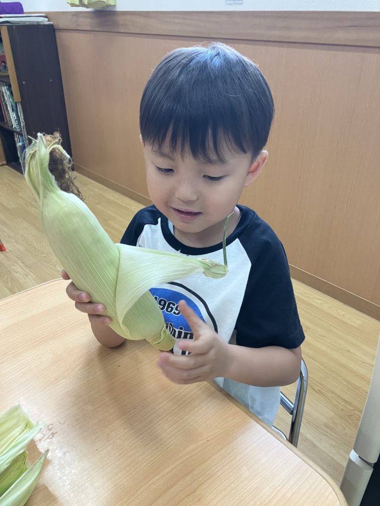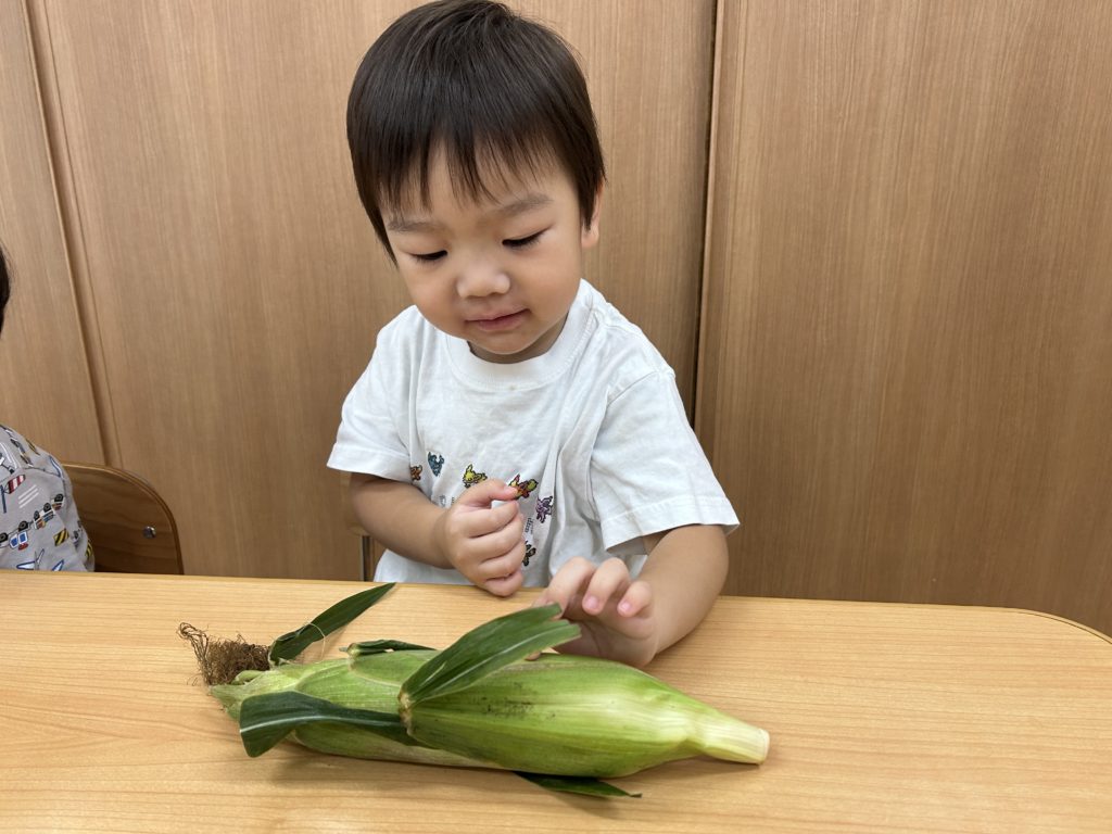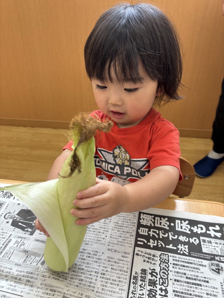 今日はとうもろこしの皮むきがありました!友だちと協力したり、1人で頑張ってむいてみたり、楽しそうに参加していました。中からとうもろこしが出てくると「うわぁーとうもろこしだー」と嬉しそうにしていました!