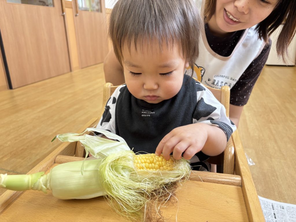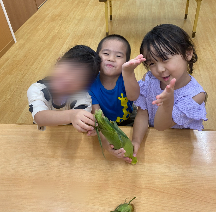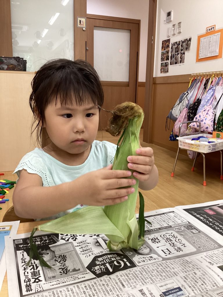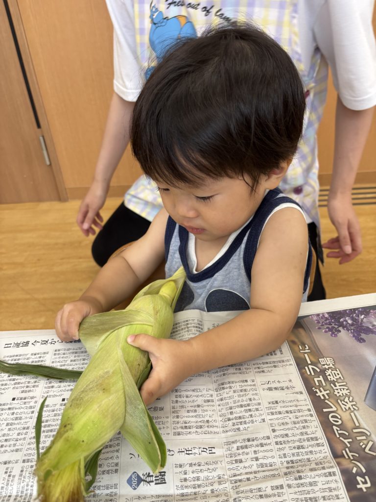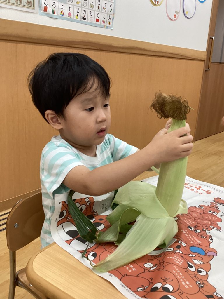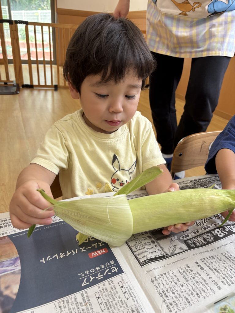 今日はとうもろこしの皮むきがありました!友だちと協力したり、1人で頑張ってむいてみたり、楽しそうに参加していました。中からとうもろこしが出てくると「うわぁーとうもろこしだー」と嬉しそうにしていました!