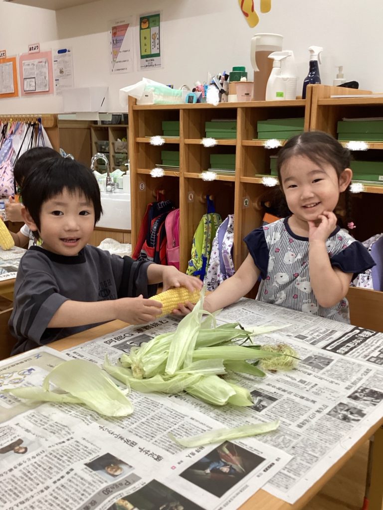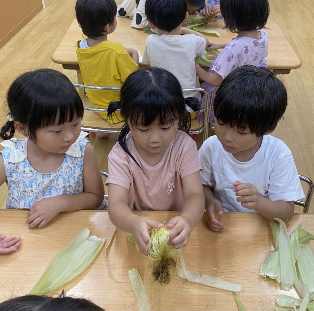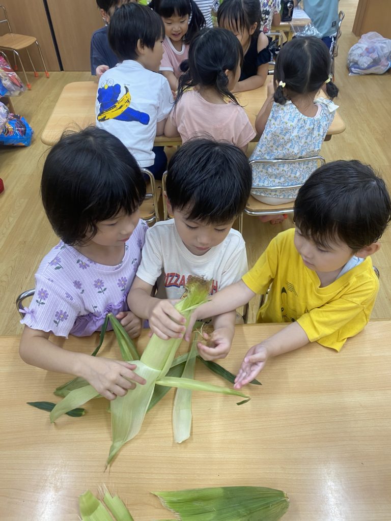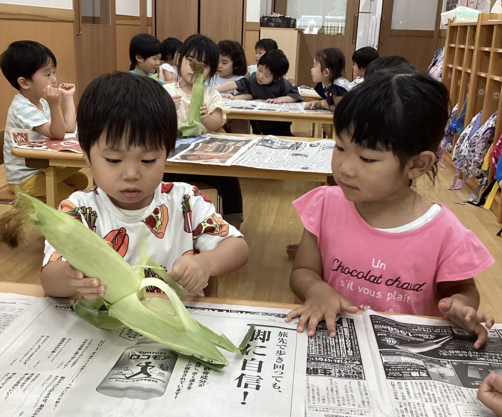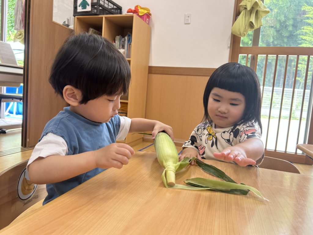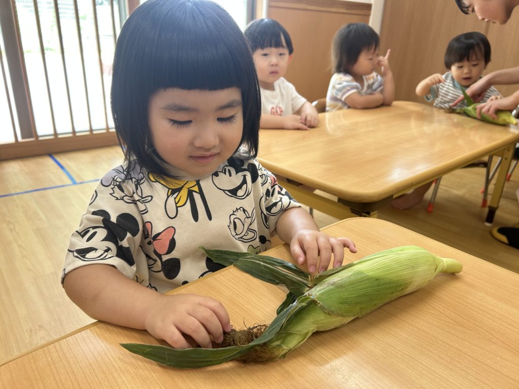 今日はとうもろこしの皮むきがありました!友だちと協力したり、1人で頑張ってむいてみたり、楽しそうに参加していました。中からとうもろこしが出てくると「うわぁーとうもろこしだー」と嬉しそうにしていました!