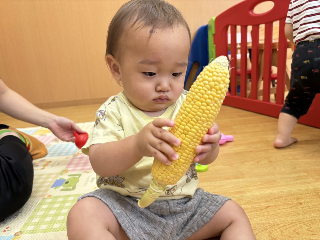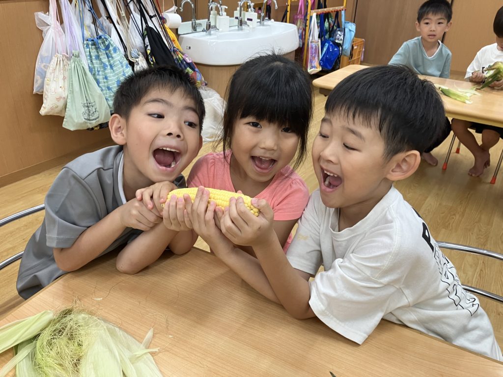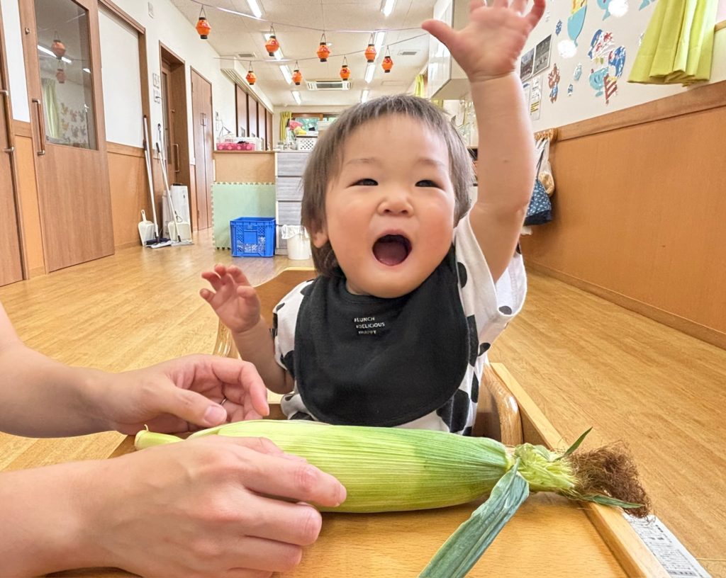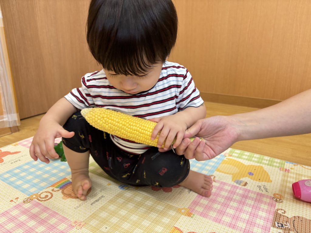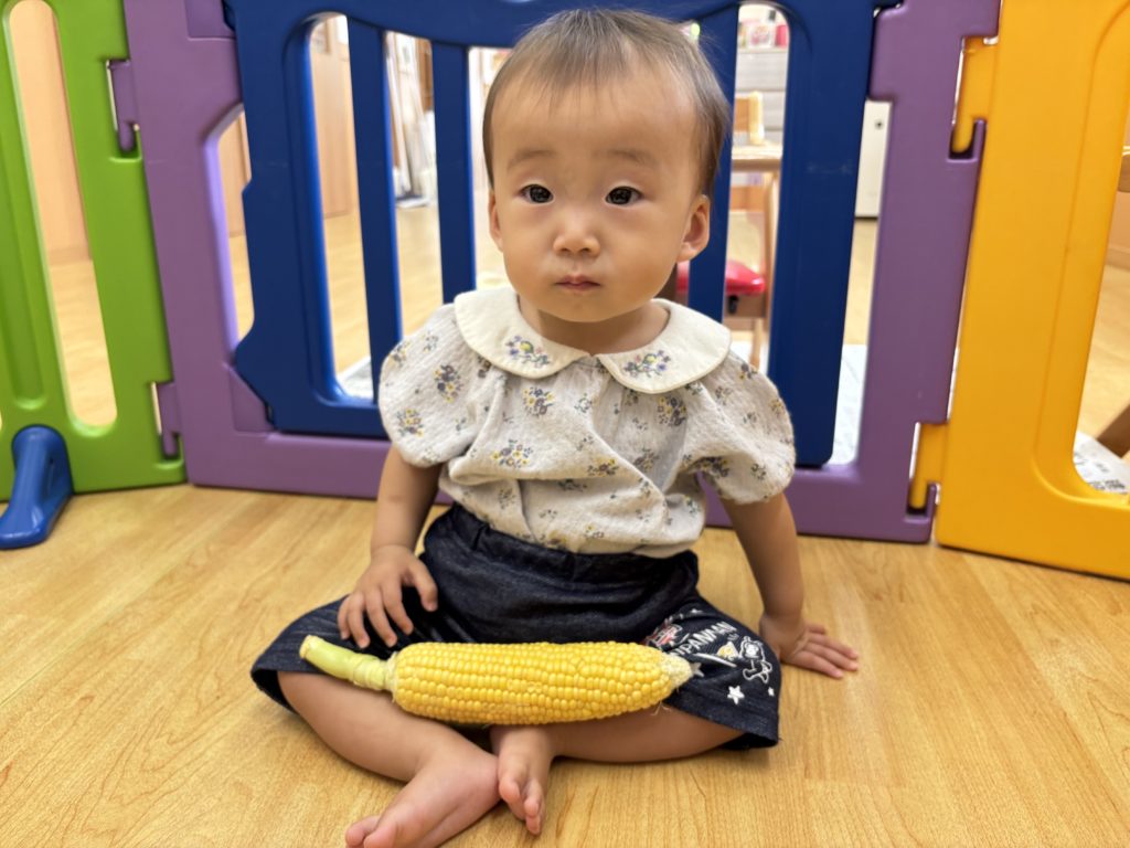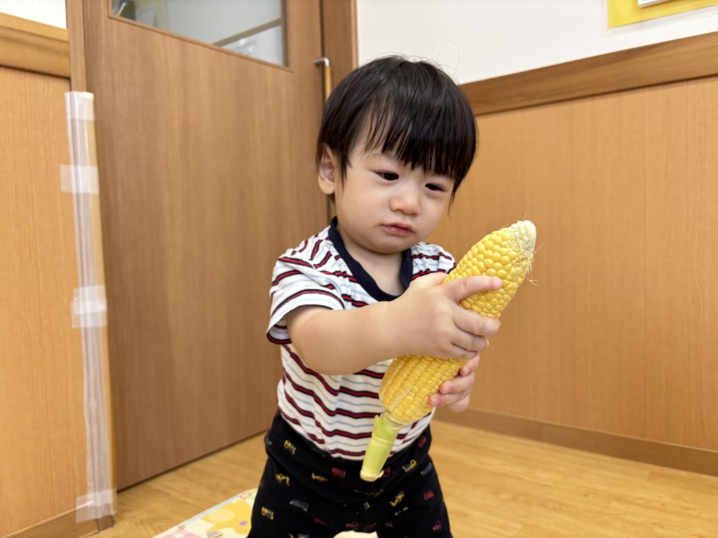 今日はとうもろこしの皮むきがありました!友だちと協力したり、1人で頑張ってむいてみたり、楽しそうに参加していました。中からとうもろこしが出てくると「うわぁーとうもろこしだー」と嬉しそうにしていました!