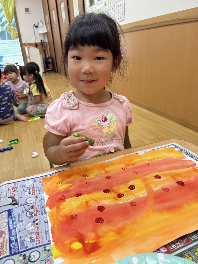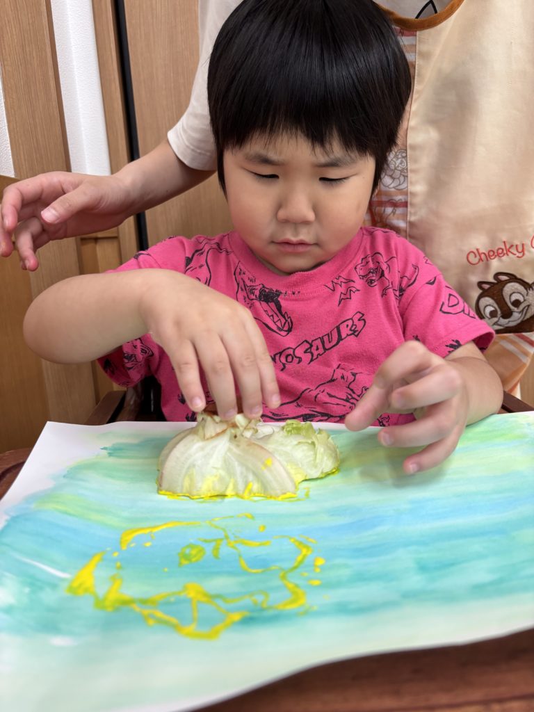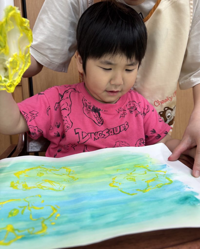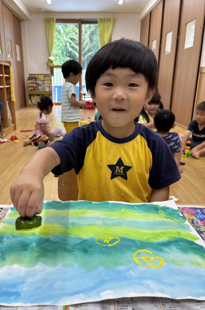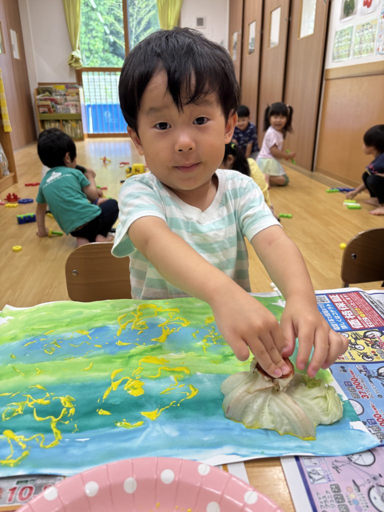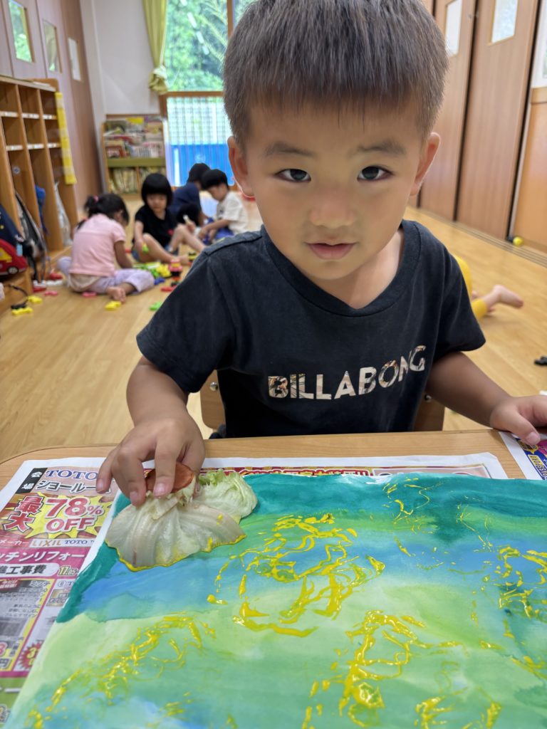 にじみ絵で色鮮やかにグラデーション塗りをした後、好きな野菜をレタス、オクラ、ピーマン、大根の葉、青梗菜、小松菜の中から選んでTシャツやワンピースに野菜スタンプで柄付けを楽しみました👕👚💕