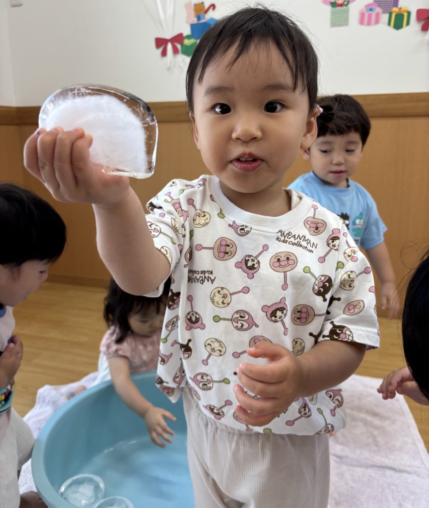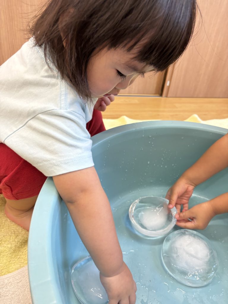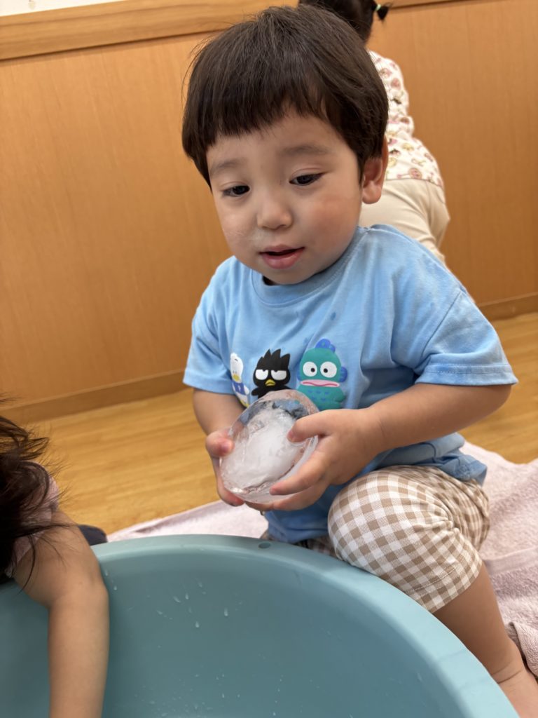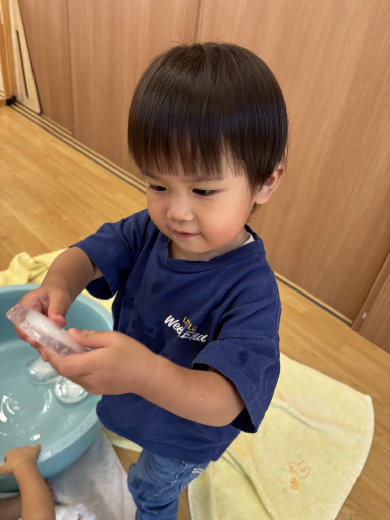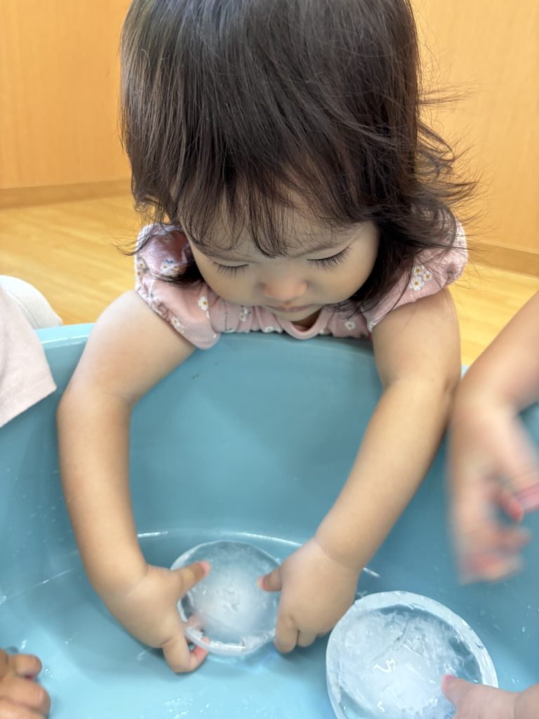 暑い日が続き戸外に出られないので、お部屋で氷遊びをして涼をとりました。