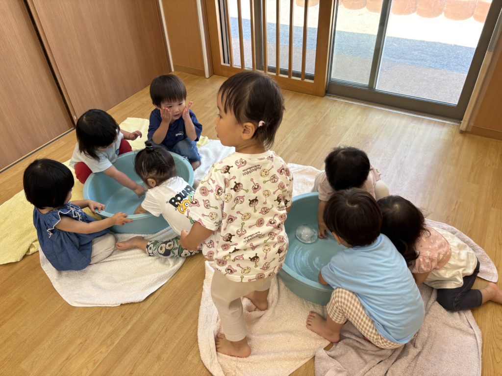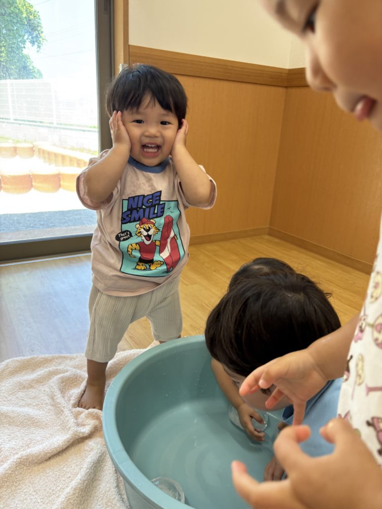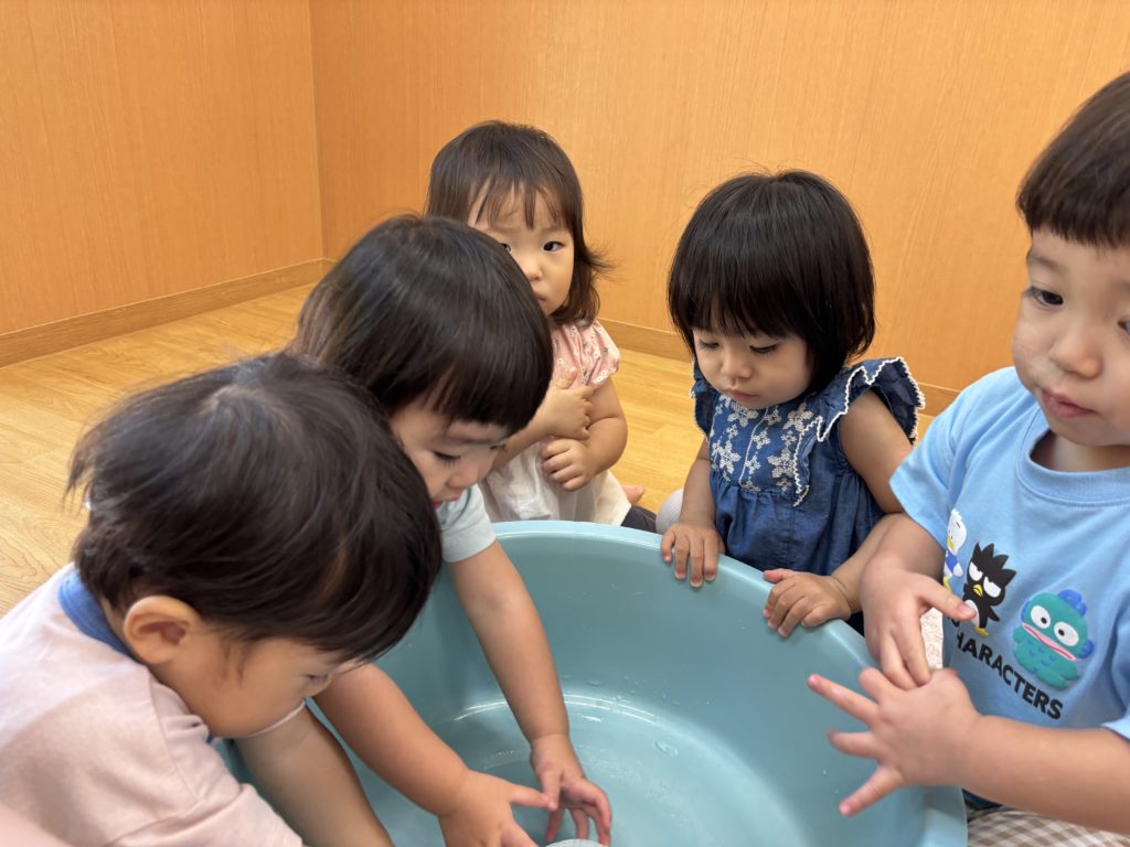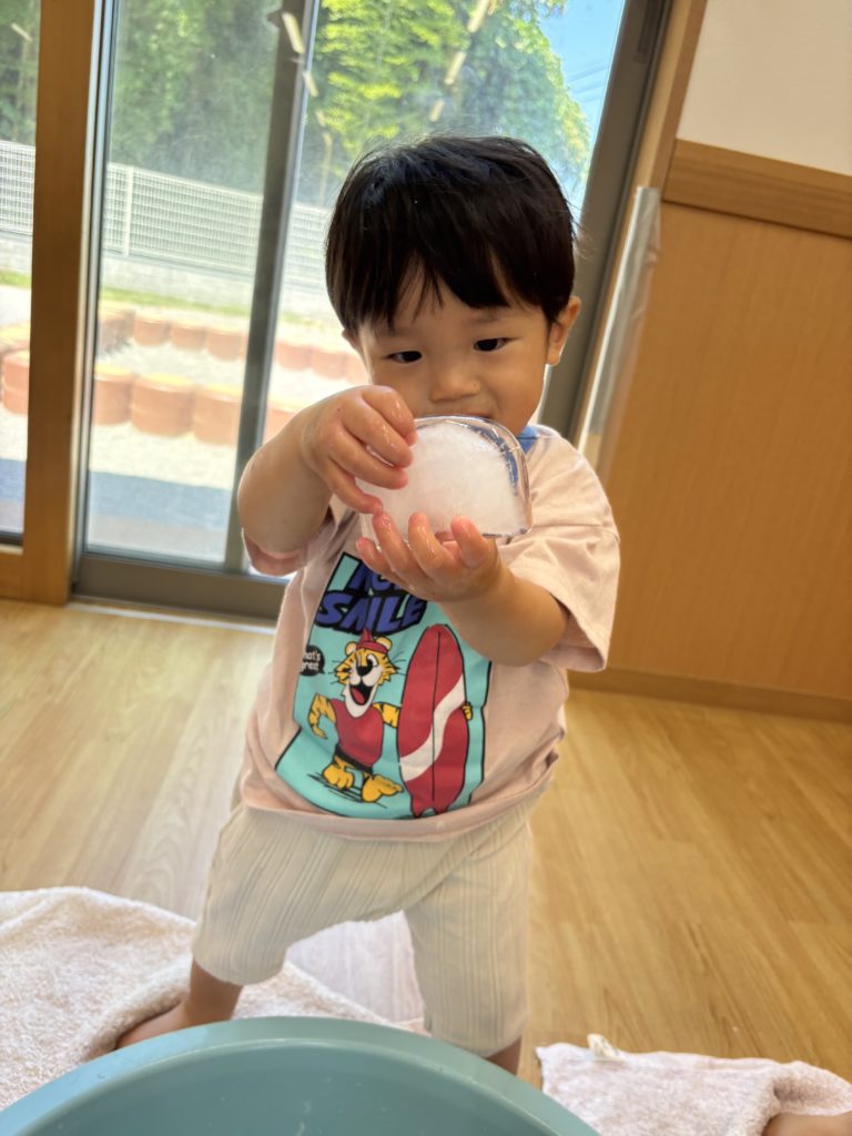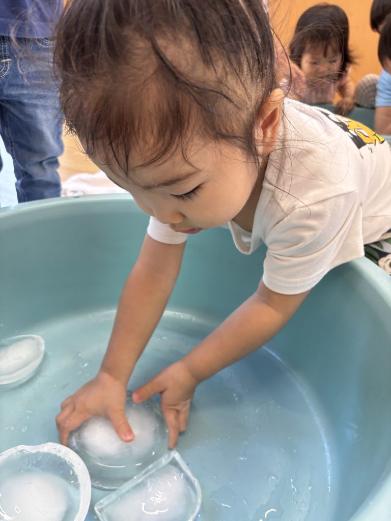 暑い日が続き戸外に出られないので、お部屋で氷遊びをして涼をとりました。