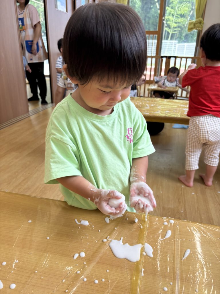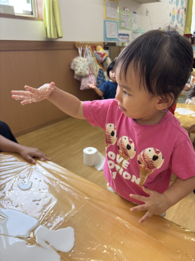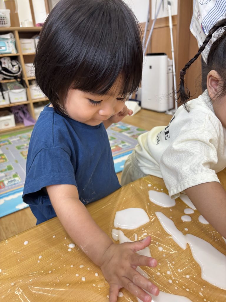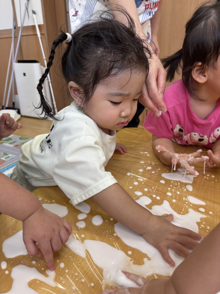 片栗粉で作ったスライムを触り不思議な感触に驚く子どもたち💫