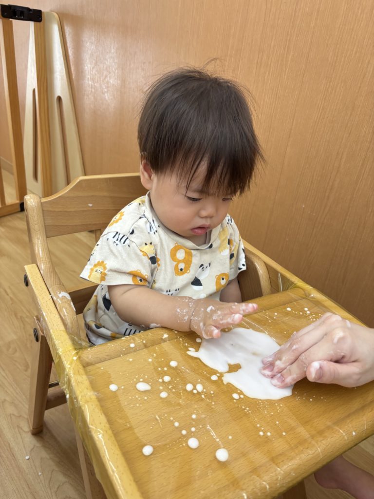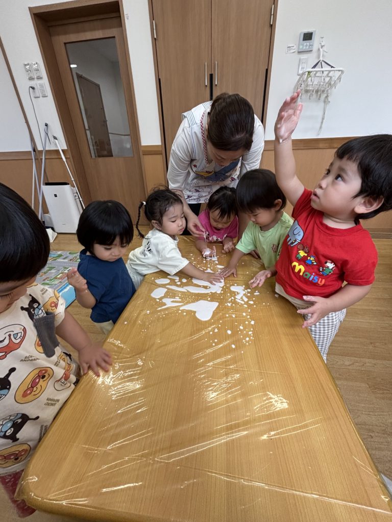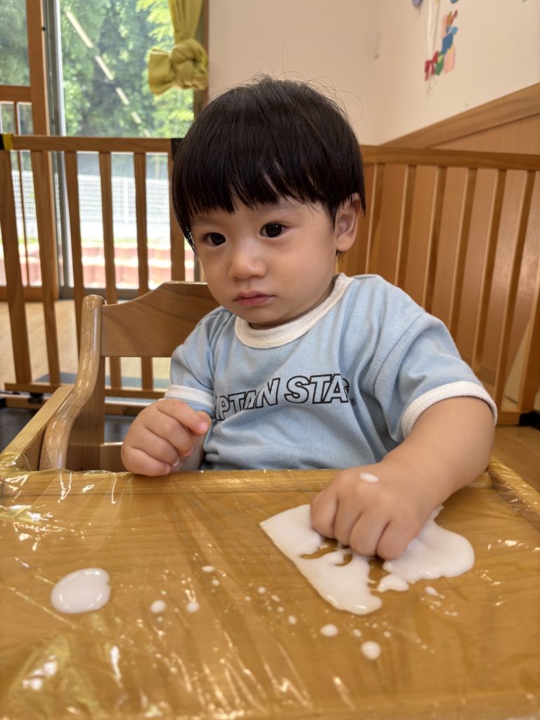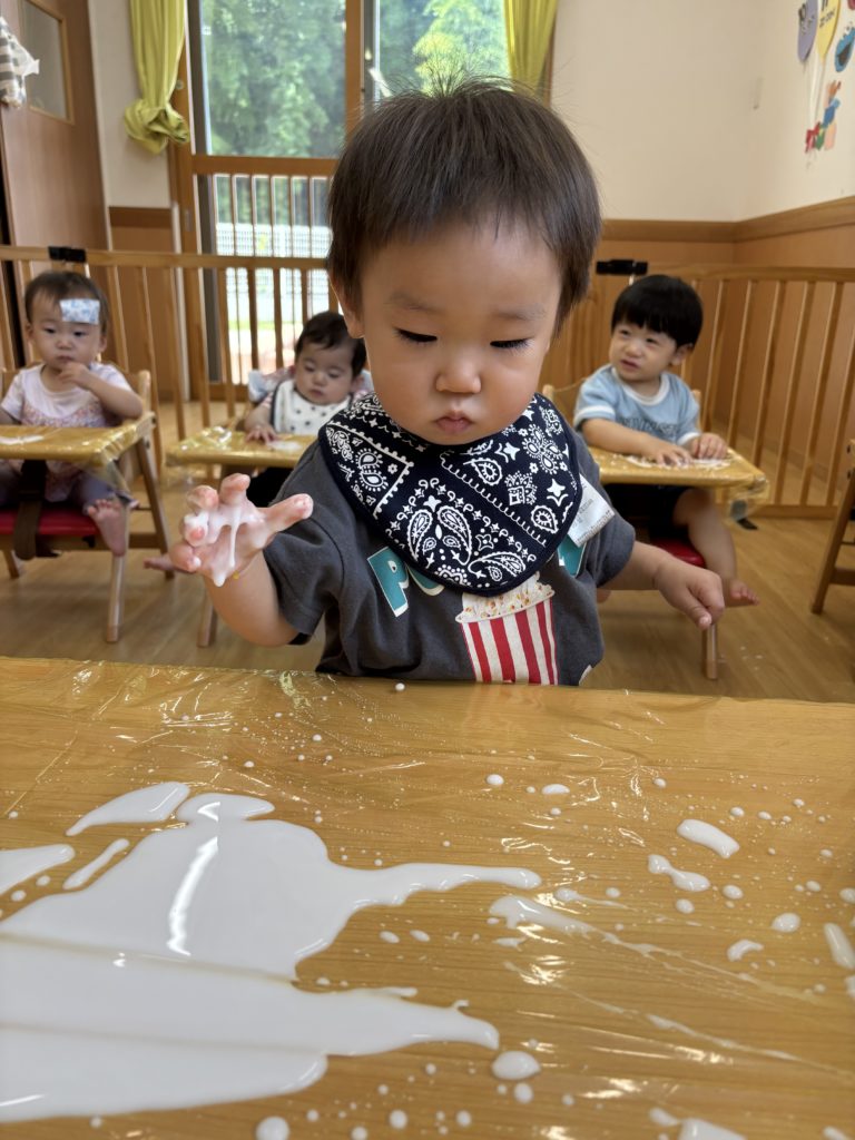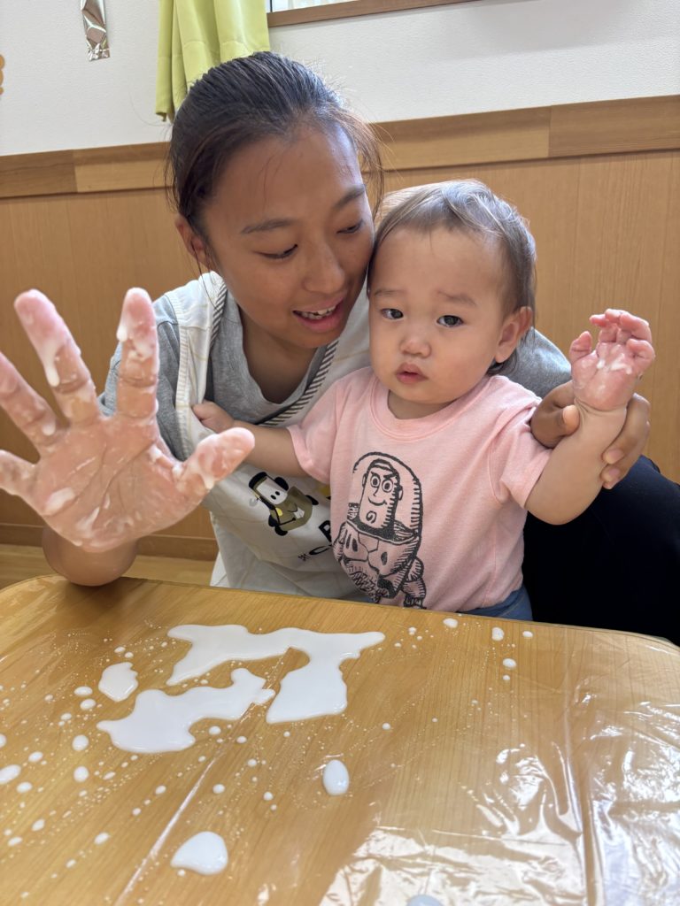 片栗粉で作ったスライムを触り不思議な感触に驚く子どもたち💫