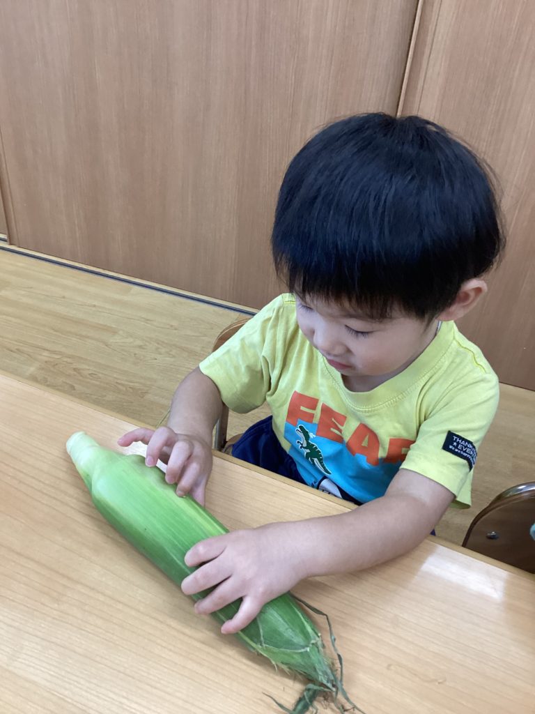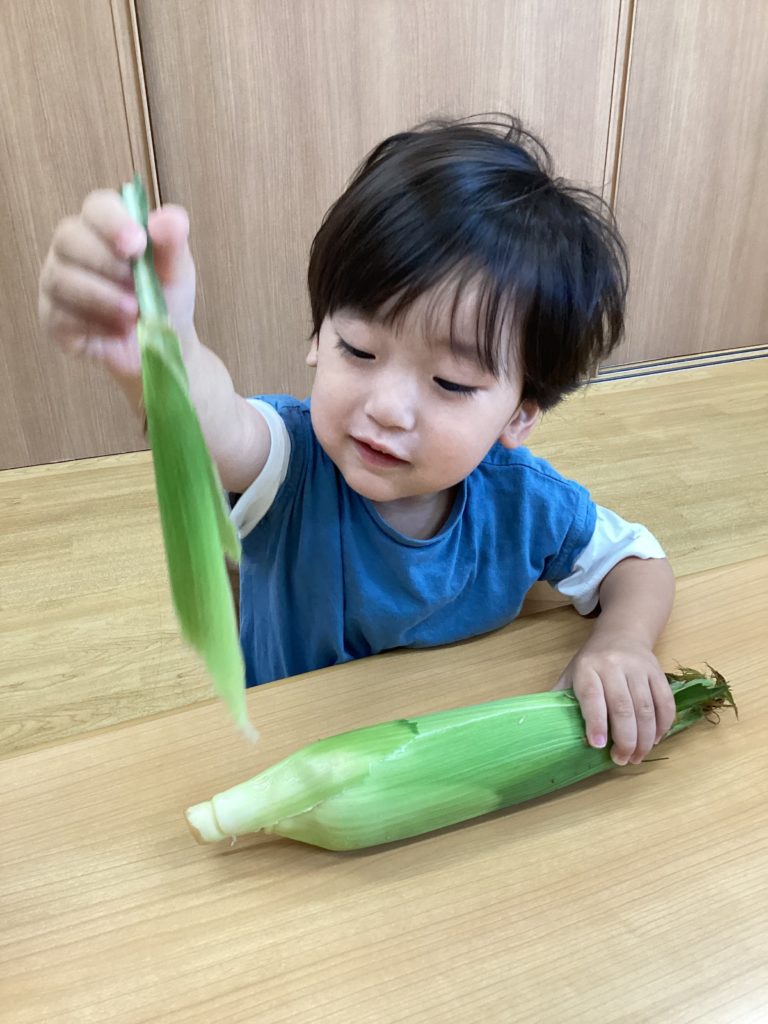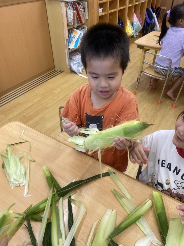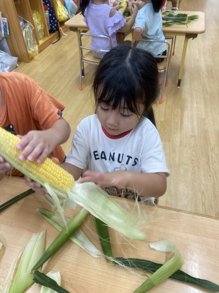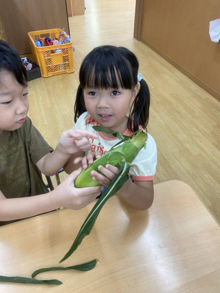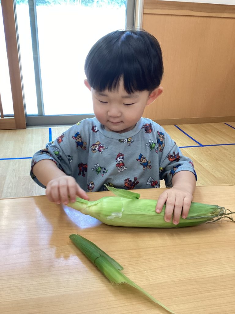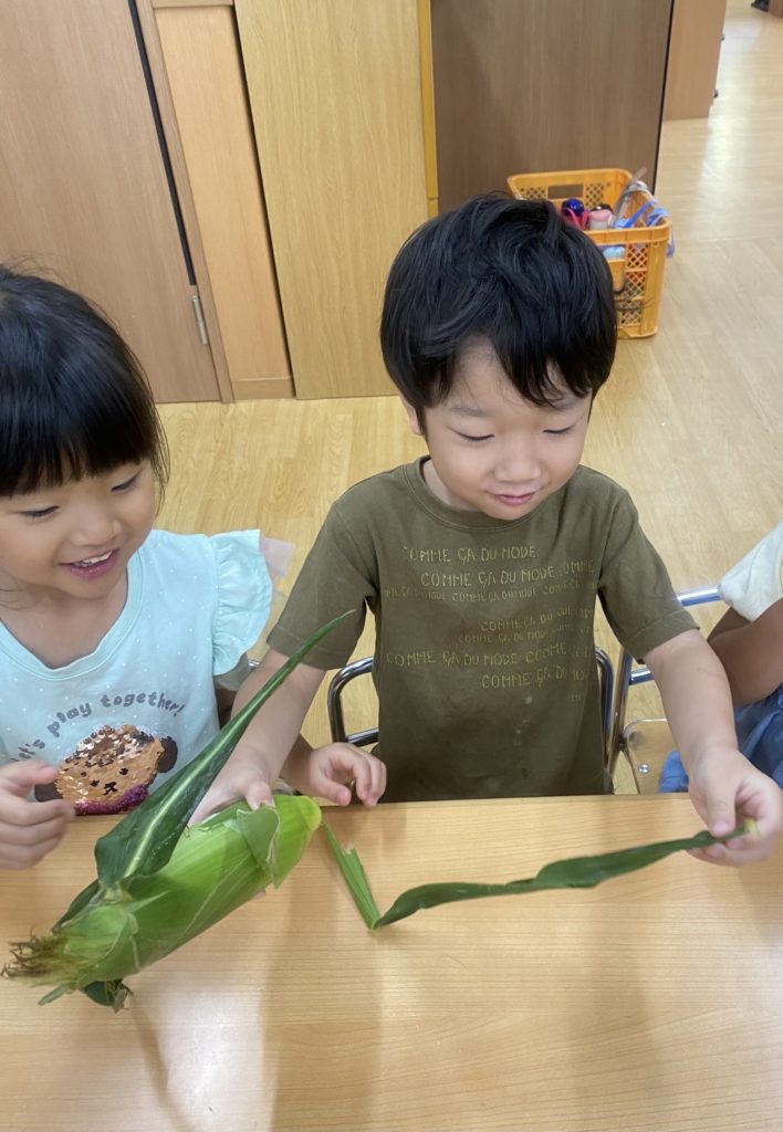 今年度2回目のとうもろこしの皮むき、初めてやった7月より上手に剥く子どもたち、楽しそうに参加していました!