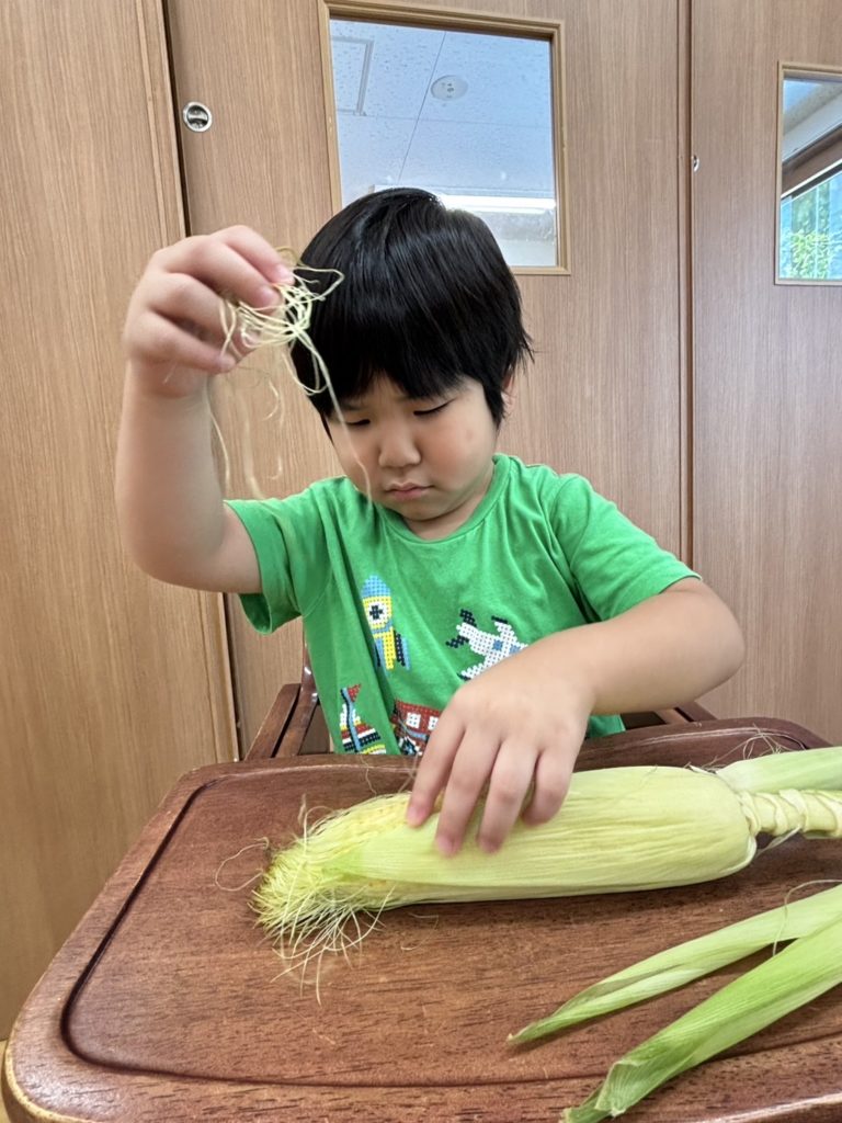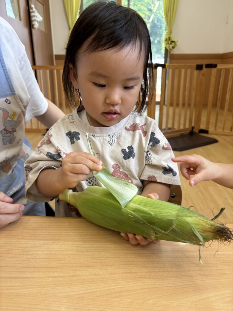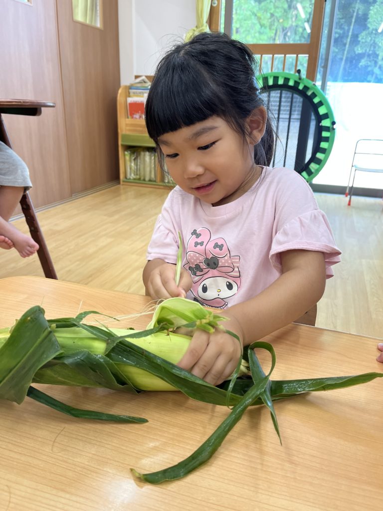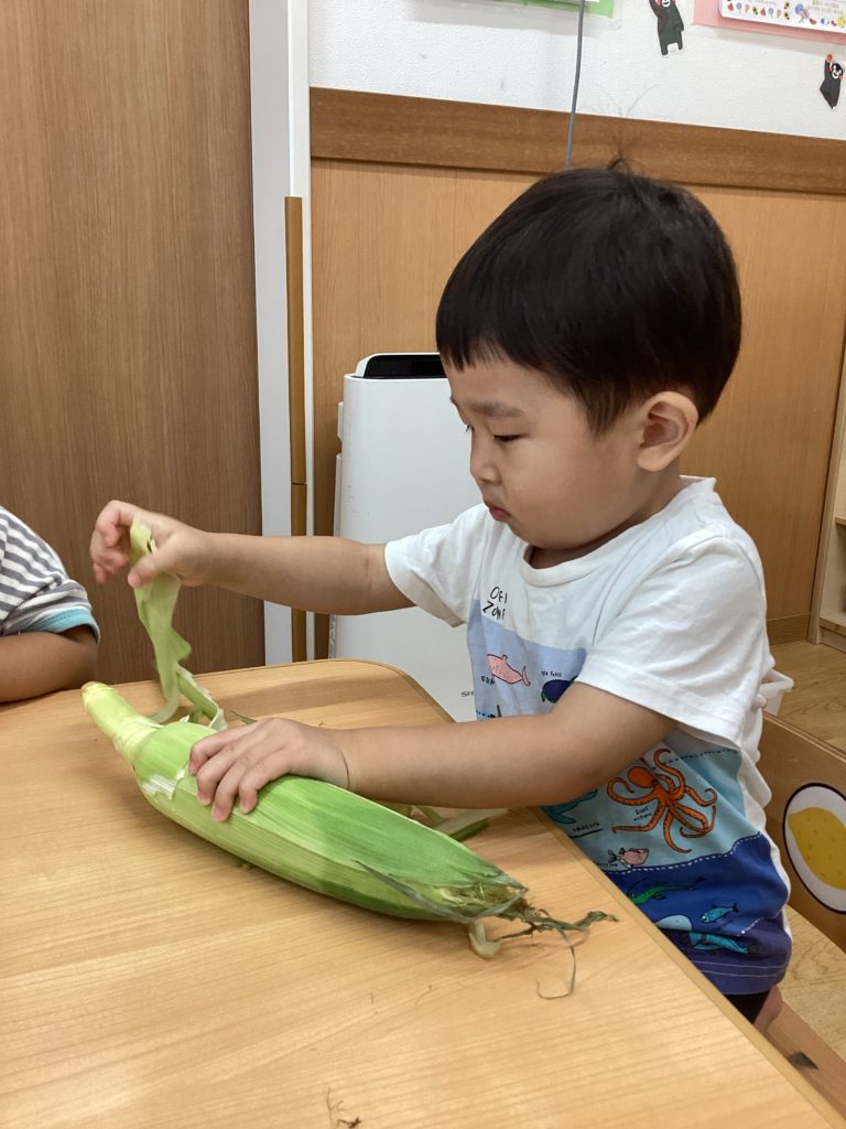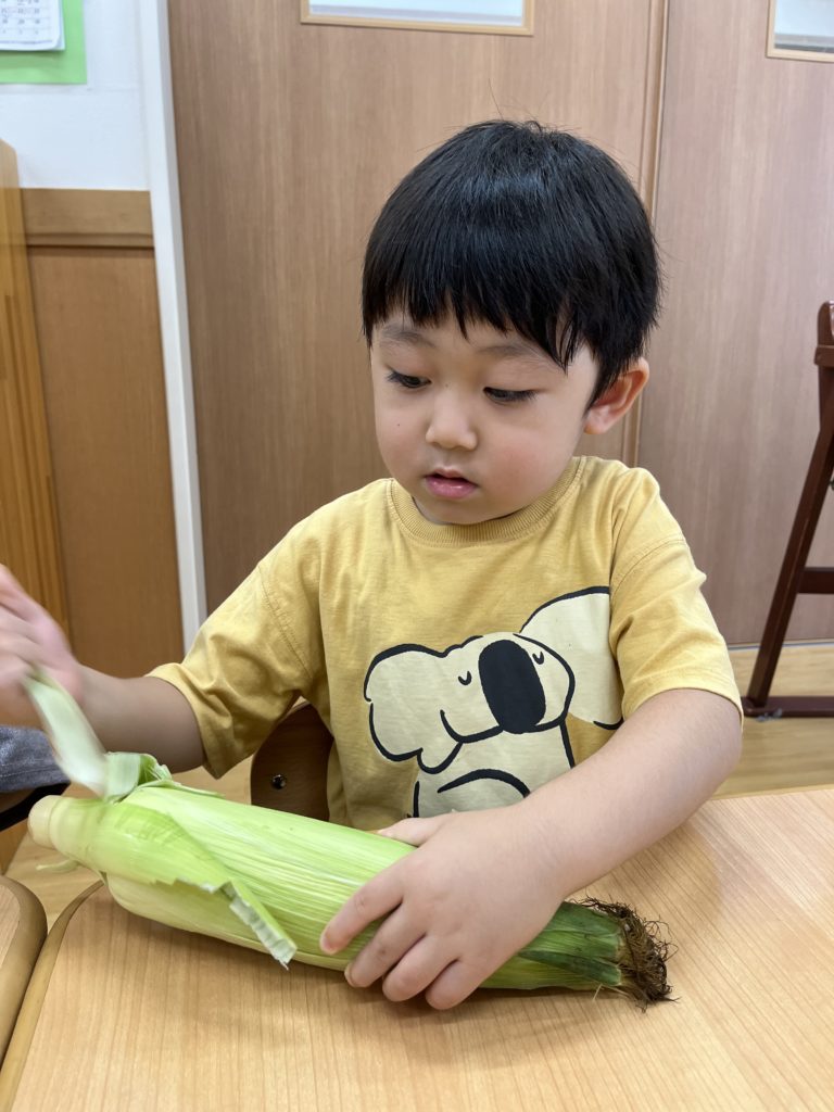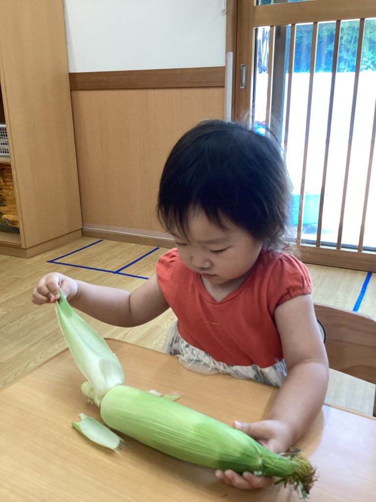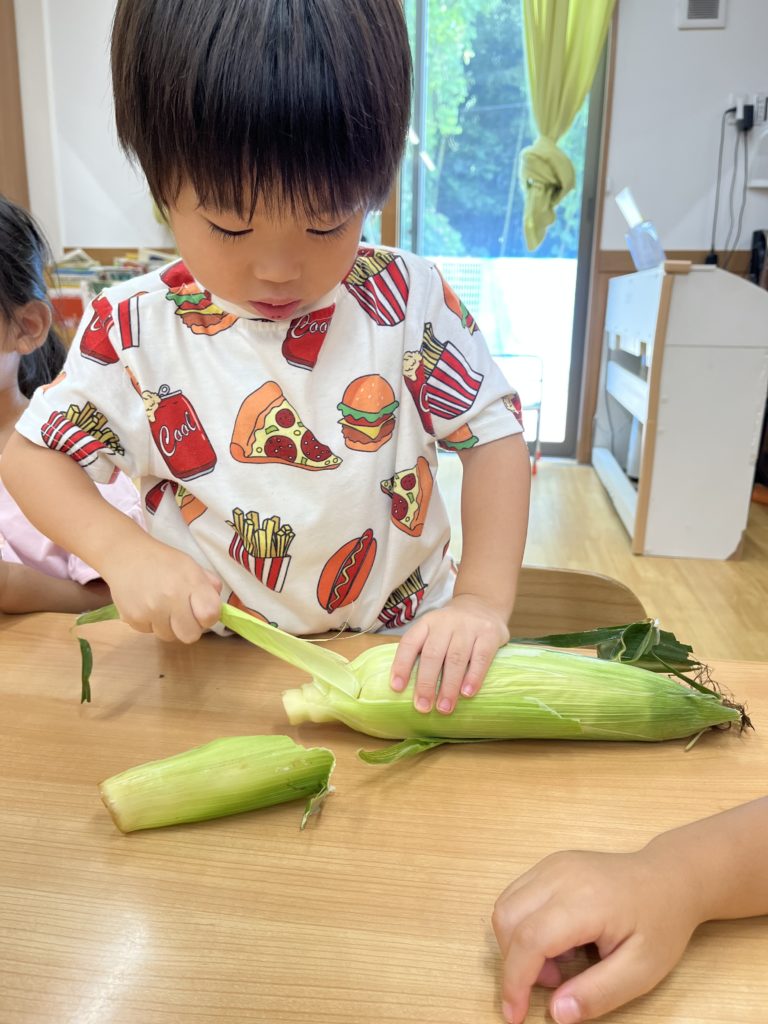 今年度2回目のとうもろこしの皮むき、初めてやった7月より上手に剥く子どもたち、楽しそうに参加していました!