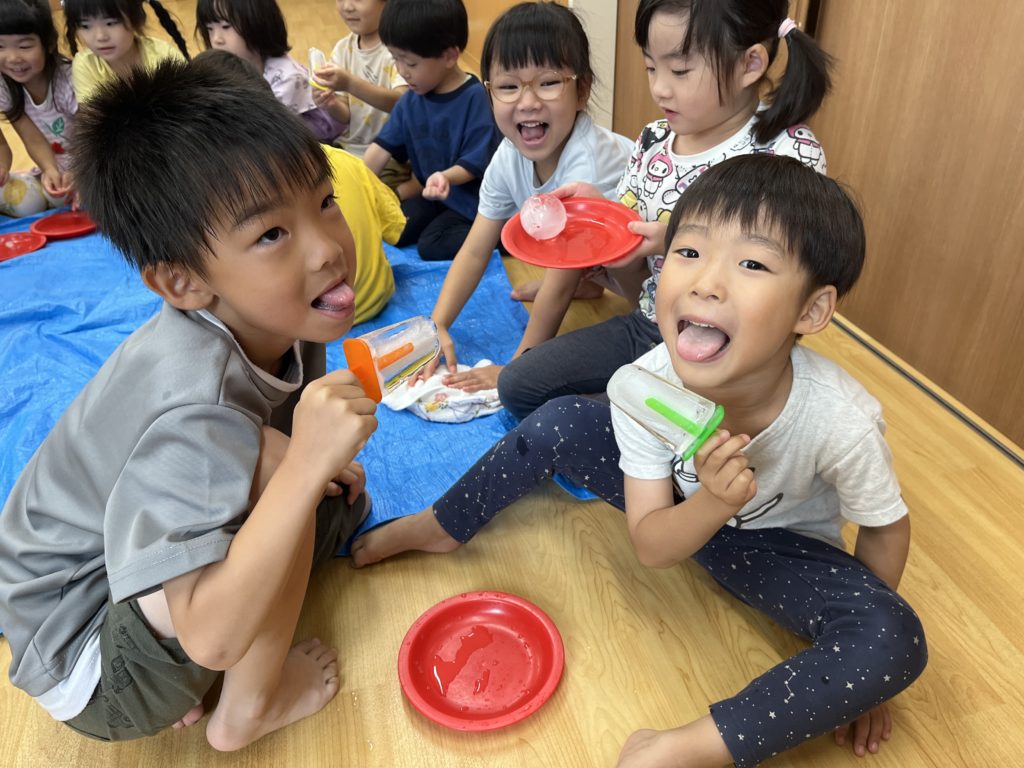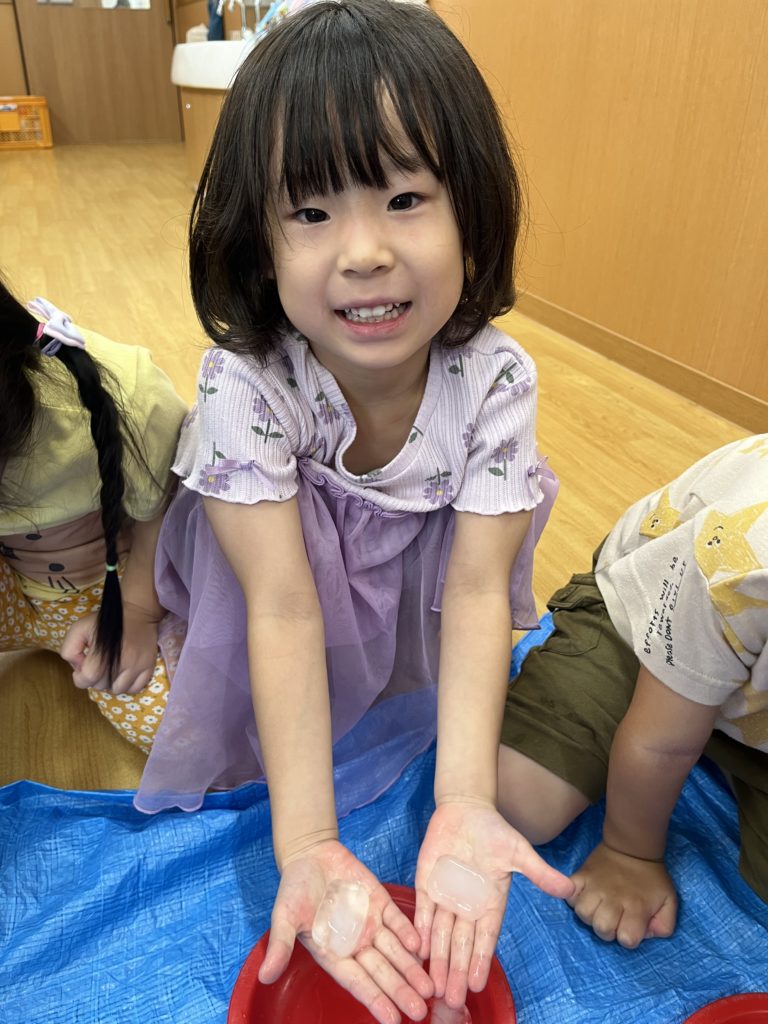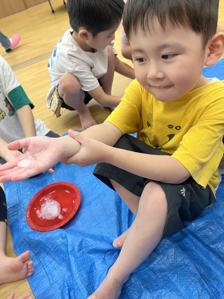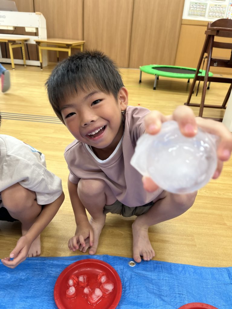 「冷た〜い!」「これ見て!触ってみて〜!」と氷に夢中な子どもたちでした😁
