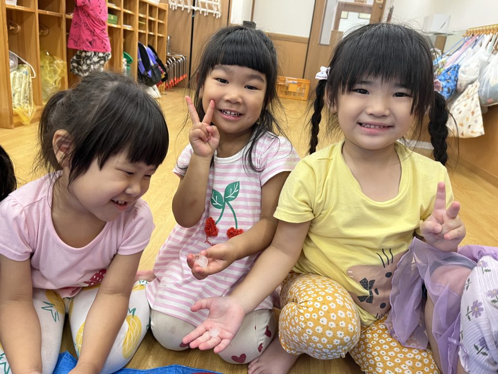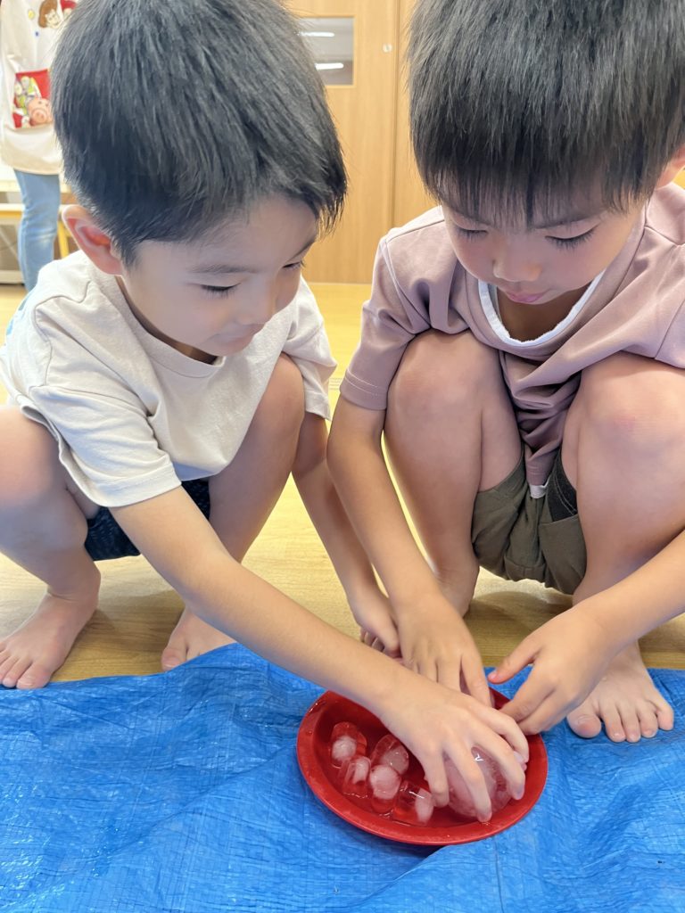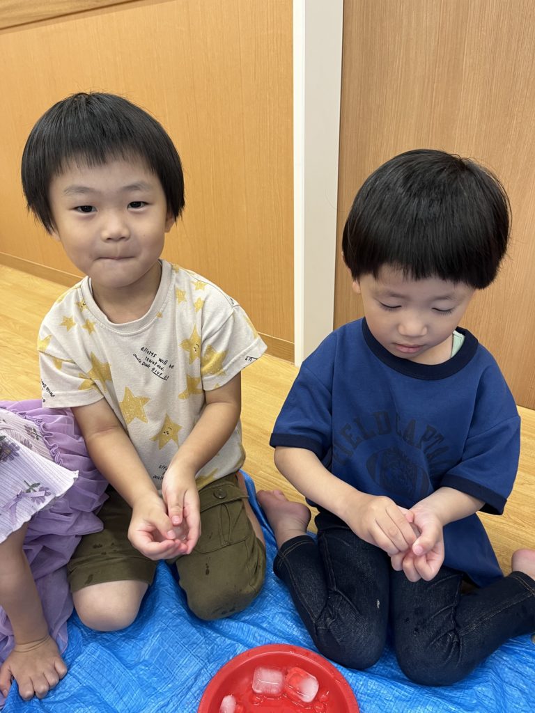 幼児クラスのみんなで氷遊びをしました!小さい氷から大きい氷までさまざまな大きさの違う氷があり、みんな大喜び😆