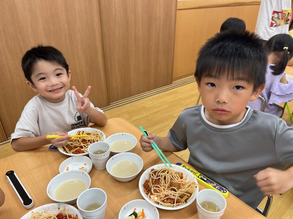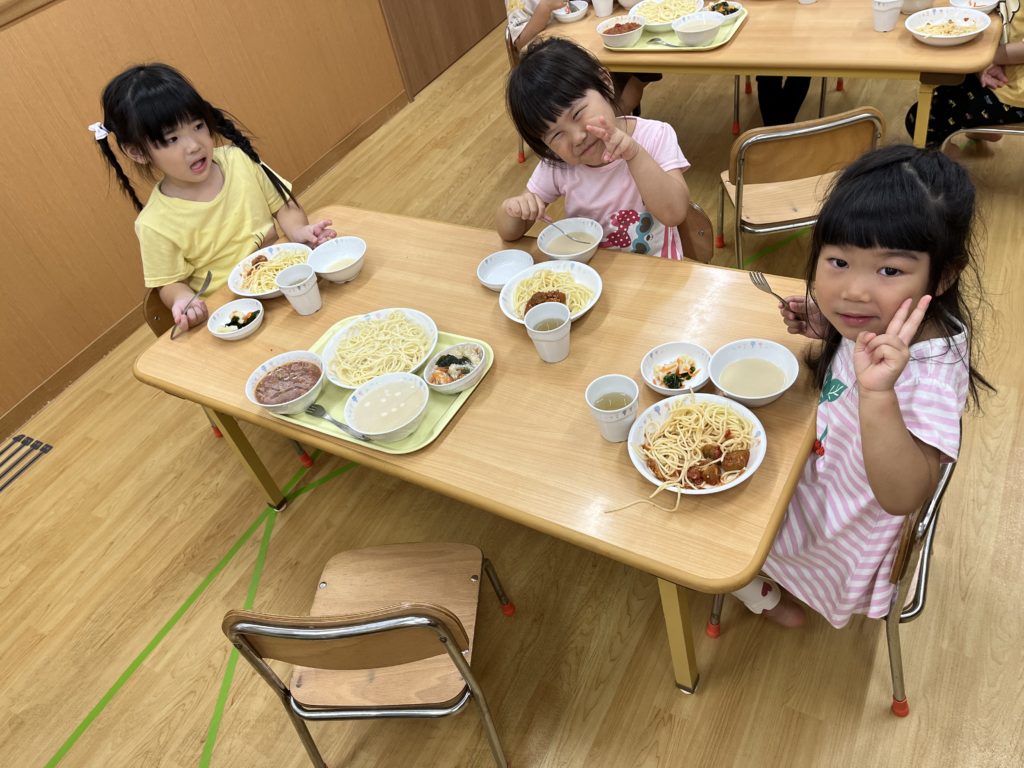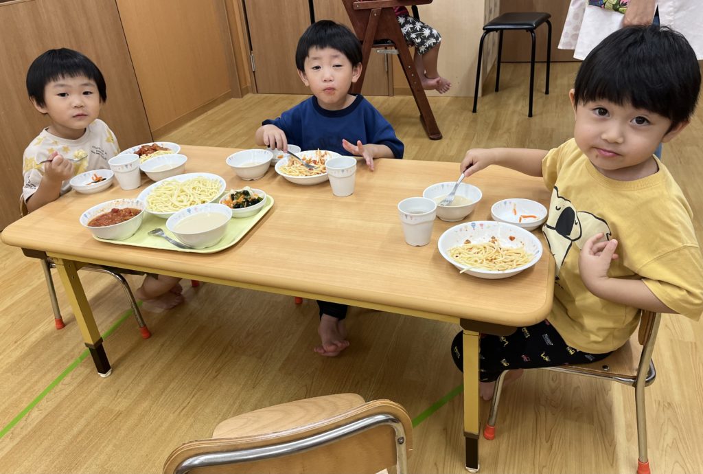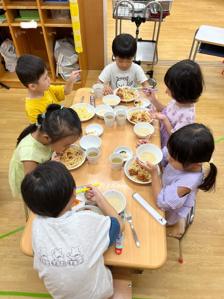 年長組のお当番さんが給食を配ってくれて、みんなで一緒に食べました!