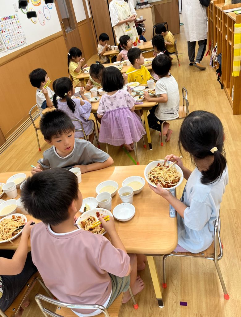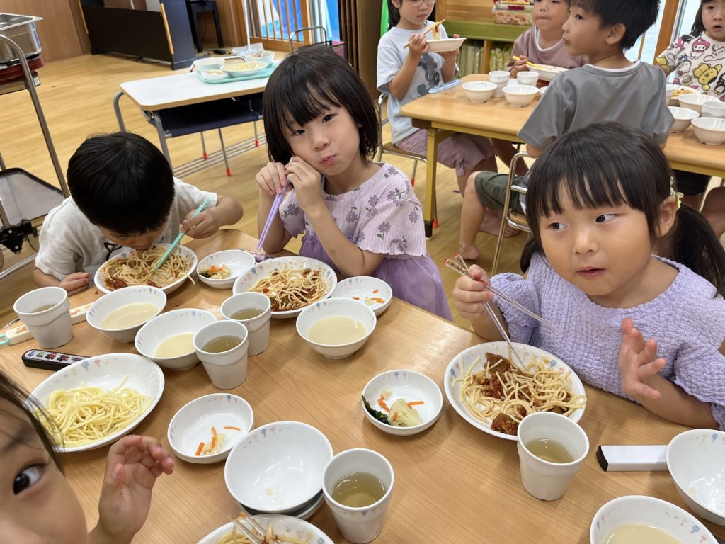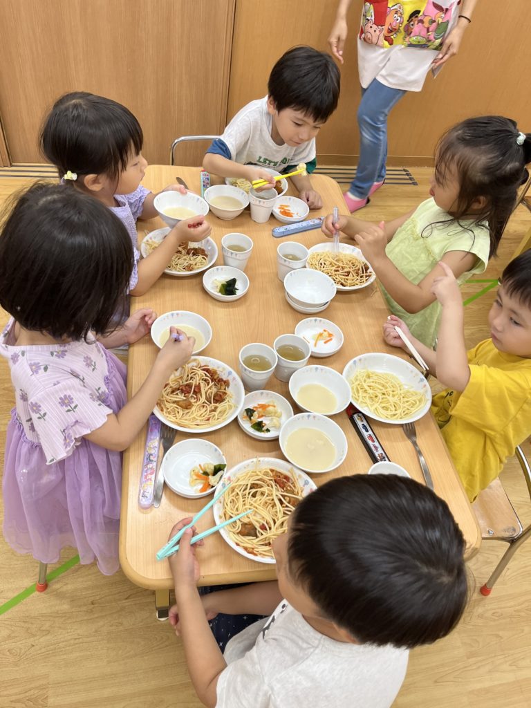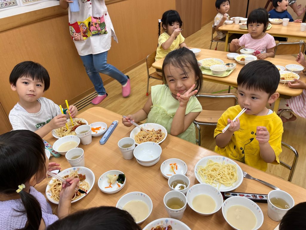 年長組のお当番さんが給食を配ってくれて、みんなで一緒に食べました!