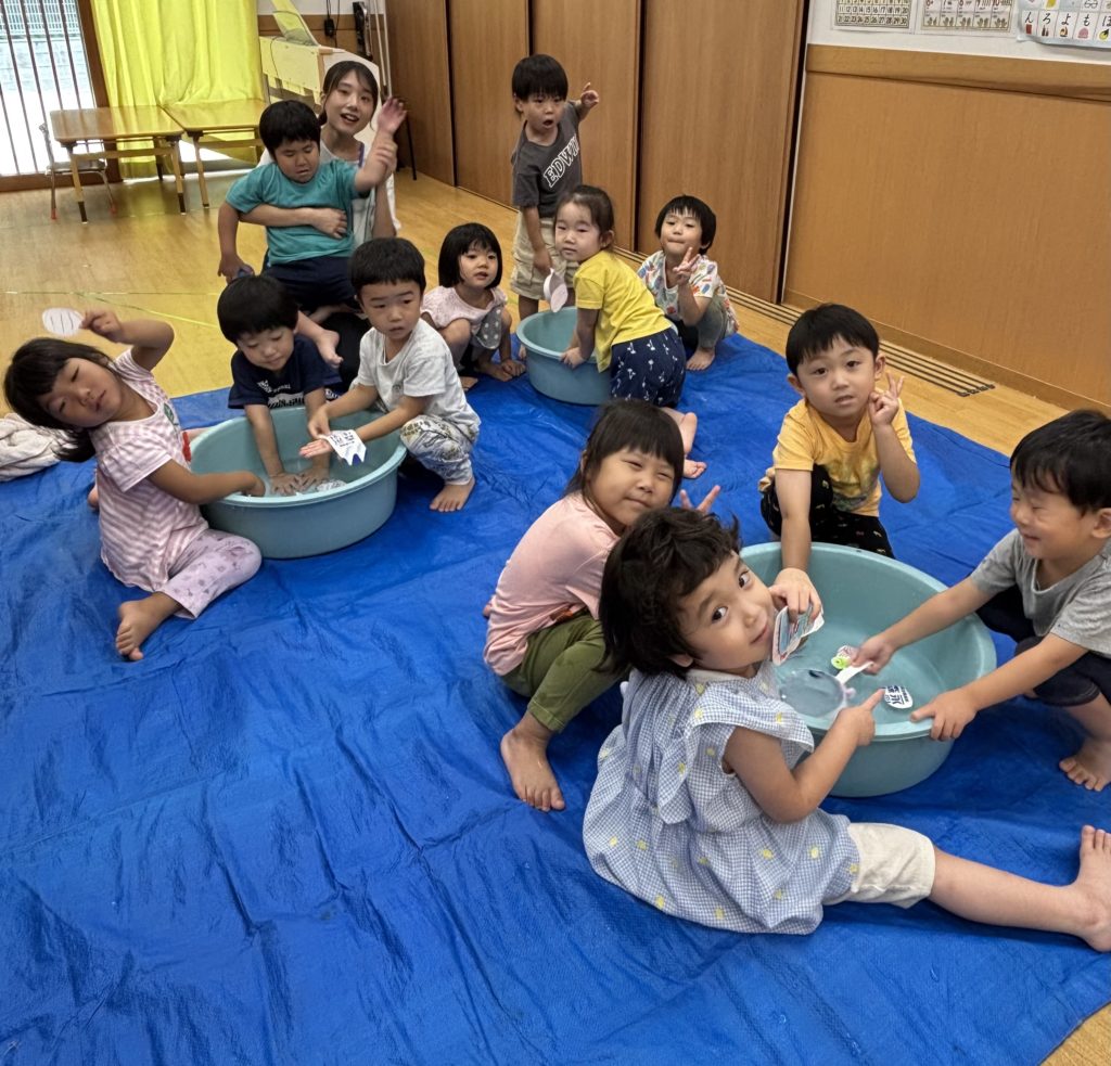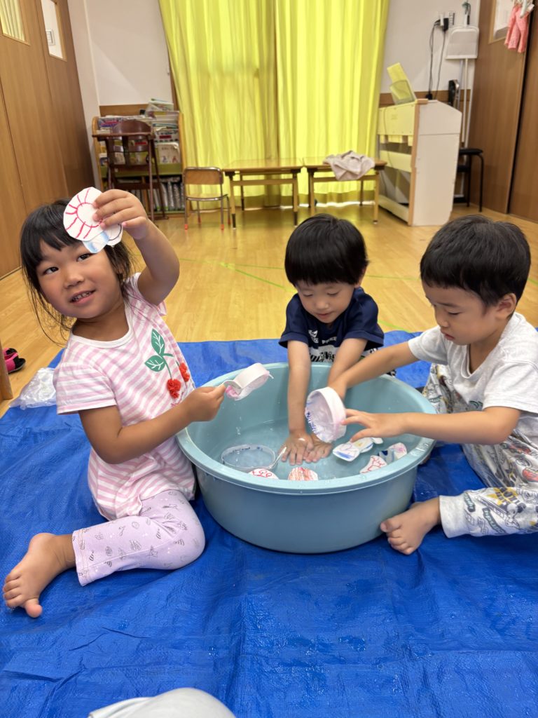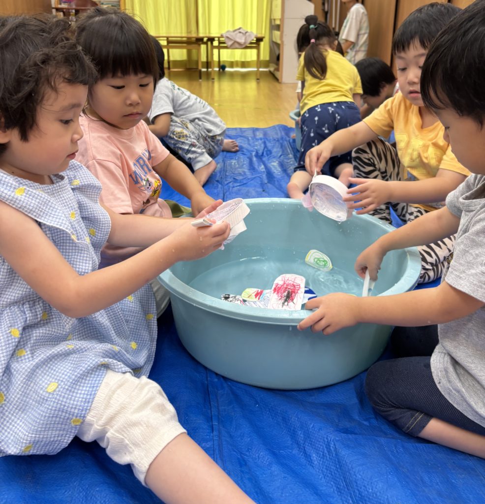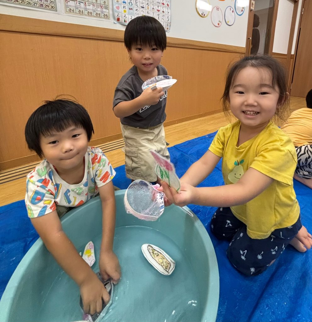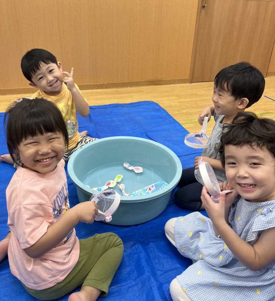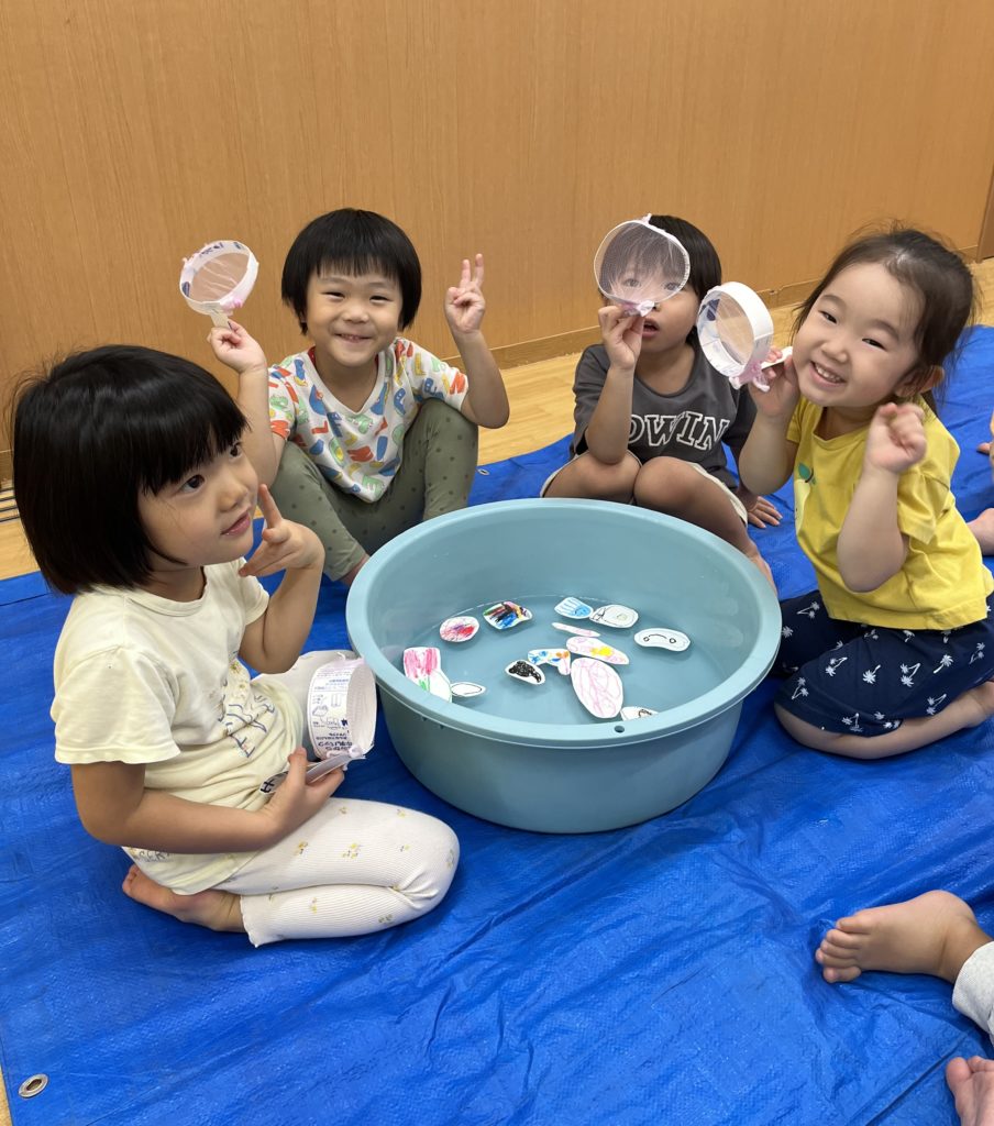 少しでも涼を感じられるよう、みんなでお魚すくいをしました。クレヨンで海の生き物を描き、水に泳がせて(浮かせて笑😆)、すくって楽しみました❣️