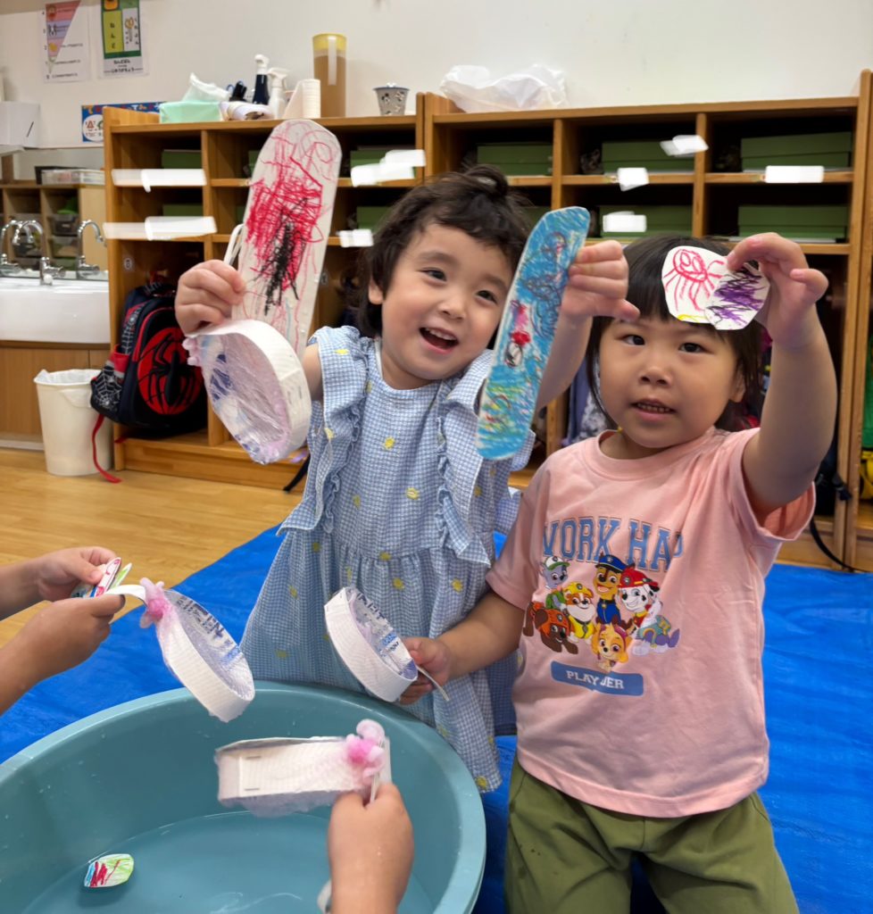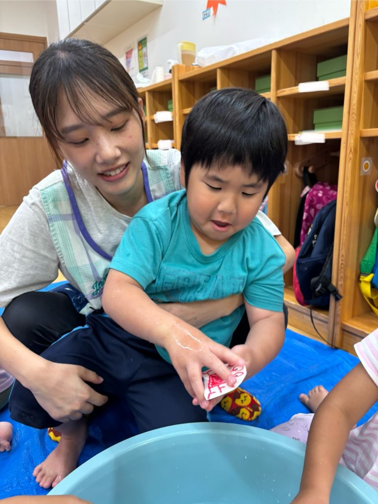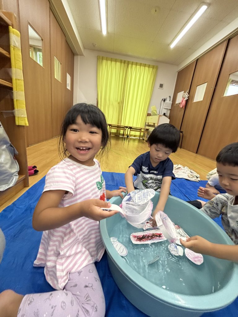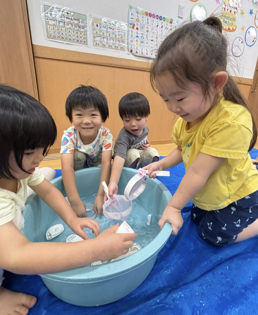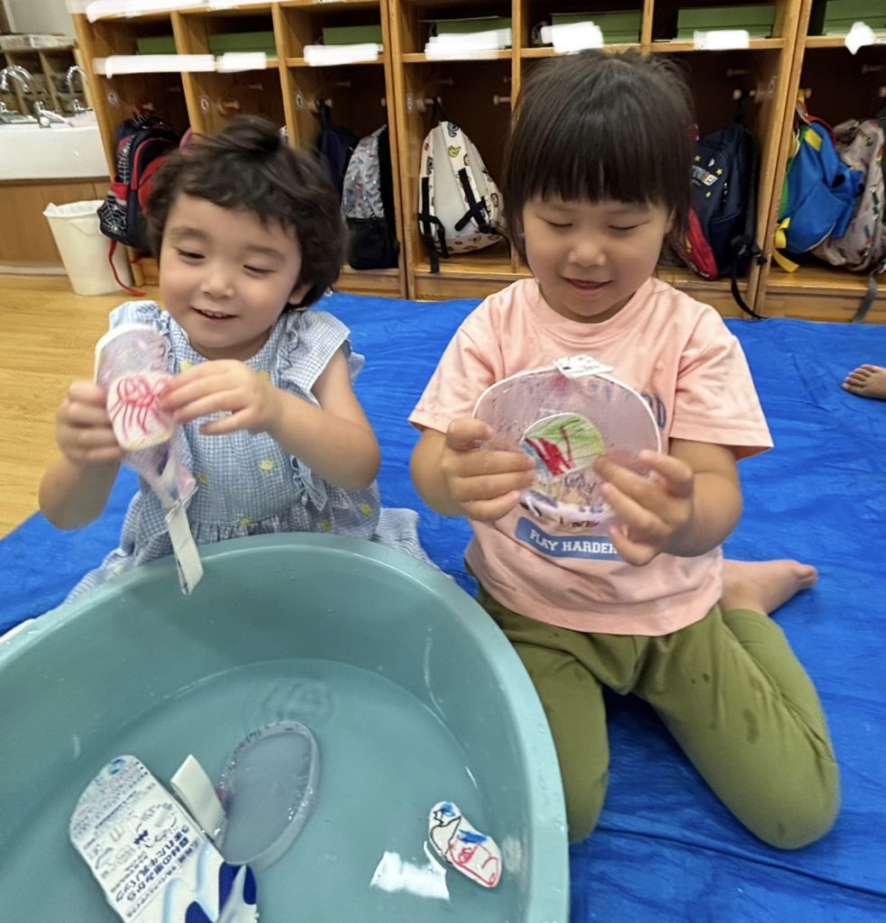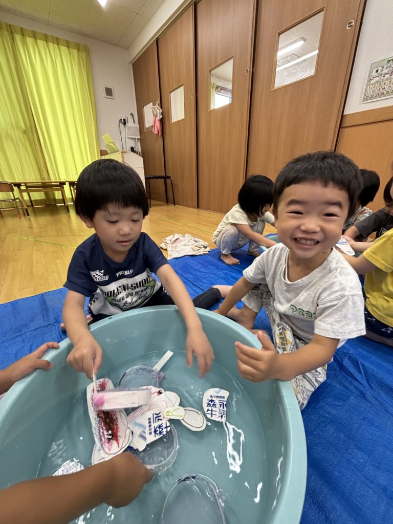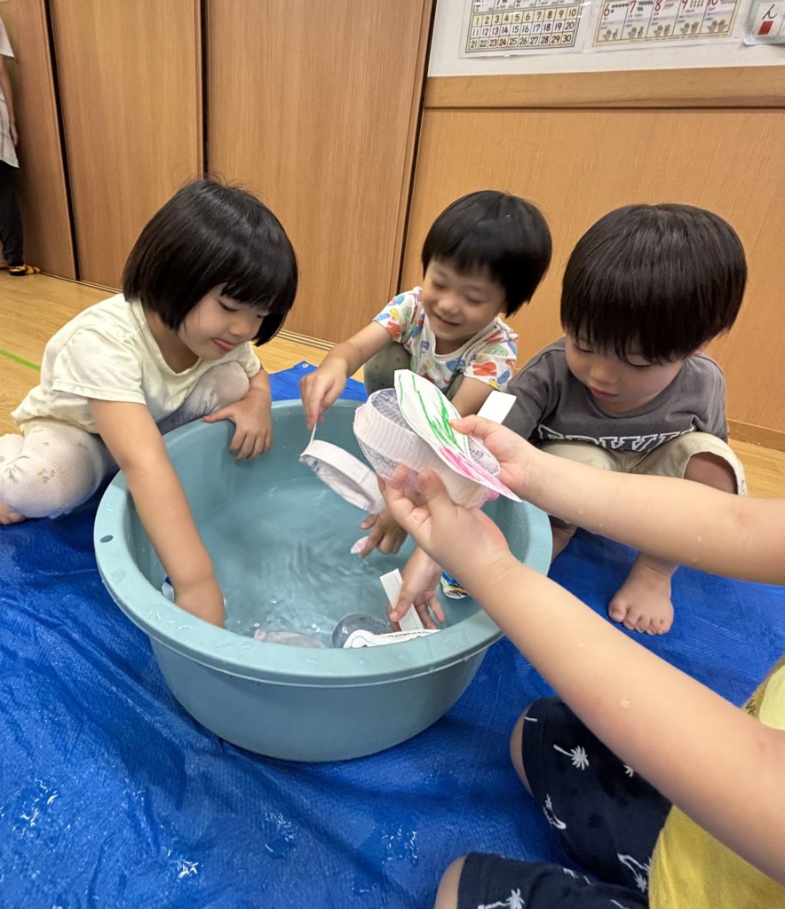 少しでも涼を感じられるよう、みんなでお魚すくいをしました。クレヨンで海の生き物を描き、水に泳がせて(浮かせて笑😆)、すくって楽しみました❣️