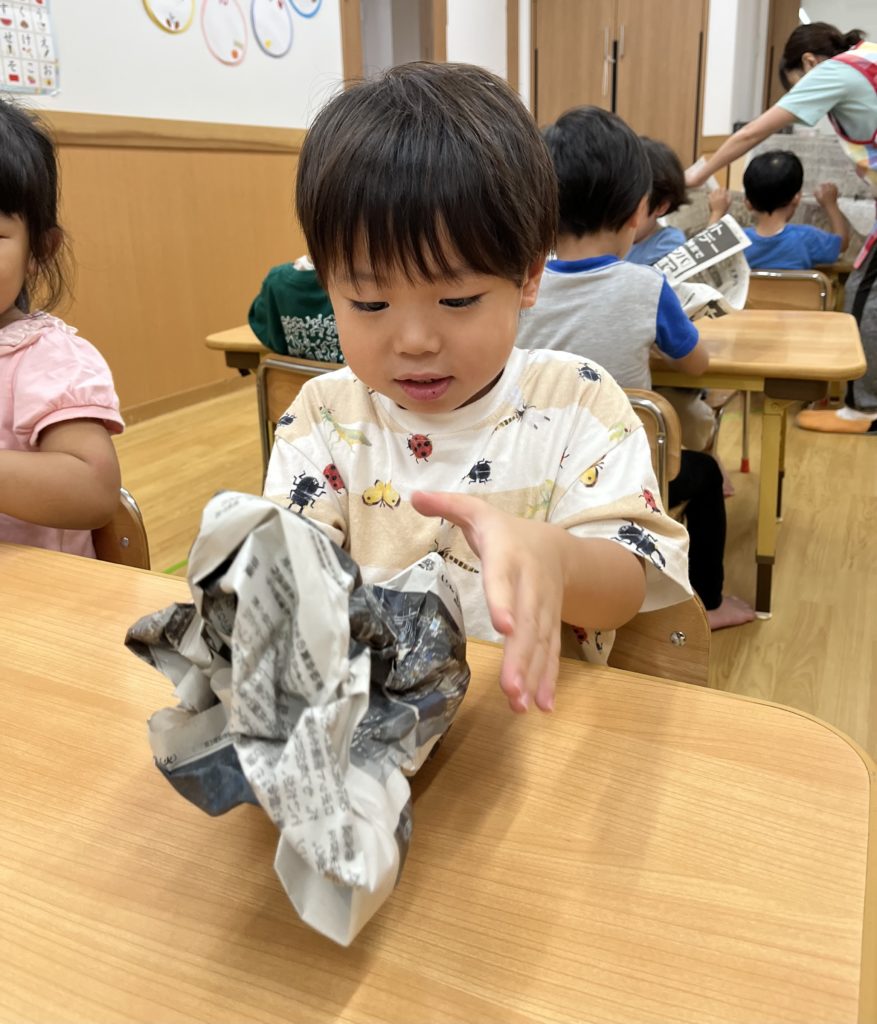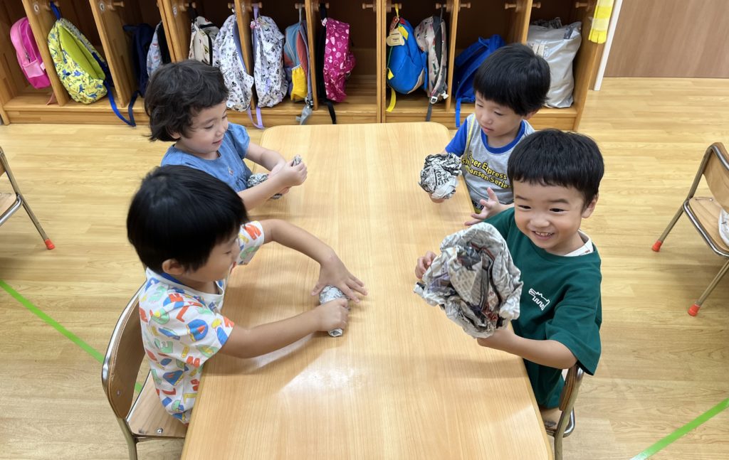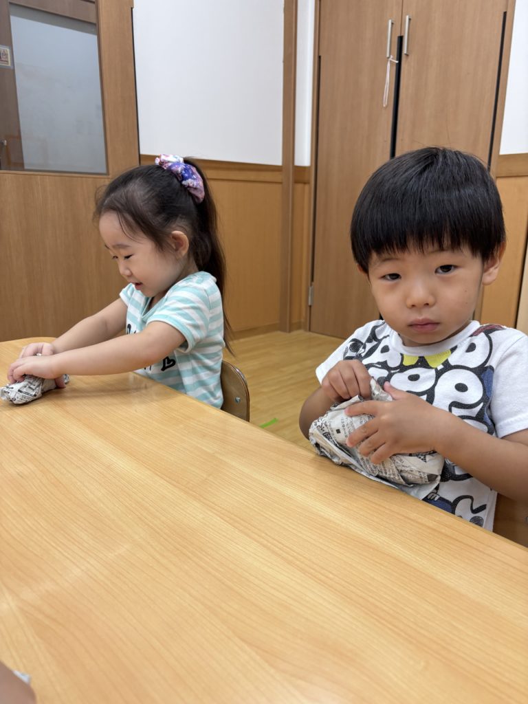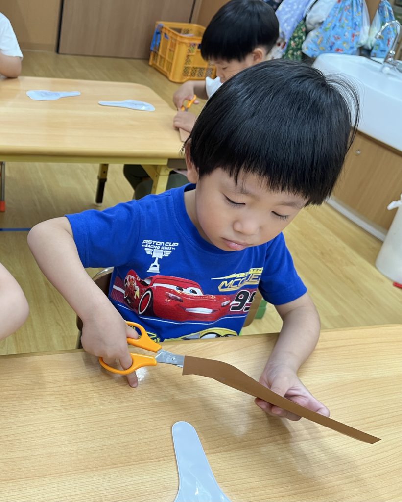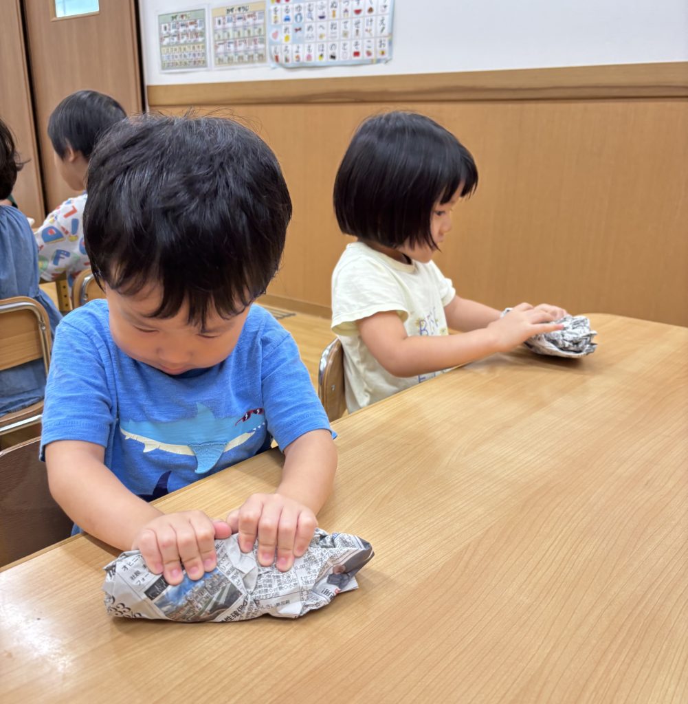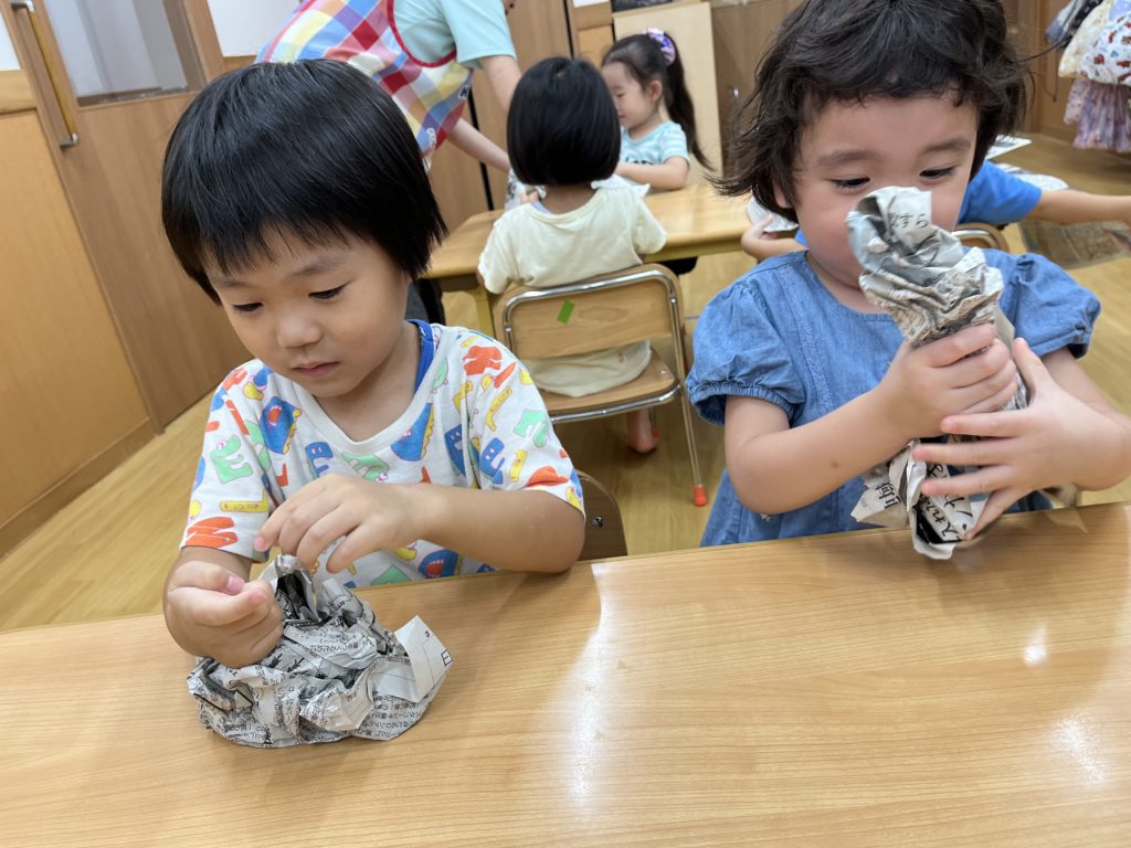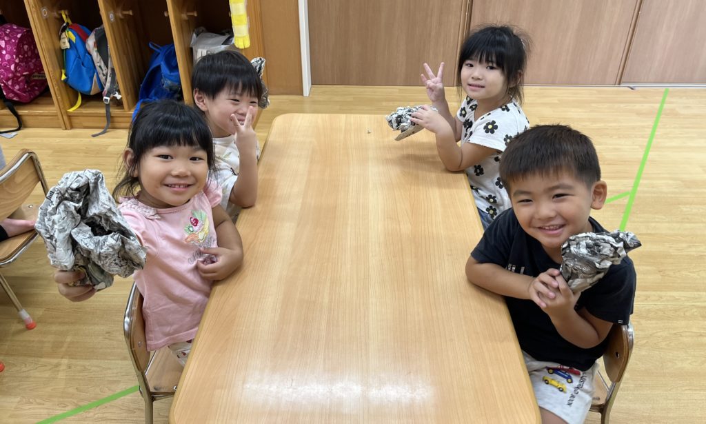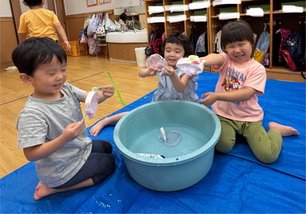 少しでも涼を感じられるよう、みんなでお魚すくいをしました。クレヨンで海の生き物を描き、水に泳がせて(浮かせて笑😆)、すくって楽しみました❣️