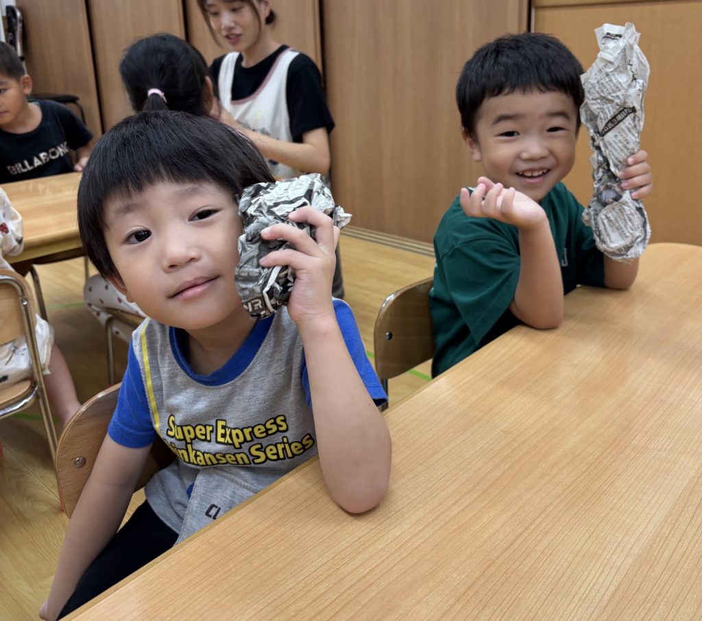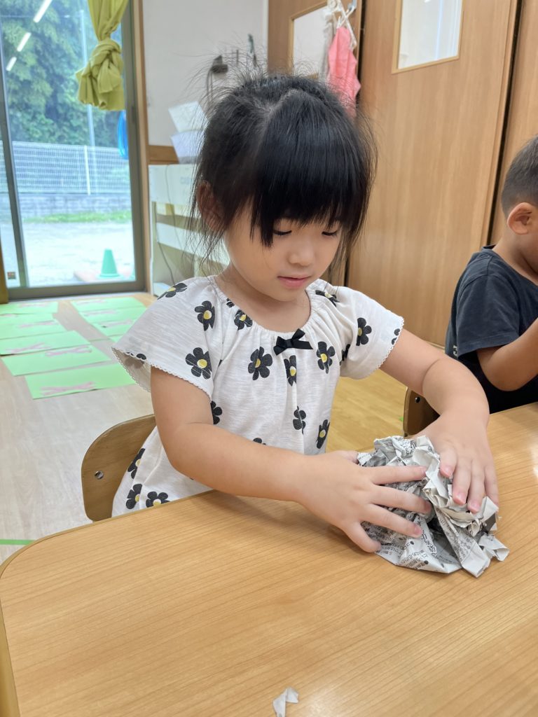 さつまいも形に丸めた新聞紙に今度、色🍠をつけていきます!
