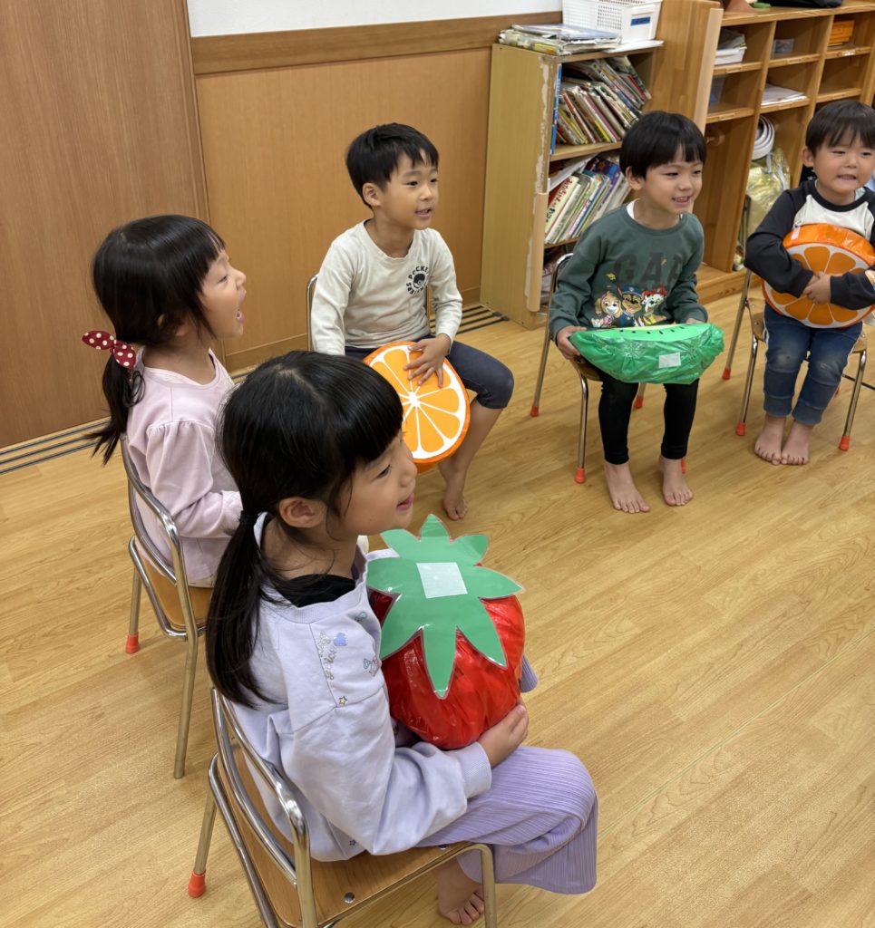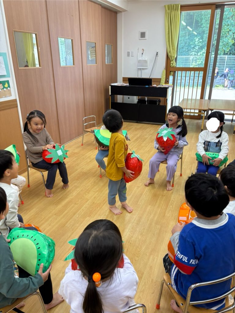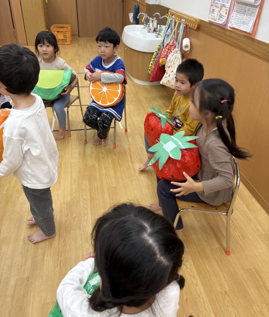 運動会の障害物リレーで使ったフルーツを使って、みんなでフルーツバスケットをしました!大きなフルーツを持って歩くいるか組さん!とても可愛らしかったです💕