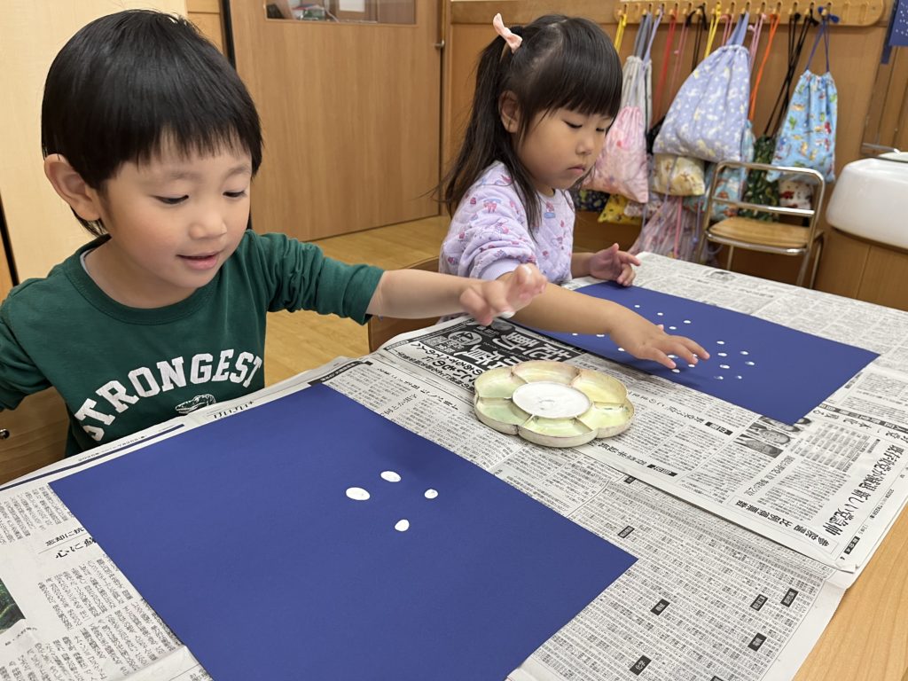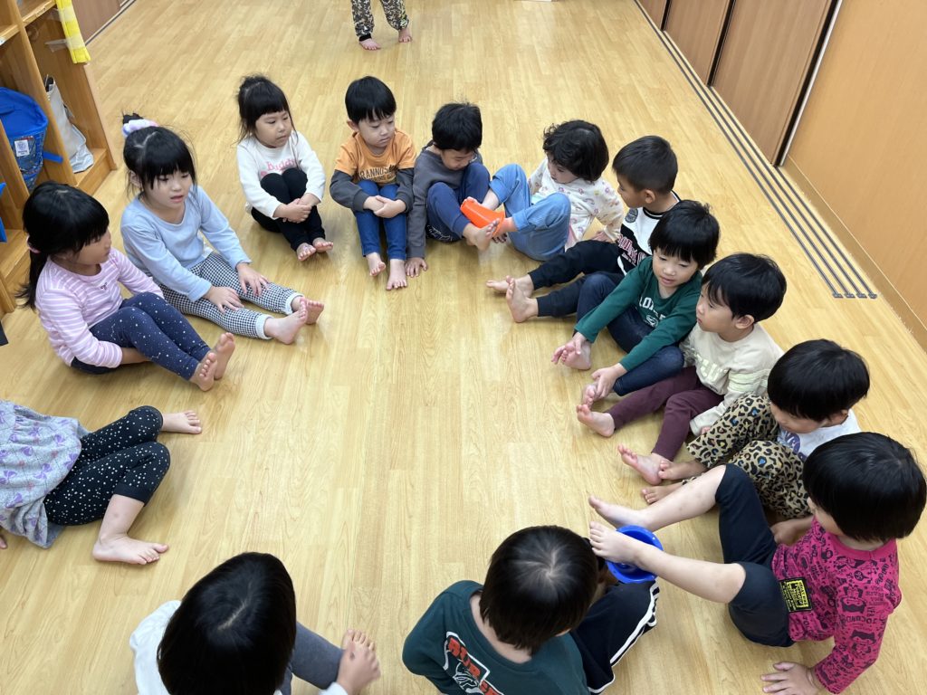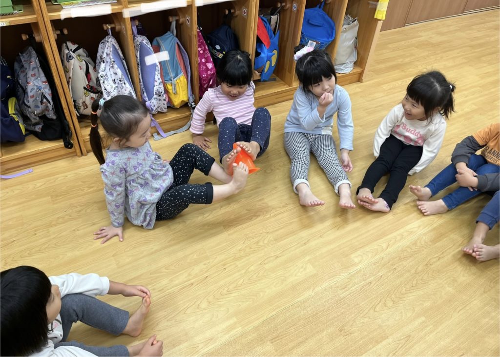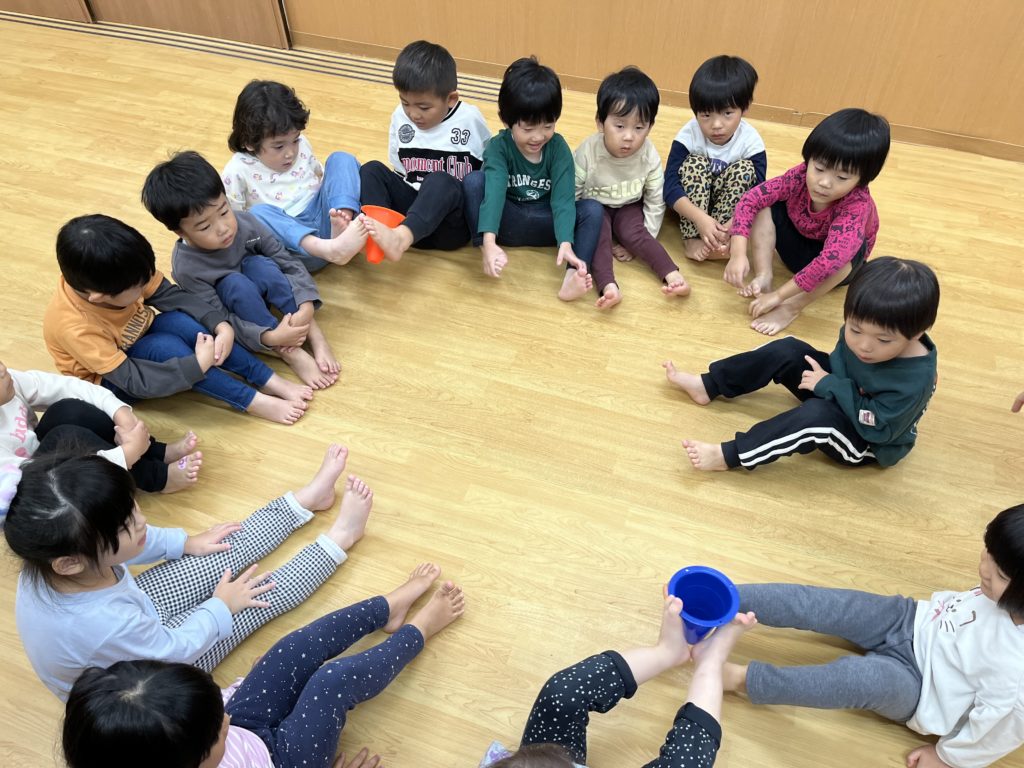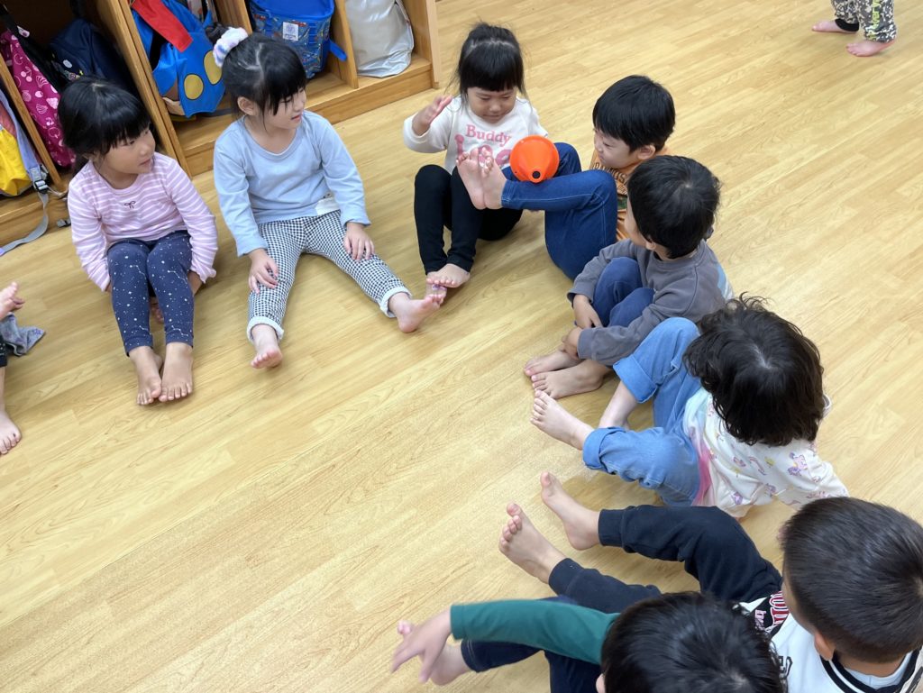 足を使ってお友だちへのパスゲームでは、運動能力を高めながら上手にパスをしていました😃