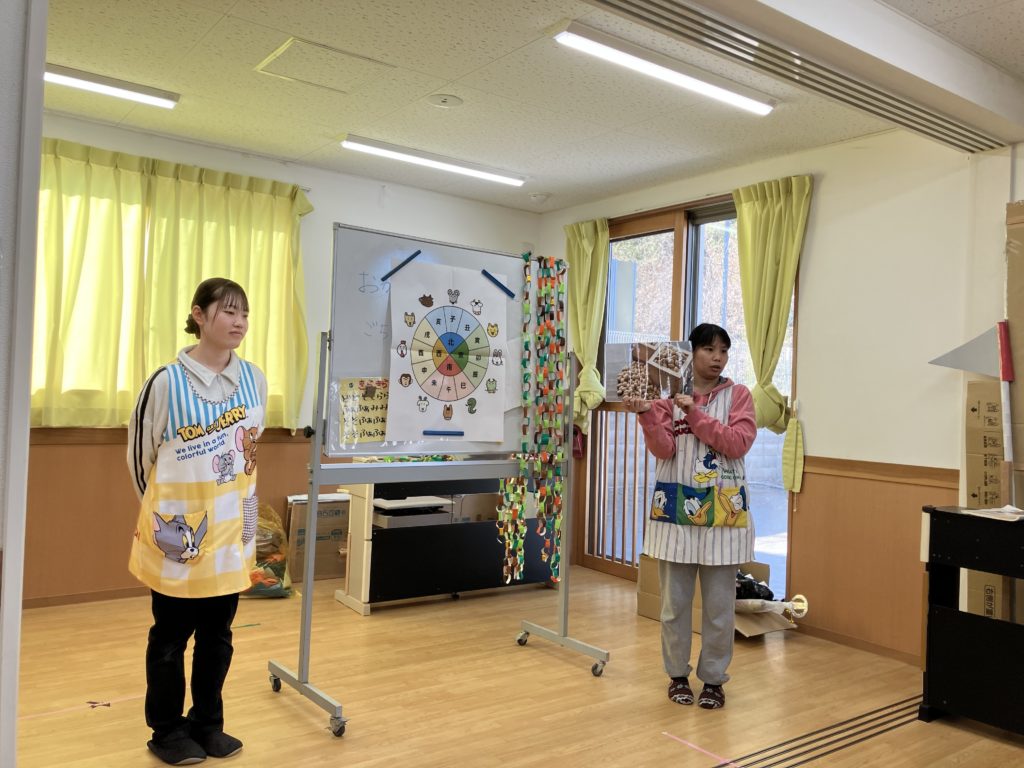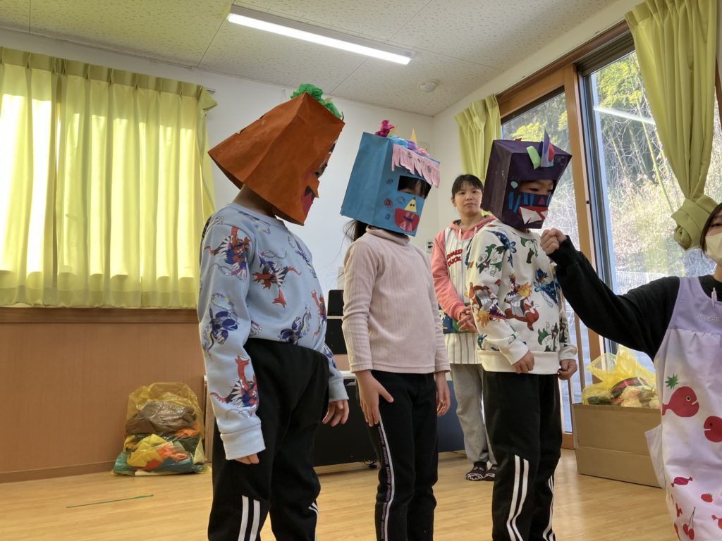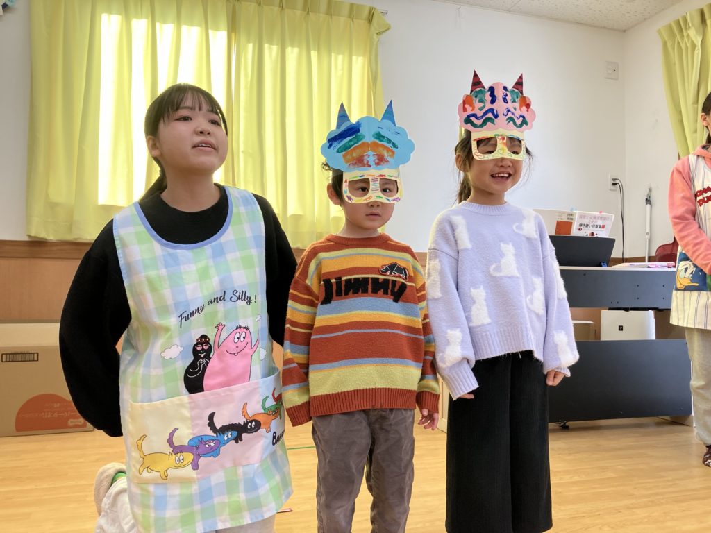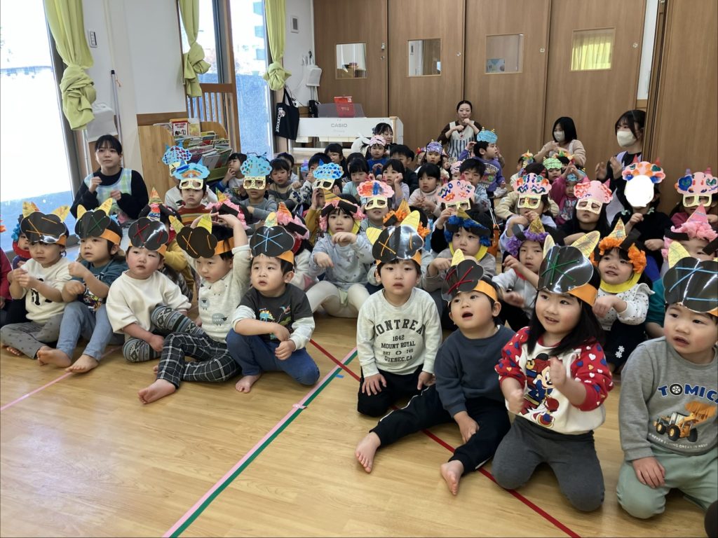 各クラスで作った鬼のお面をみんなの前で紹介したり、節分の歌やクイズを楽しみました😊
