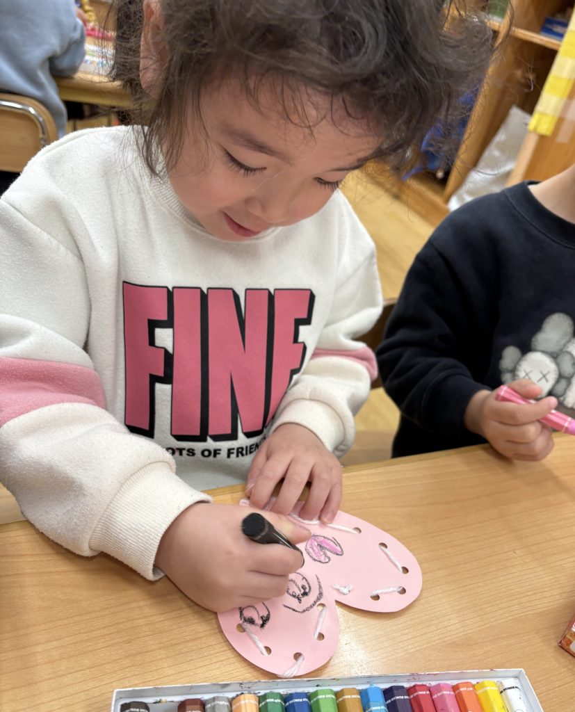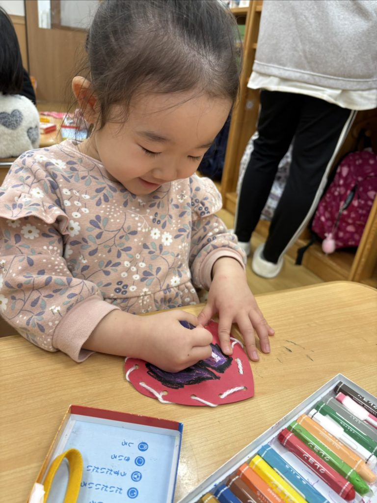 紐通しが終わると、クレヨンを使って色を塗ったり絵を描いたり、メッセージを書いているお友だちもいました🖍️