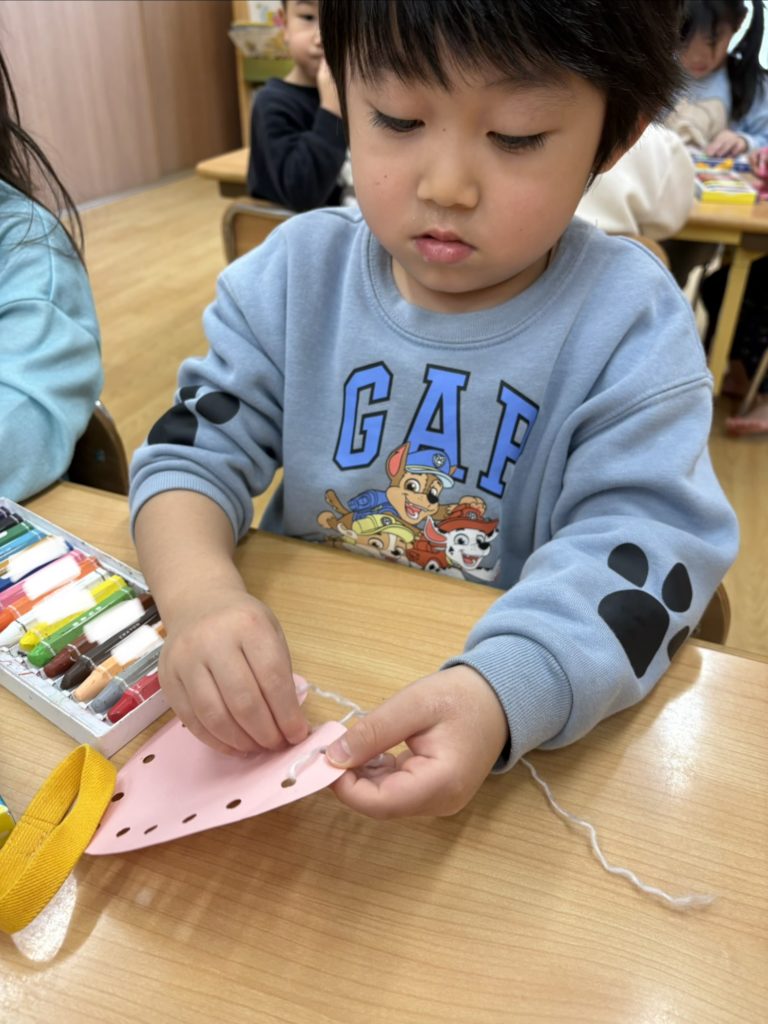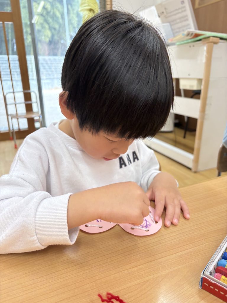 毛糸の色や紙の色も子どもたちが選び、ひも通しも「難しいなぁ」と言いながらもどこの穴に通せばいいのか考えながら頑張っていました!