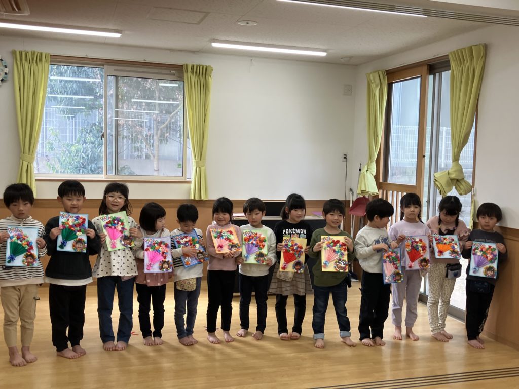 乳児クラスのお友達がくしゃくしゃにしたお花紙を幼児クラスのみんなが花束にしてくれました💐