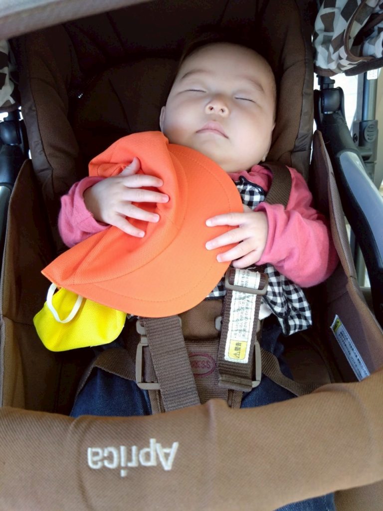 帽子を抱っこして『おやすみなさい』