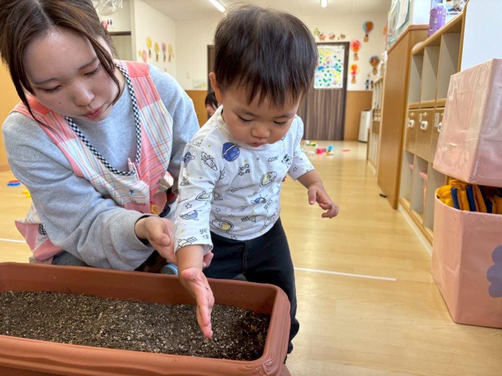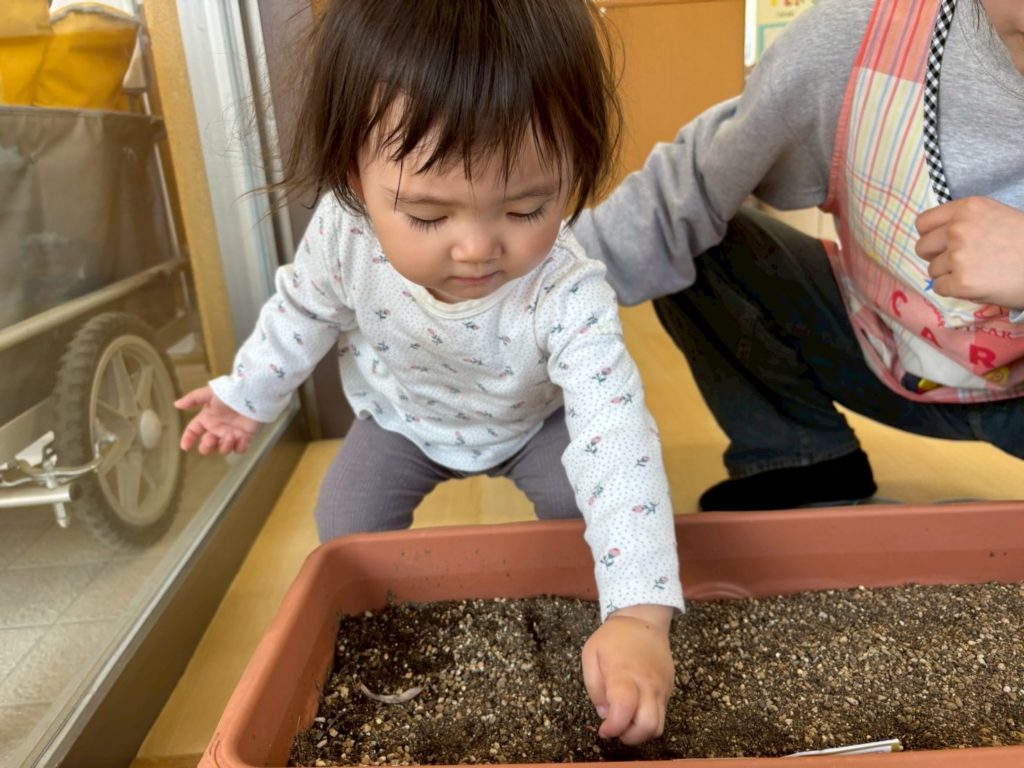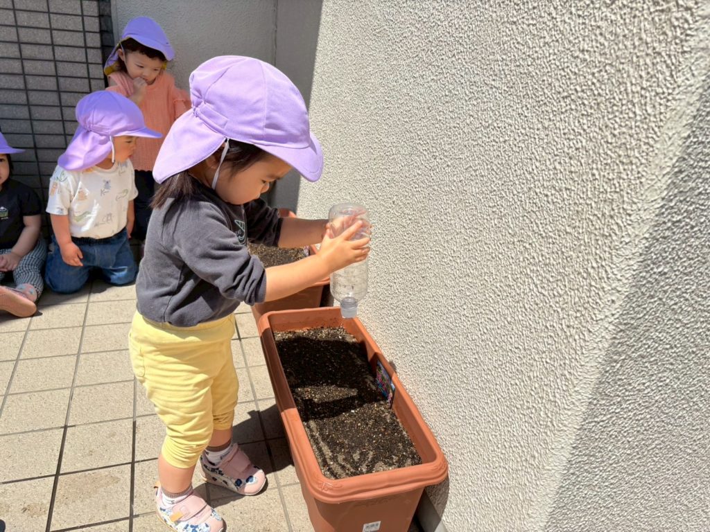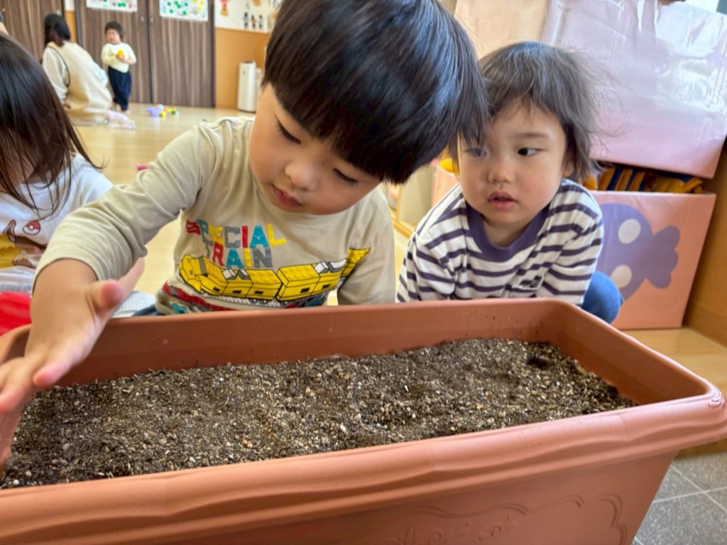 可愛く咲く“マリーゴールド”と製作でも活躍する“オクラ”を植えたよ。