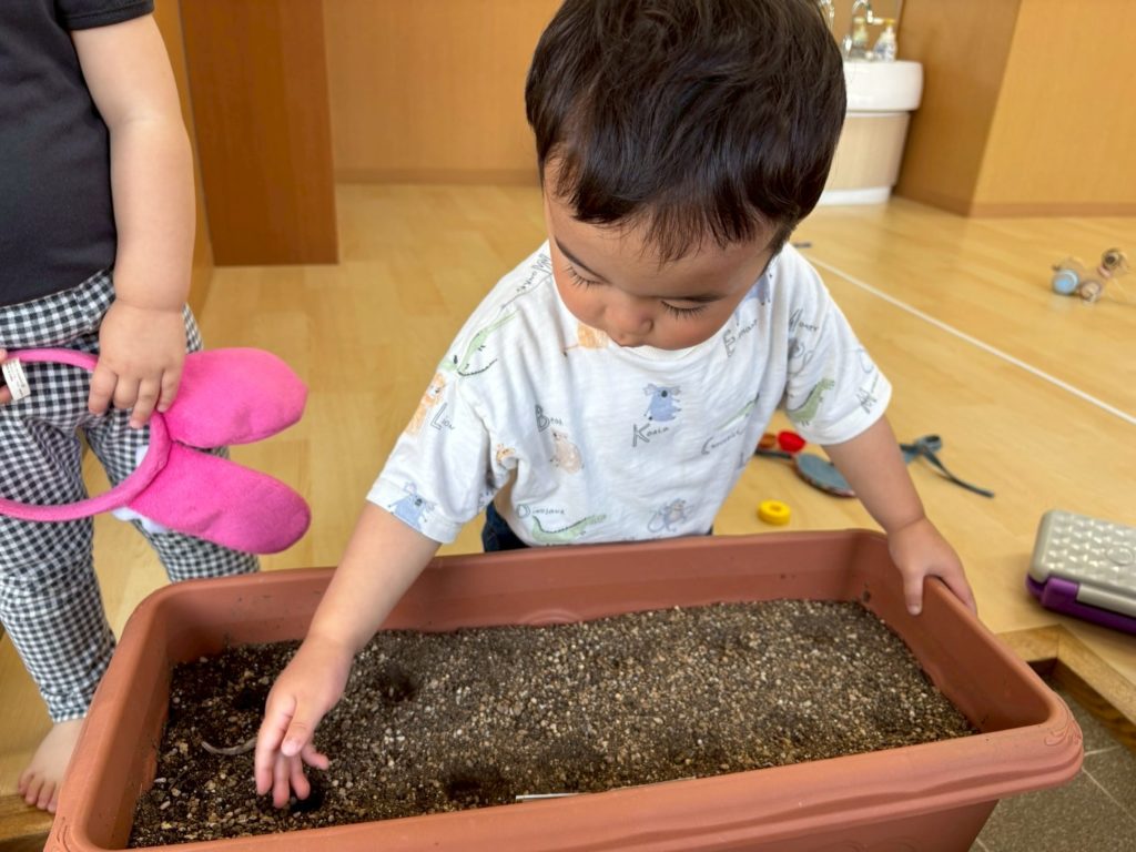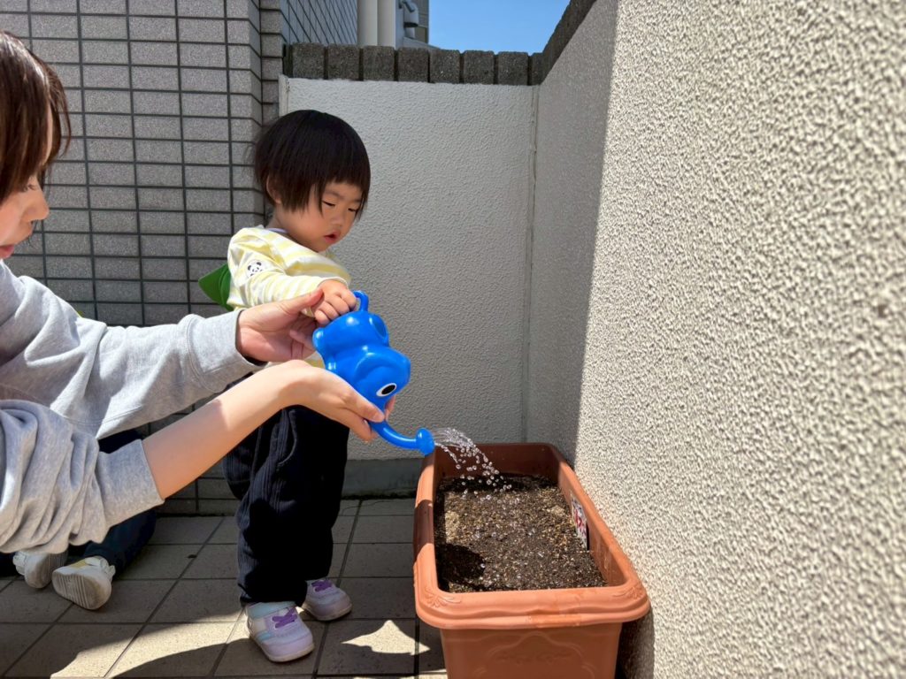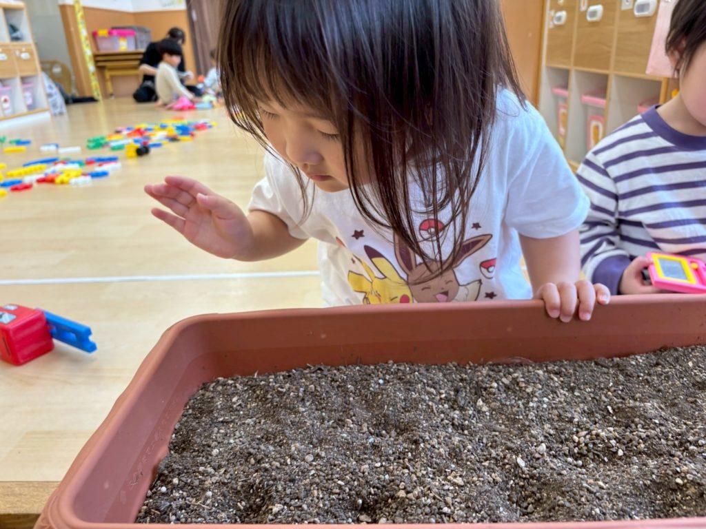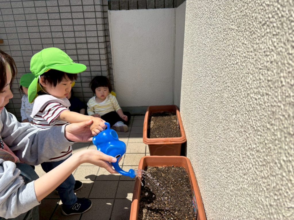 可愛く咲く“マリーゴールド”と製作でも活躍する“オクラ”を植えたよ。