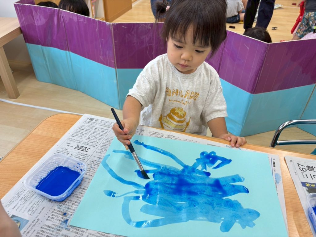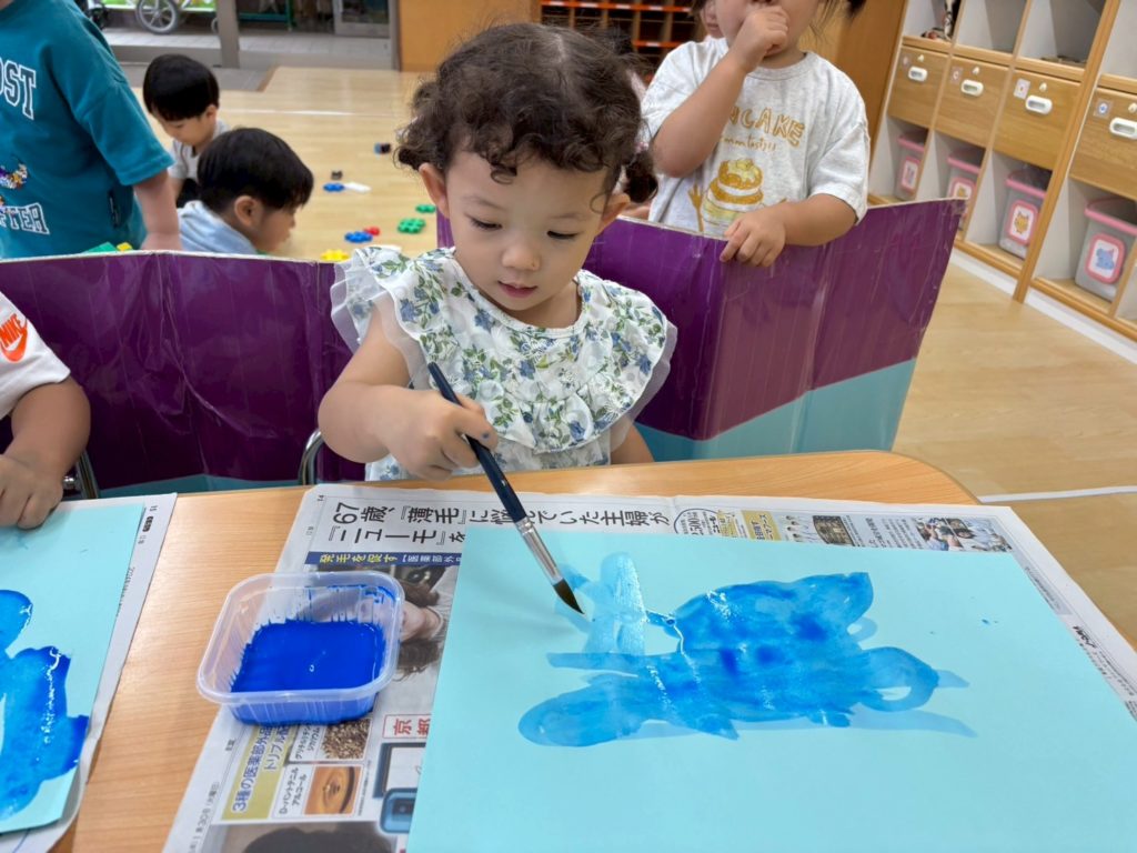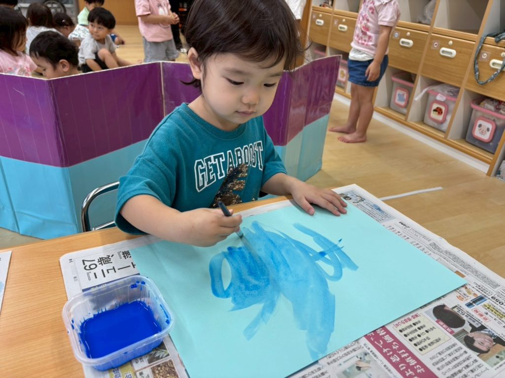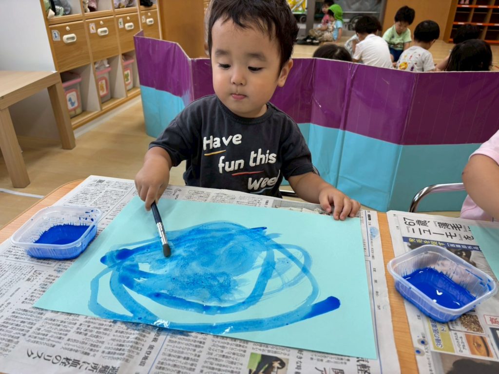 水色の画用紙に 青い絵の具でお絵描きをしたよ。