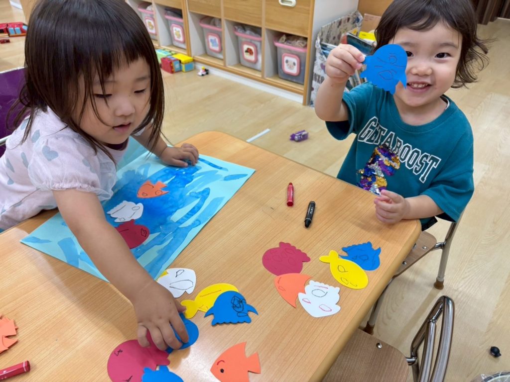 色とりどりの海の生き物たちが 元気いっぱい泳いでいる素敵な作品の出来上がり🌊