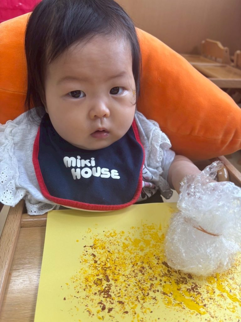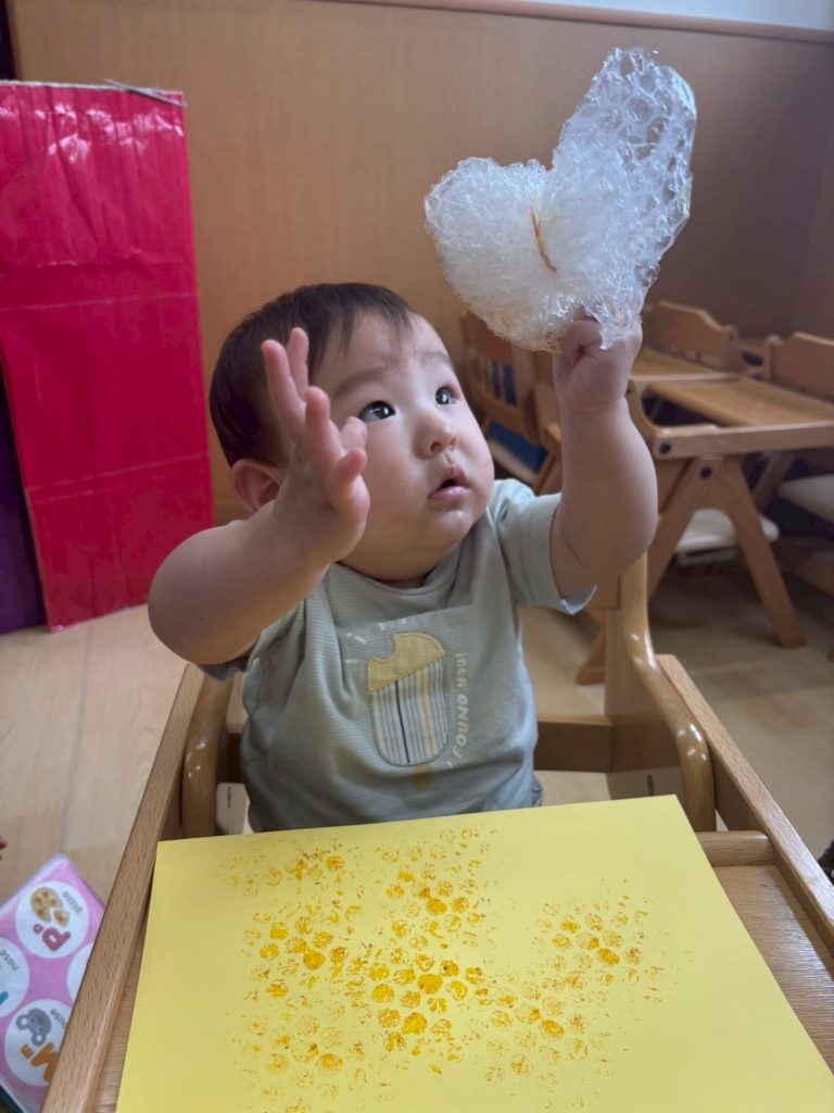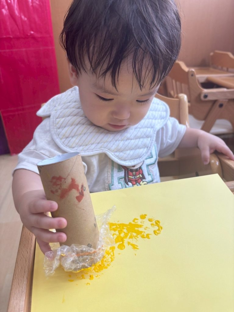 椅子に座って絵の具スタンプを楽しんだよ。
