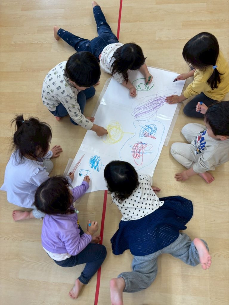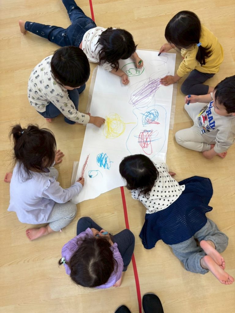 大きな紙をお友だち揃って囲んでお絵描きタイム。