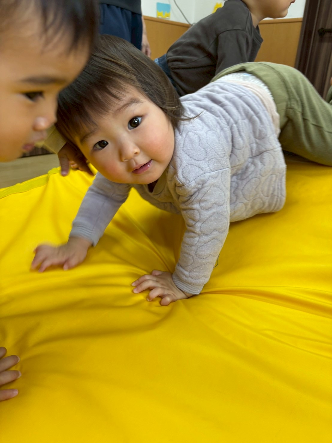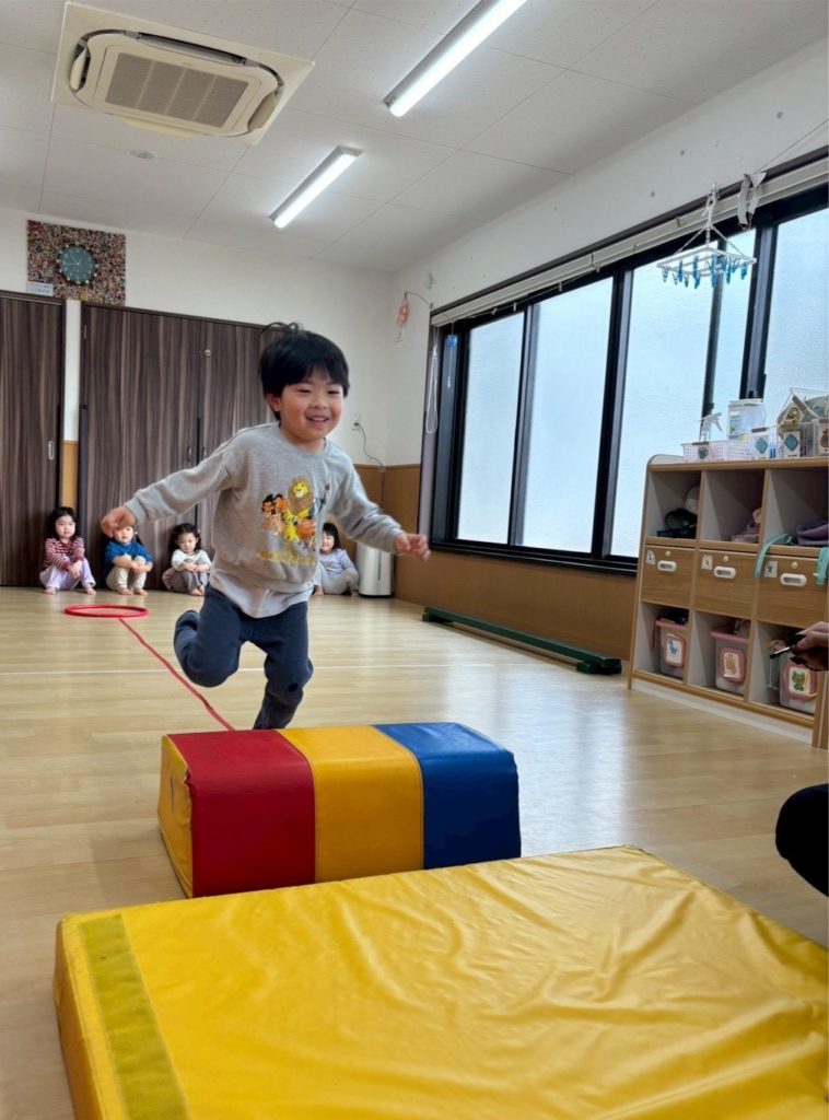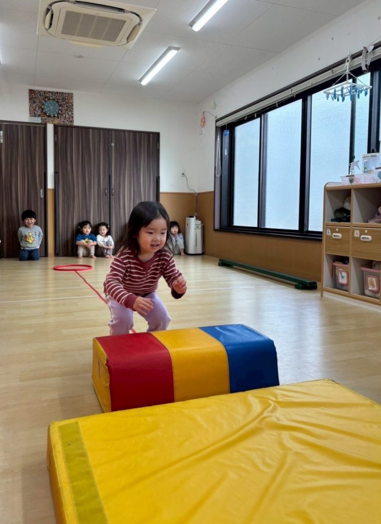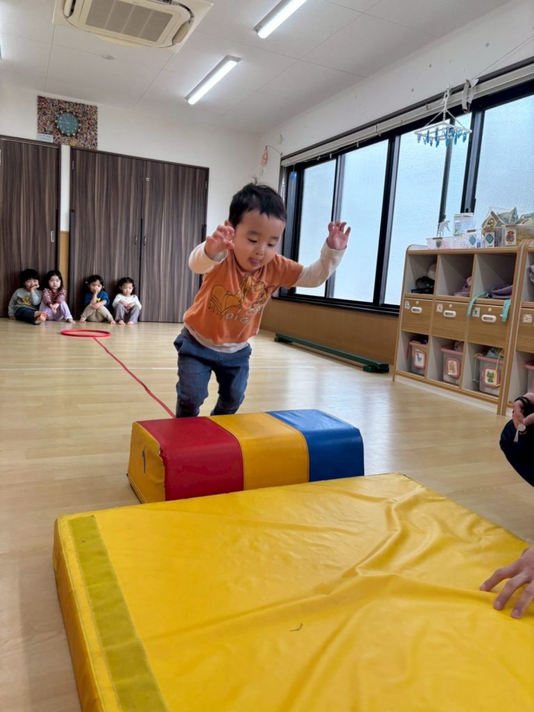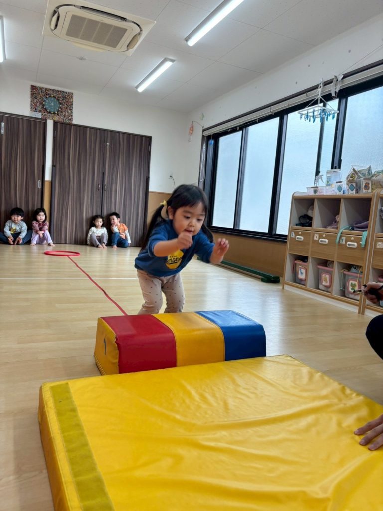 すっかり正課体育が大好きになったらっこ組のお友だち。 りくと先生とも仲良くなって にこにこ笑顔で溢れていますよ。 マットの坂。登り降りも速いよ。 平均台。落ちない