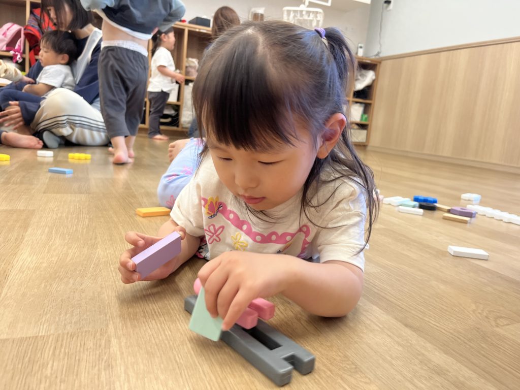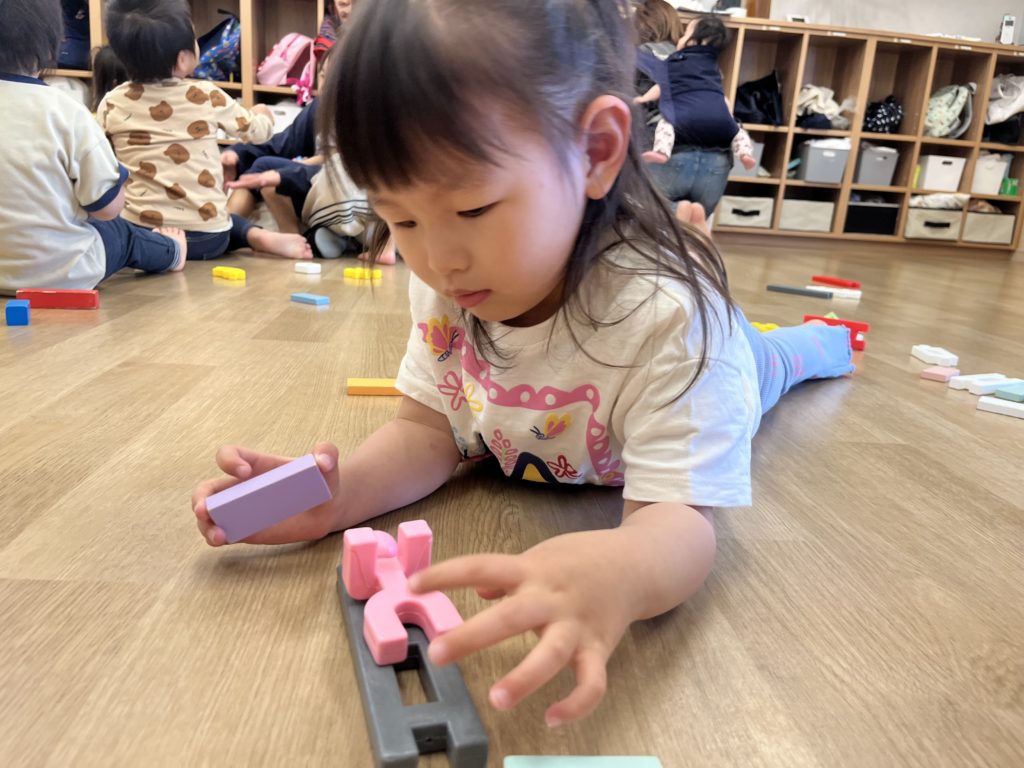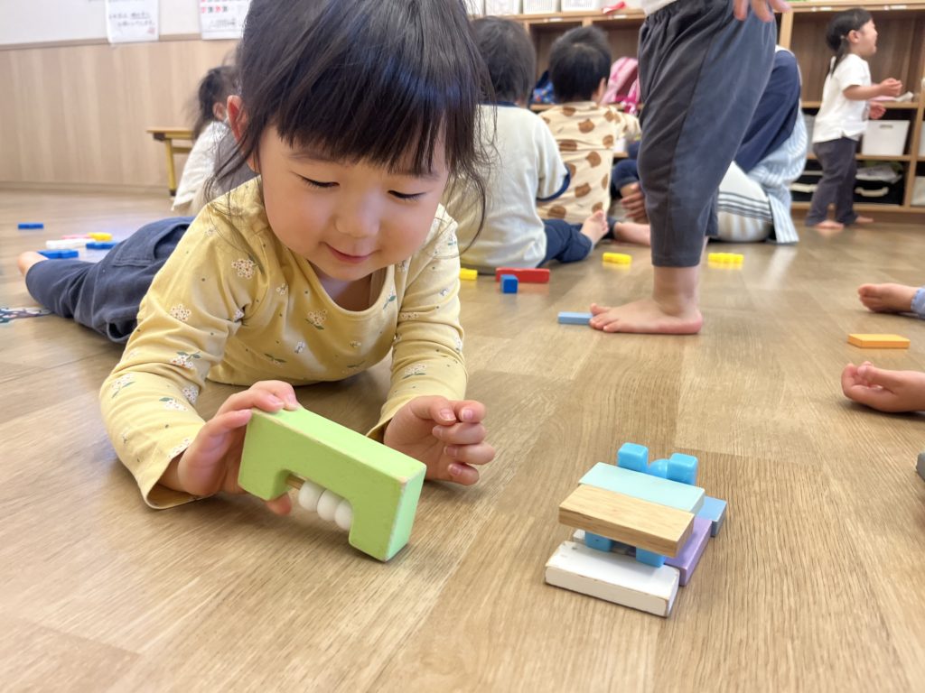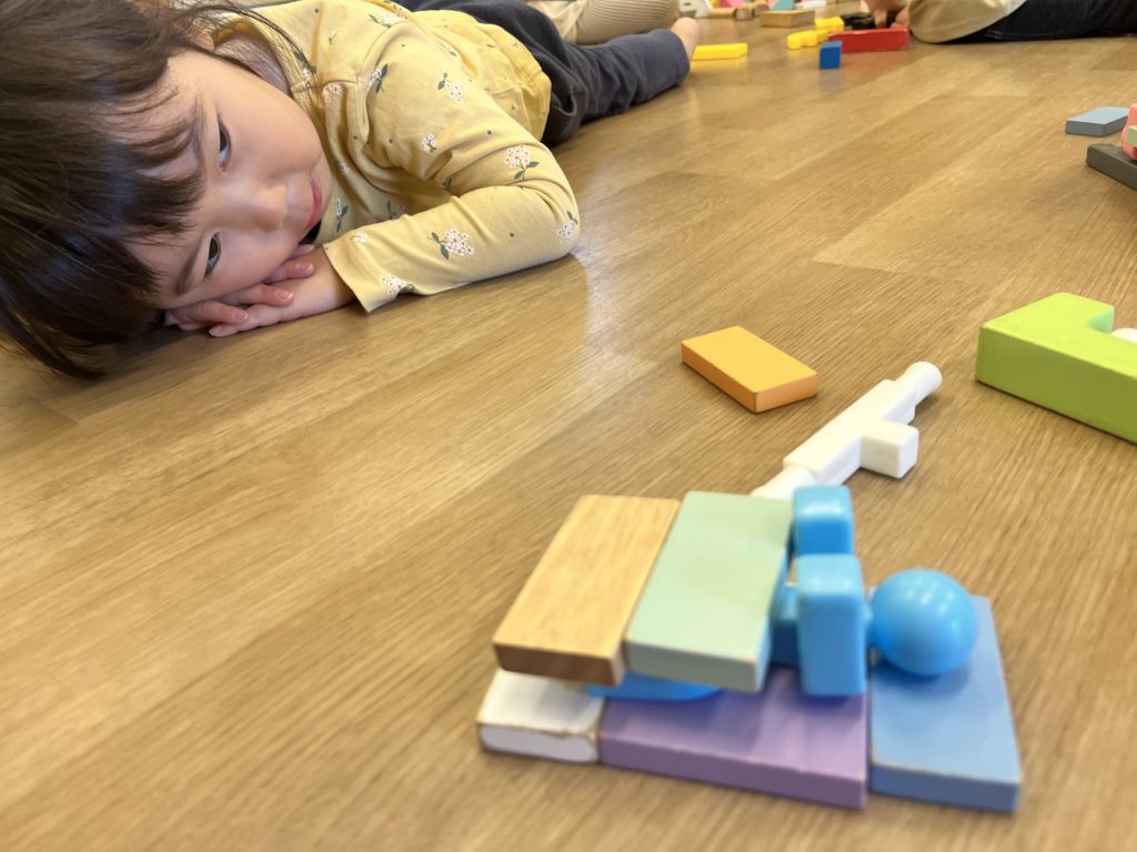 「せんせい、みてー!!ねんねしてるんだ!」積み木を使って、お布団できたよ💤